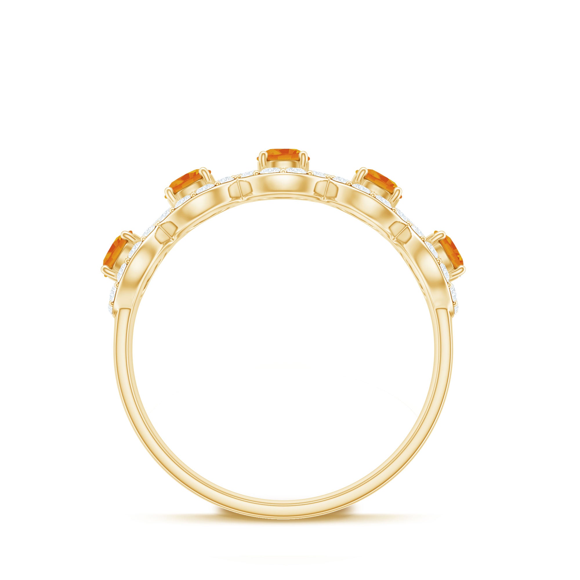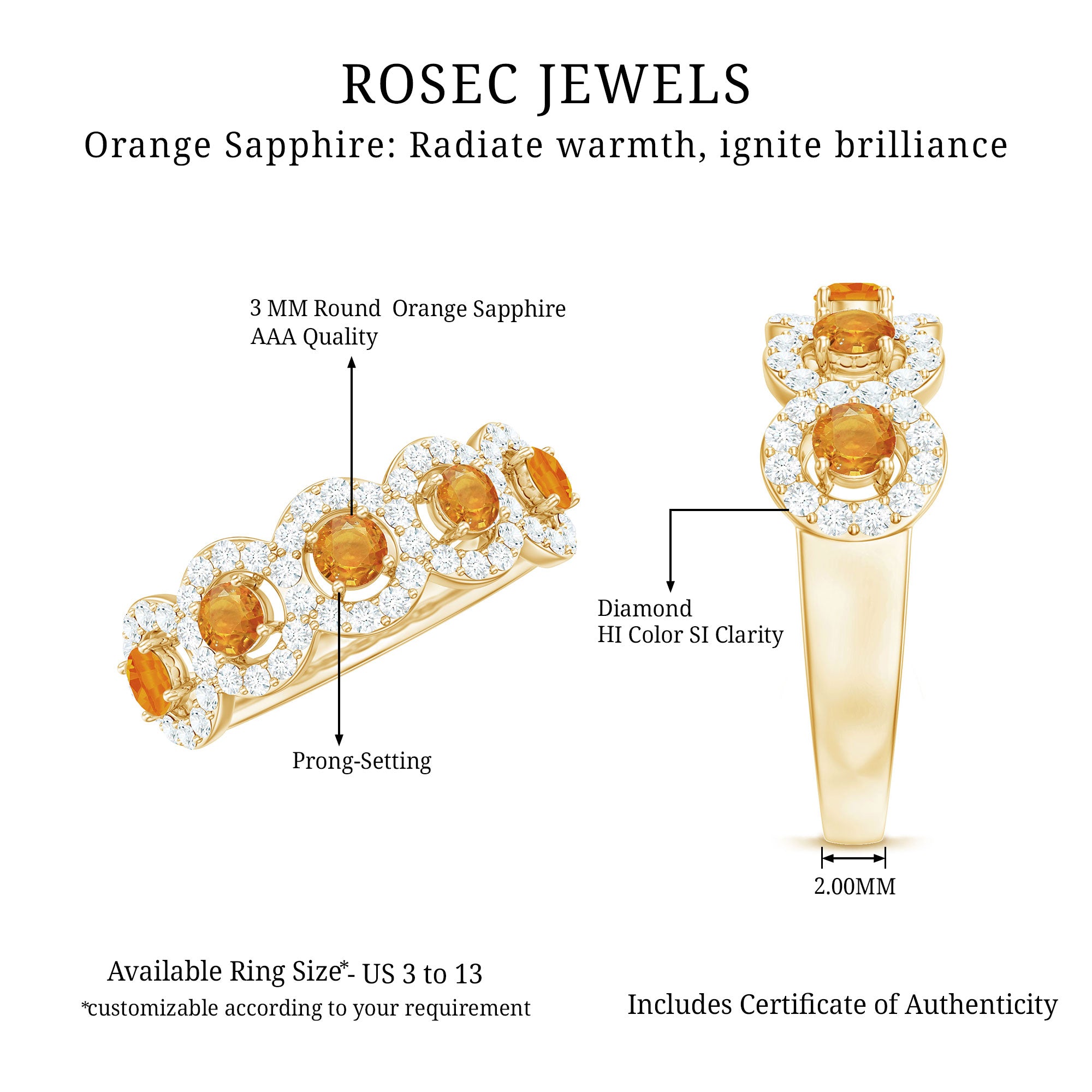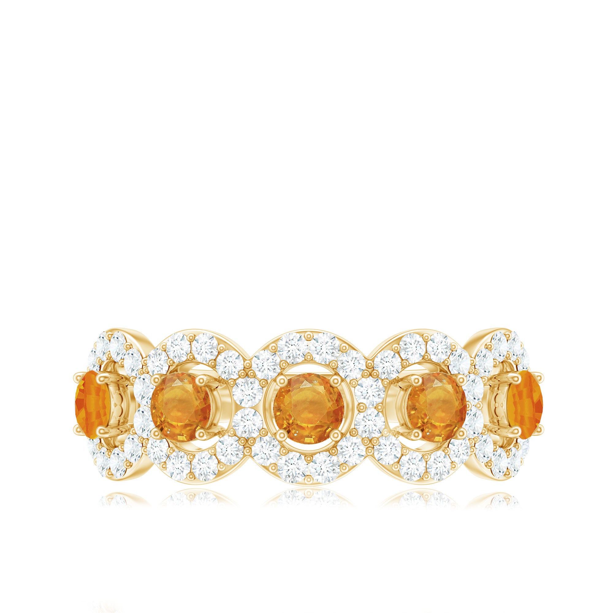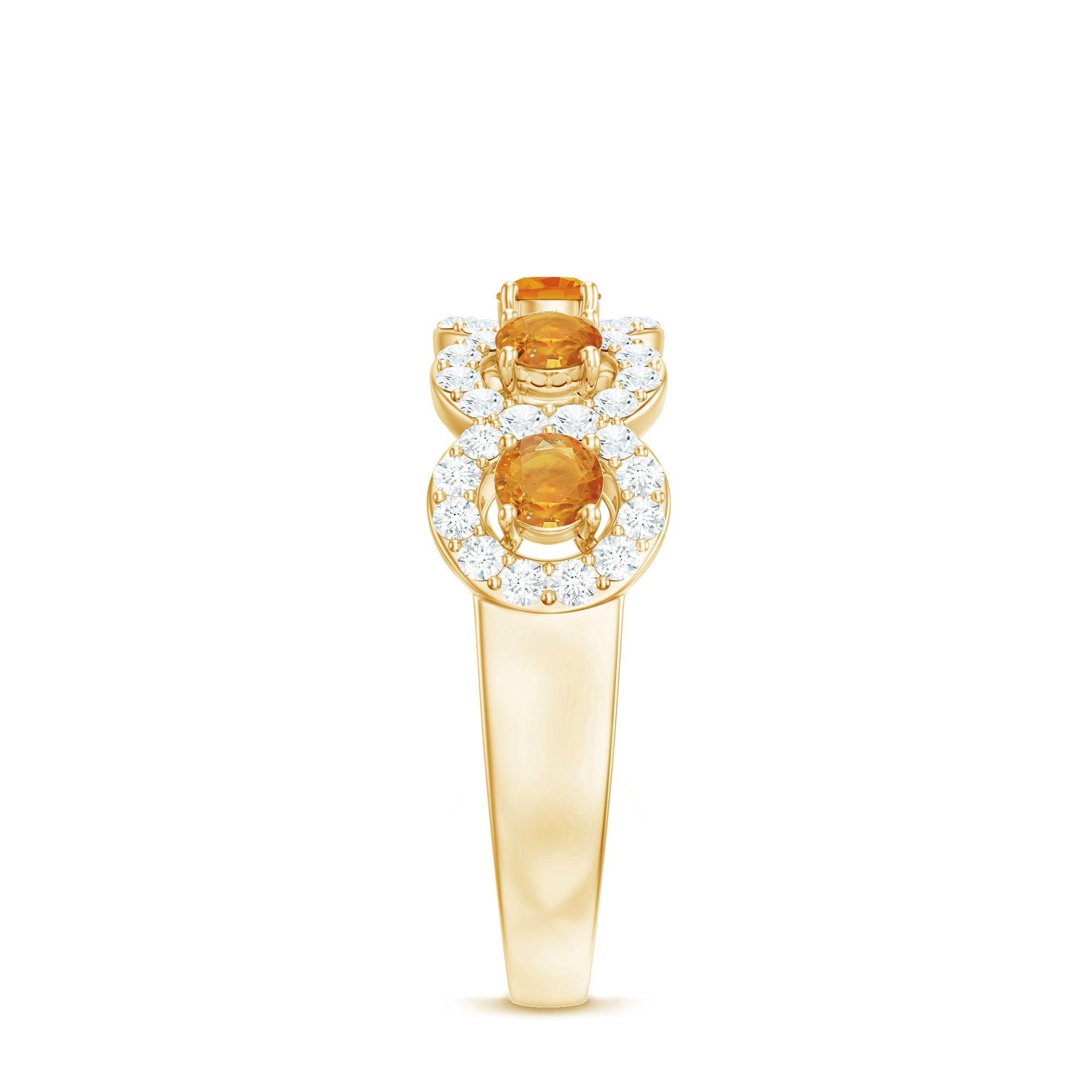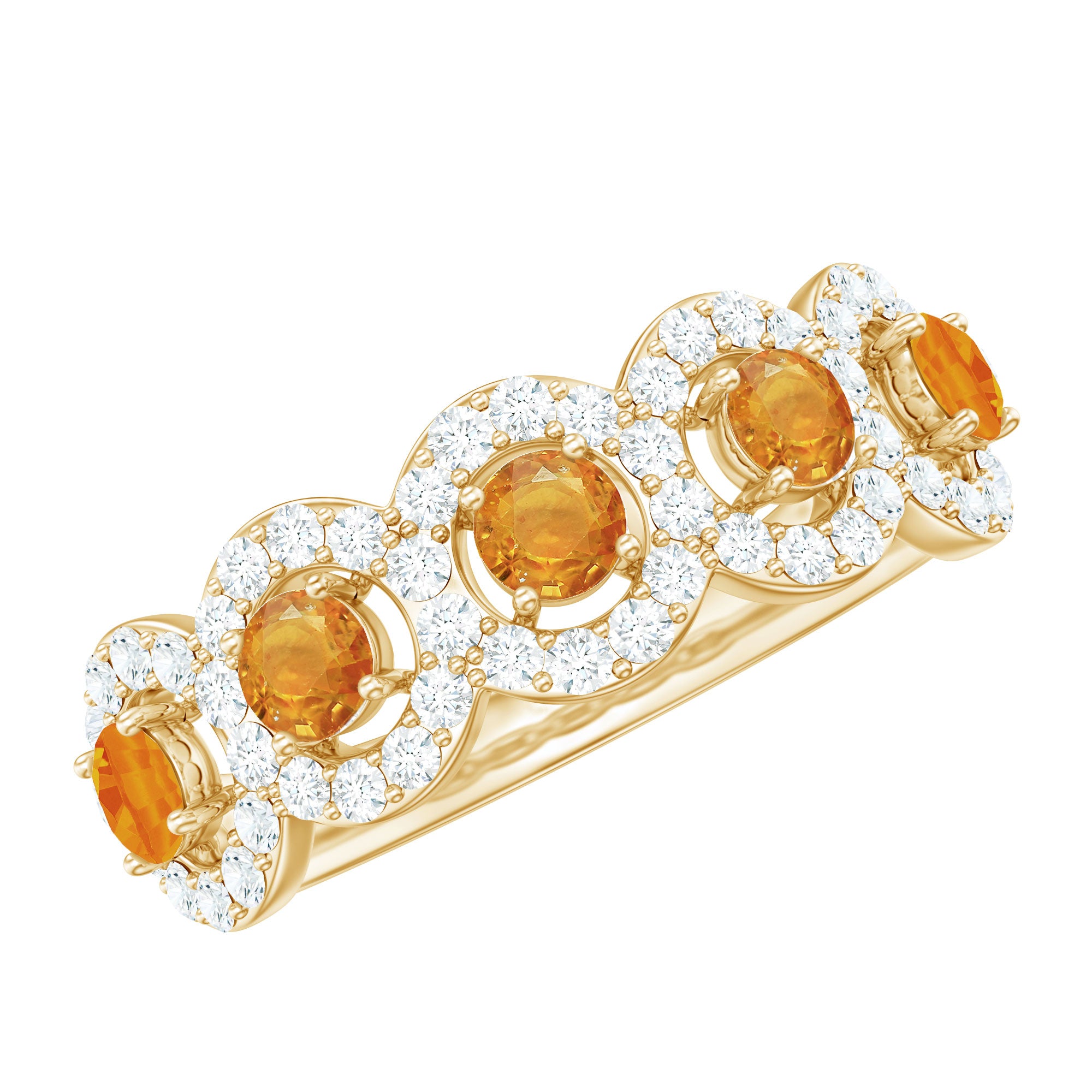Mark the special day of your life with this Classic Half Eternity Ring. This Semi Eternity Ring for Women is adorned with Round Shape Orange Sapphire in Prong Setting with Diamond Halo to make for a stunning choice for your beloved. Crafted with Solid Gold to give it a luxurious appeal.