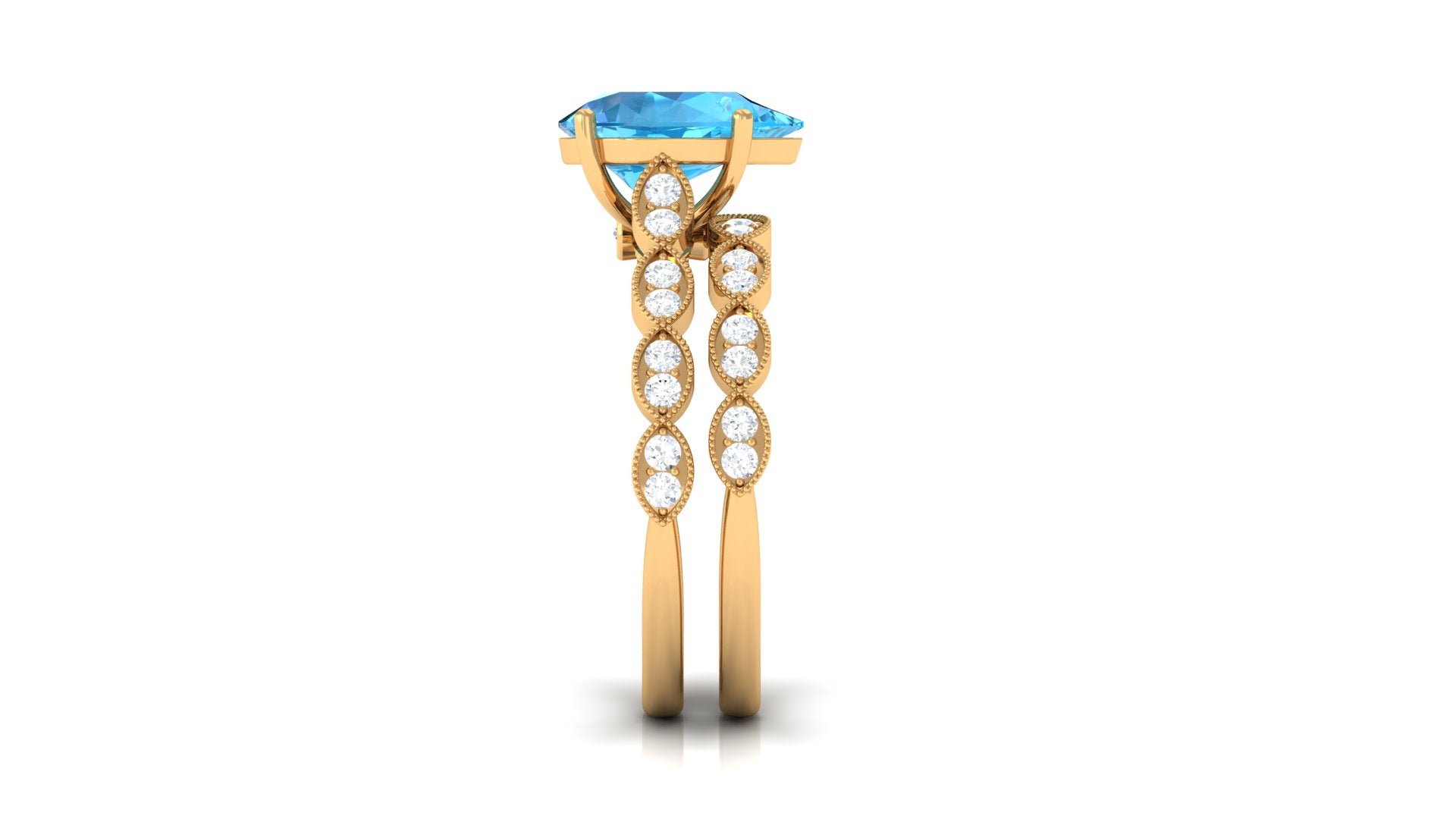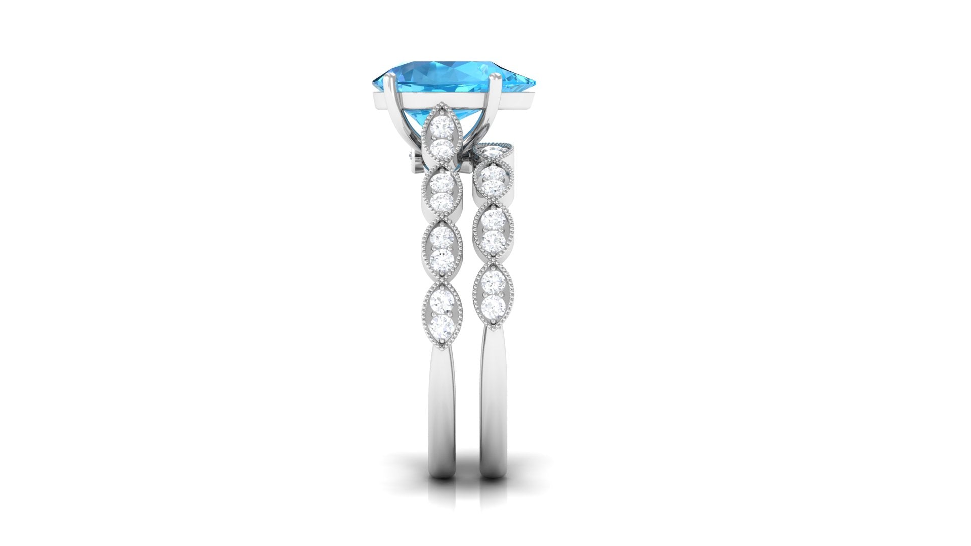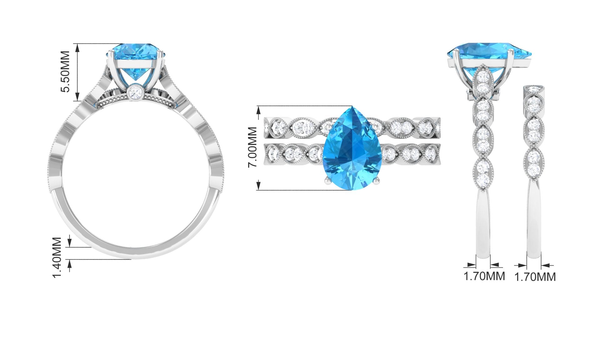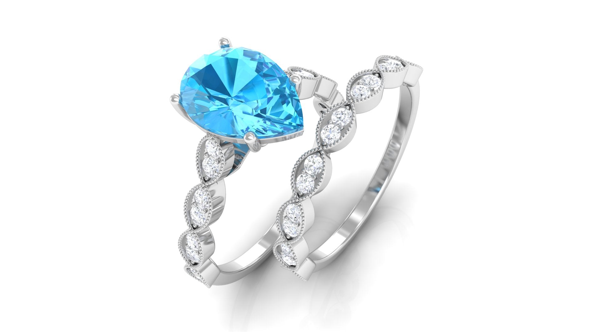 Win her heart when you present her with this Engagement Ring Set adorned with a 5X7 MM Pear Cut Swiss Blue Topaz Solitaire accentuated by round moissanite accents and a half eternity ring studded with moissanite accents that add to the look of this ring.