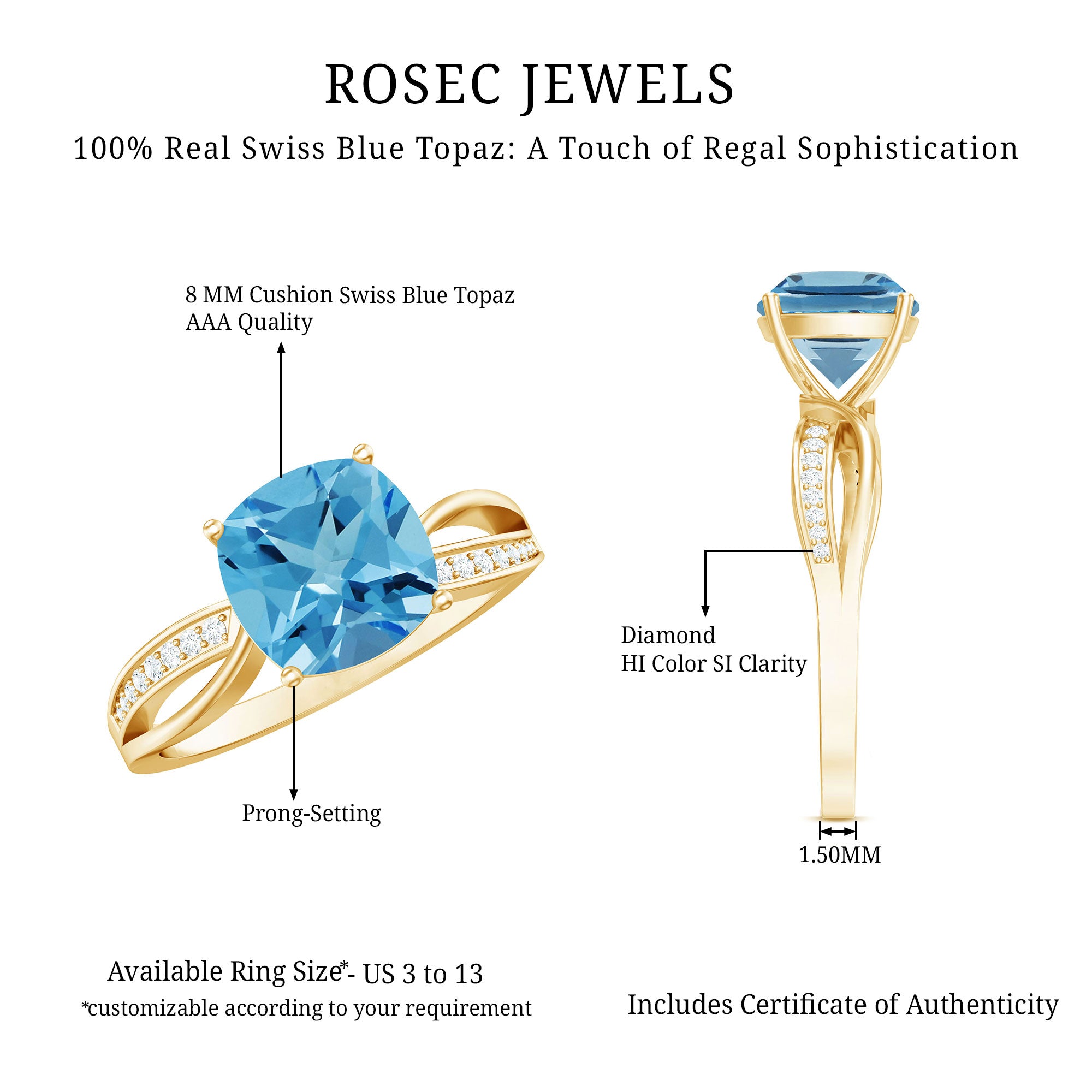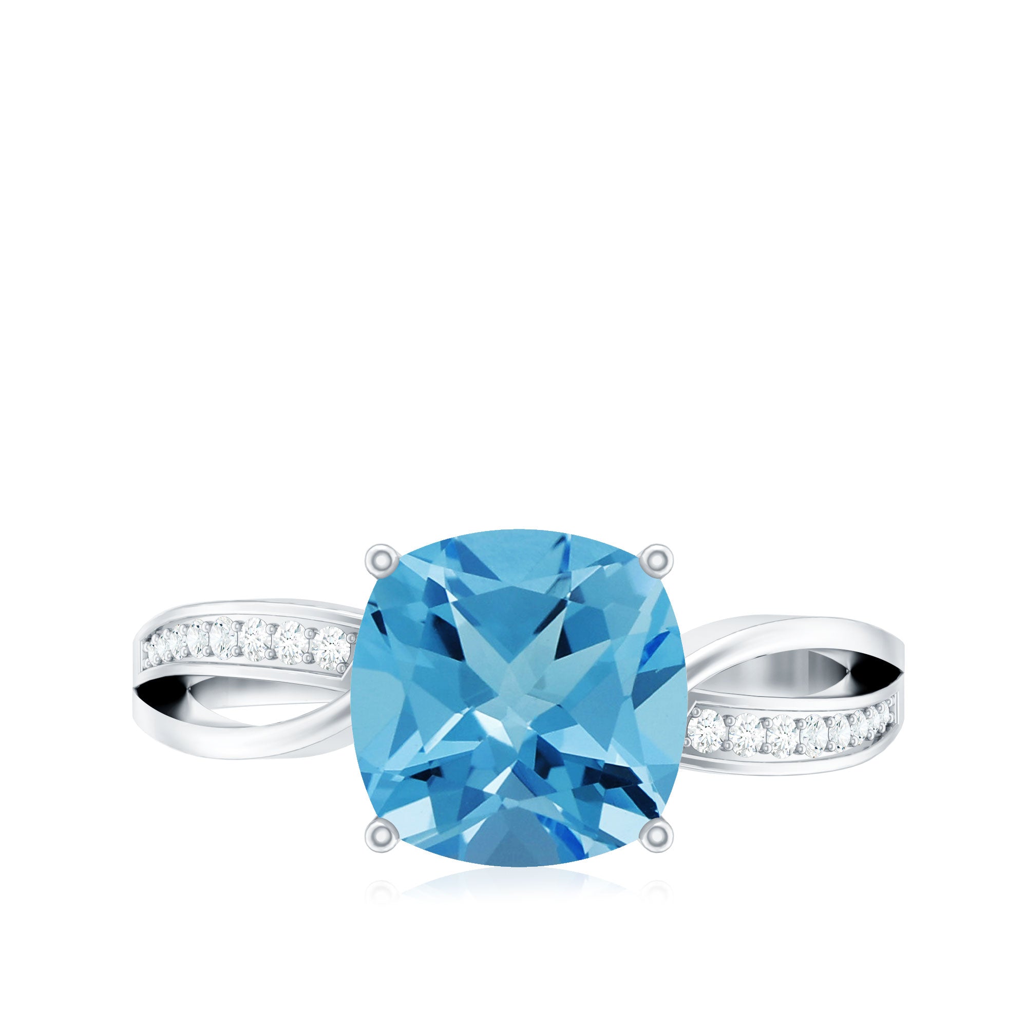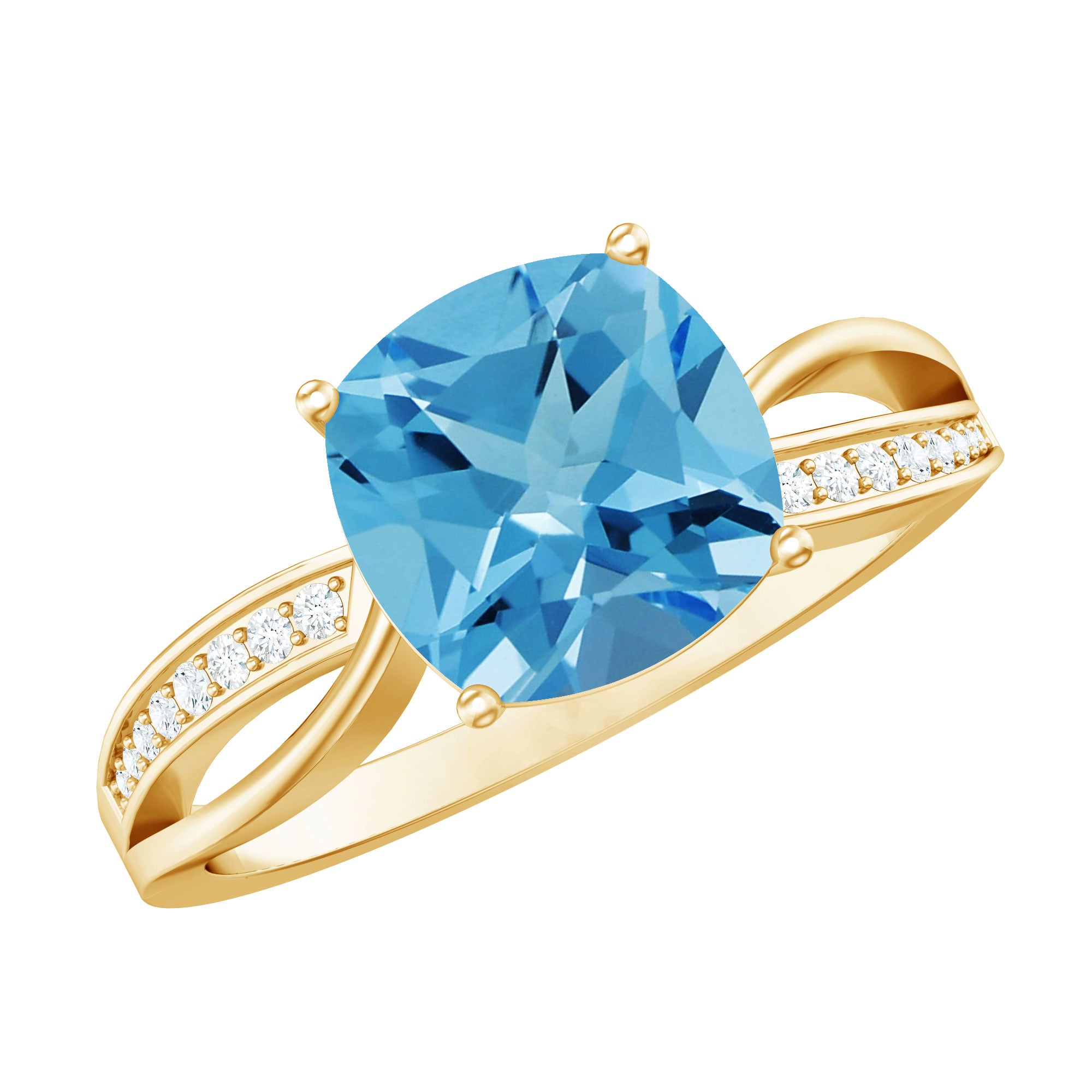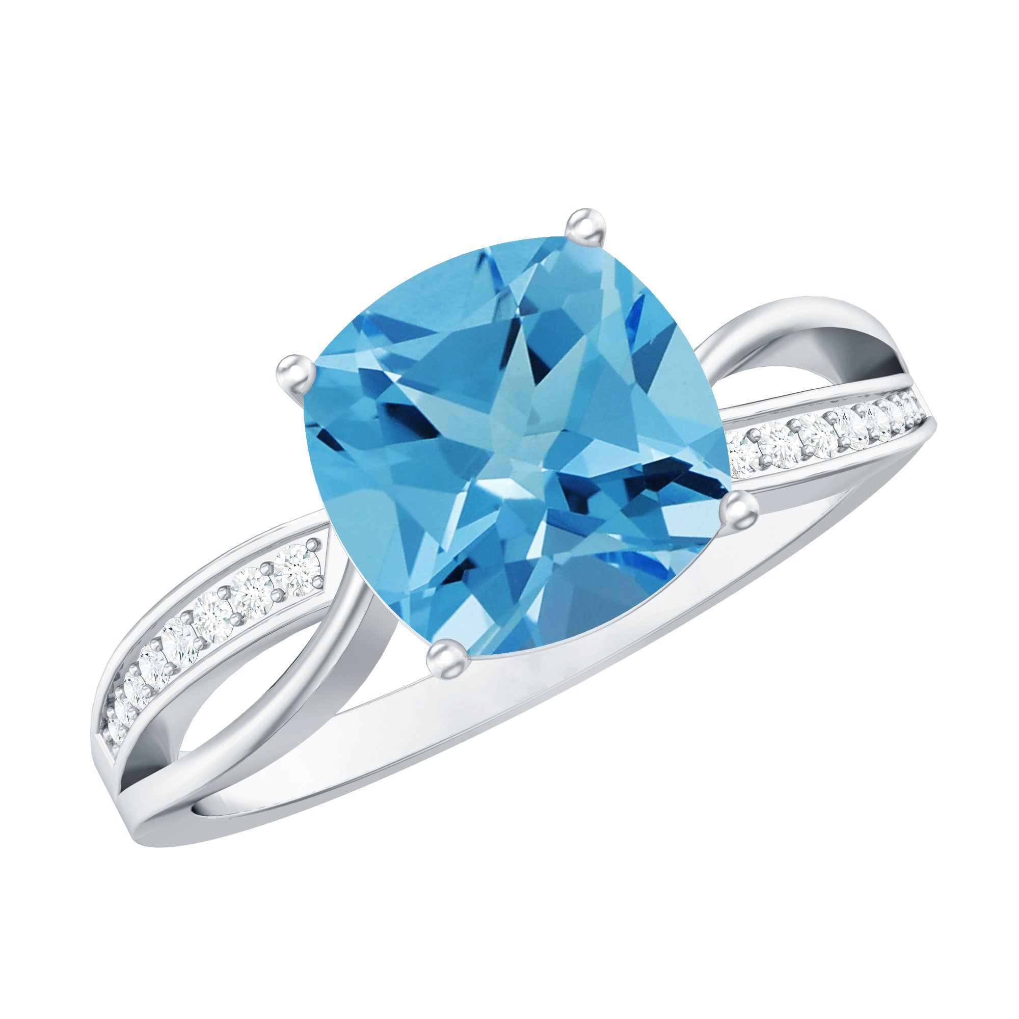 1.50 CT Two Tone Cushion Cut Swiss Blue Topaz Solitaire with Diamond Split Shank Ring