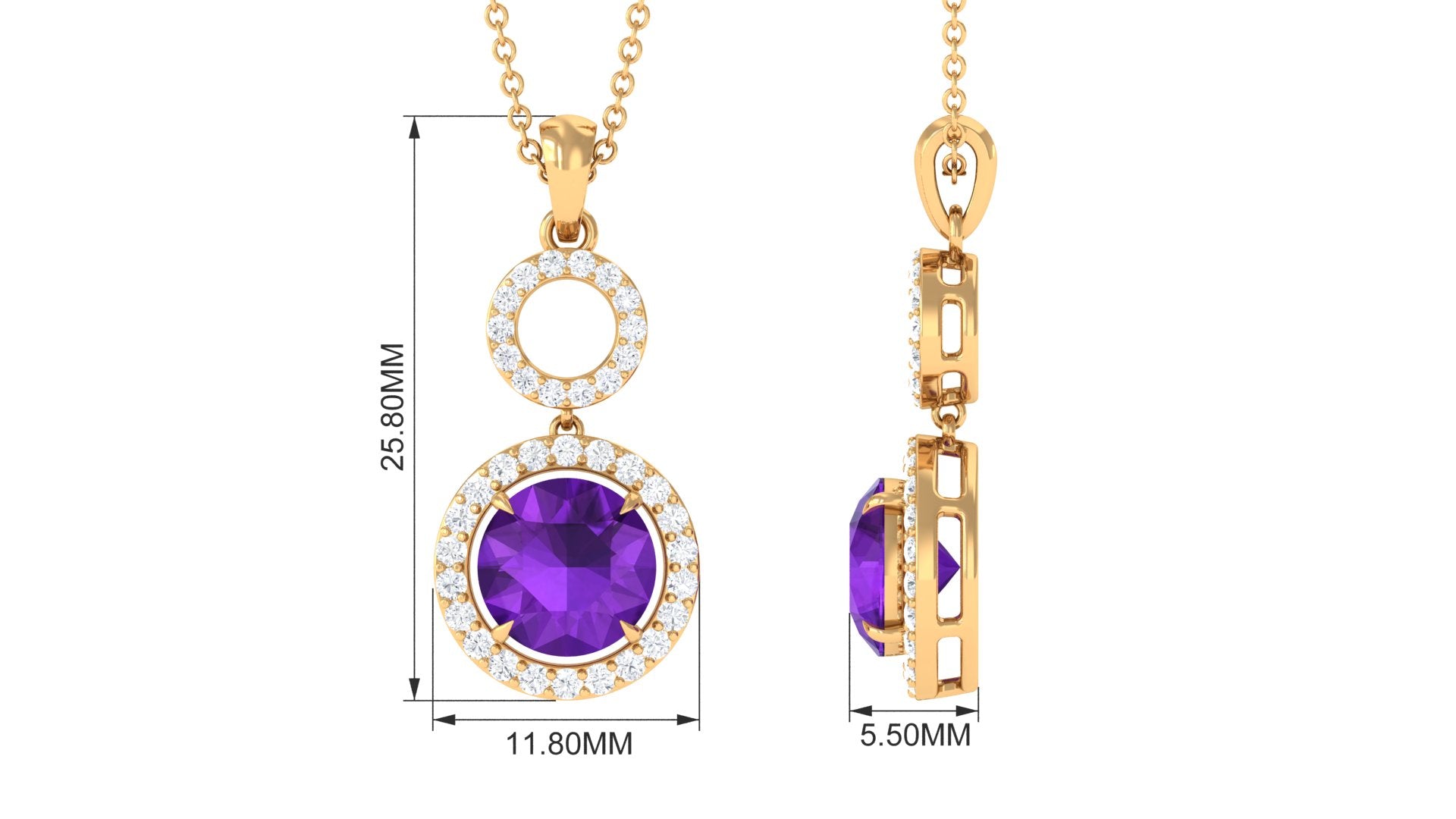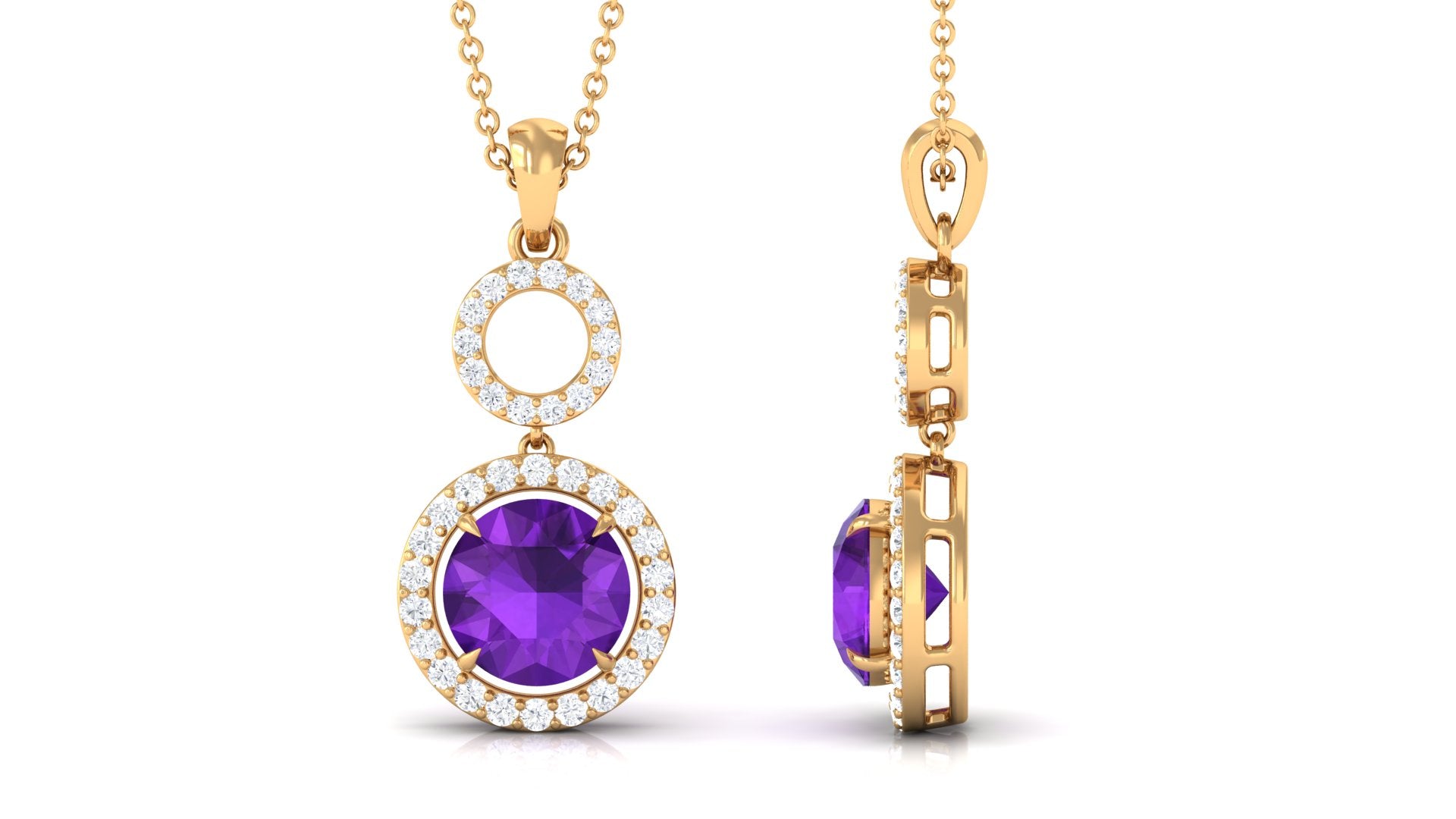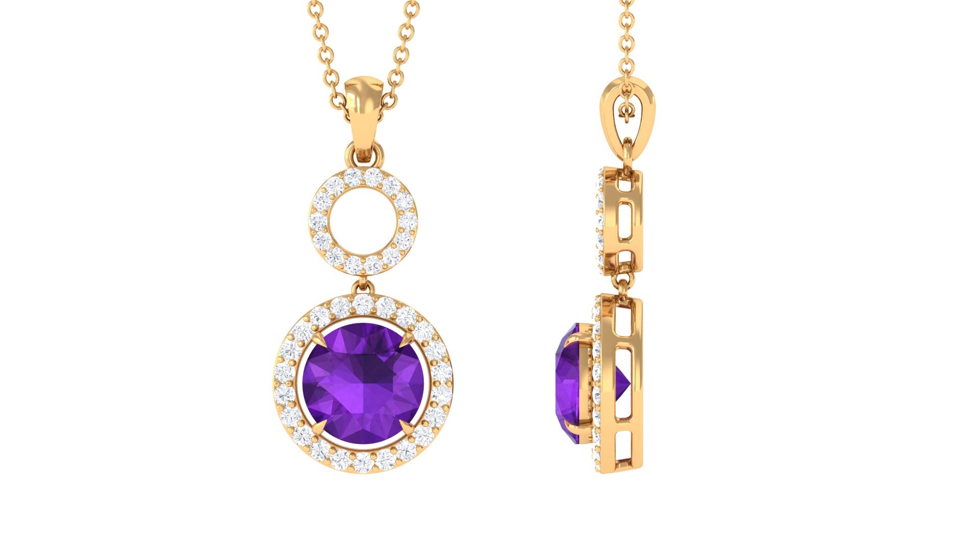 Elevate your style with this exquisite Amethyst Pendant. Featuring a Brilliant Round Shape Amethyst in a Claw Setting with Diamond Halo and Open Circle, this pendant necklace is a stunning addition to your jewelry collection. Crafted in Gold, this dangle pendant makes for a lovely surprise for your beloved.