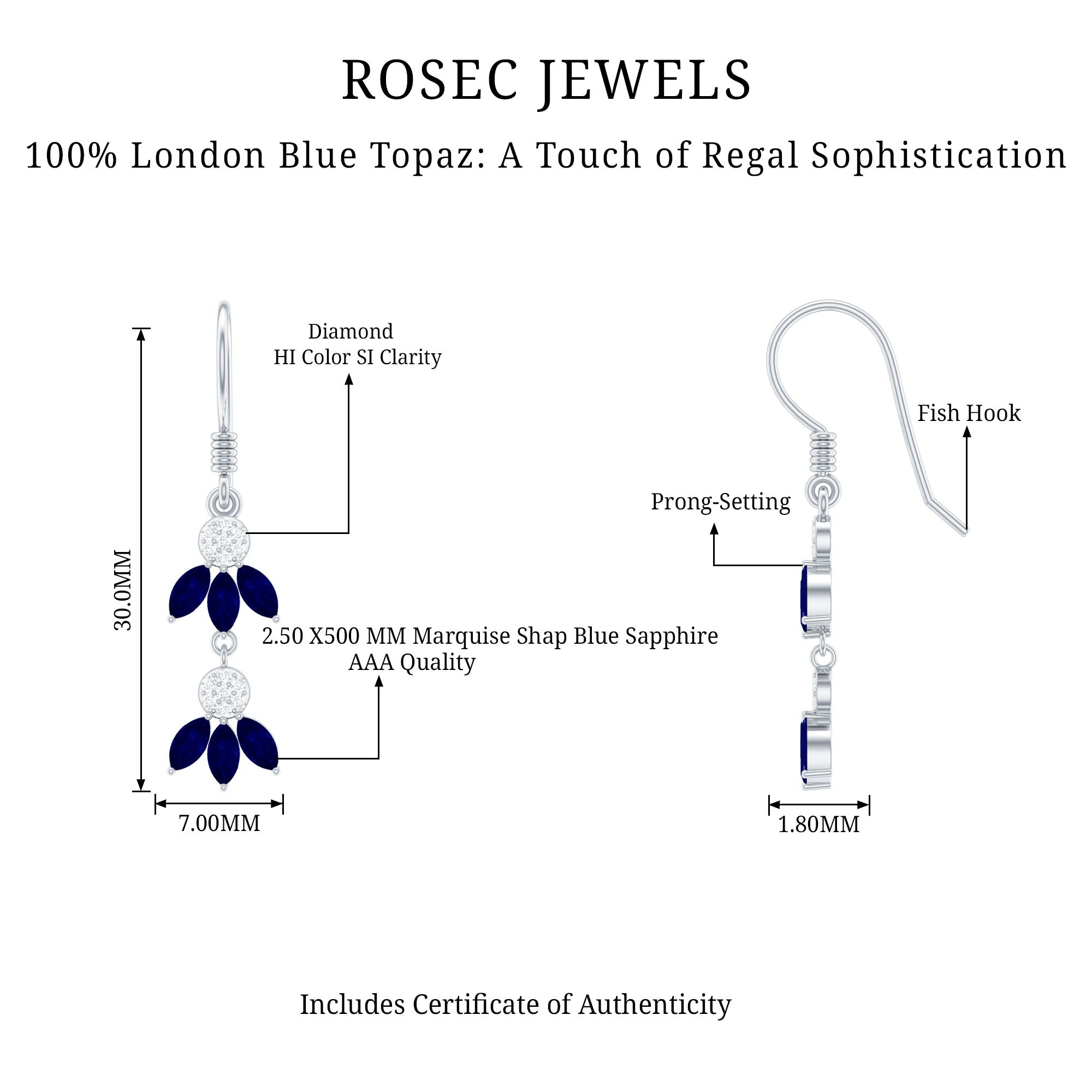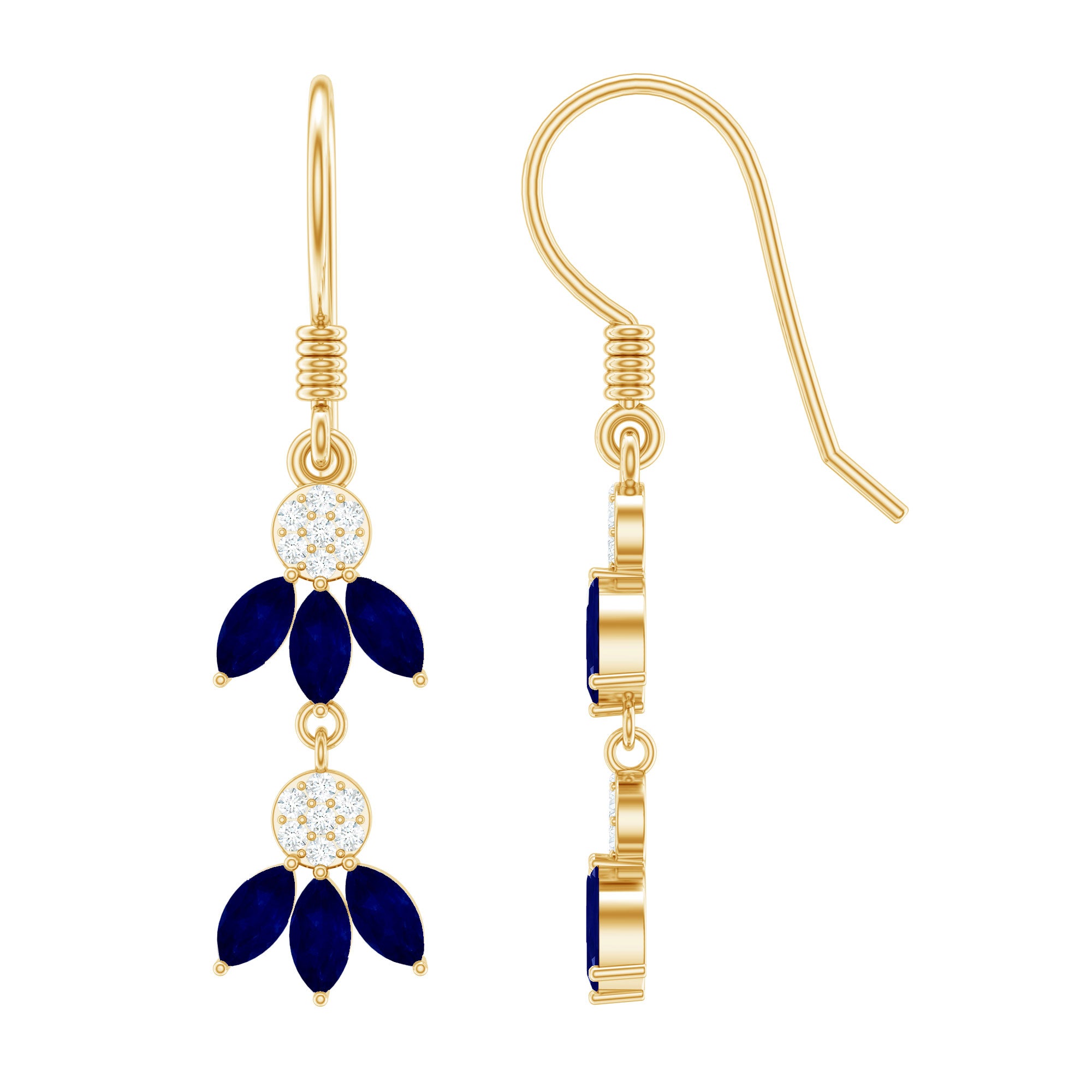 Elevate your style with these nature inspired Blue Sapphire Dangle Earrings. The earrings feature marquise shape blue sapphires and round cut Diamond stones set in a beautiful leaf motif. The dangle design adds a touch of movement, making these Blue Sapphire and Diamond Earrings perfect for those who appreciate unique and eye-catching jewelry. The high quality metal and stones adds a luxurious touch, making these Leaf Earrings ideal for September born women. Whether worn for special occasions or as an everyday accessory, these Fish Hook Earrings are sure to make a statement. With their beautiful blue color, nature inspired design, and high quality materials, they are the perfect choice for anyone looking to add a touch of glamour and sophistication to their look. So why wait? Adorn yourself with these Nature Inspired Earrings and let your style blossom.
