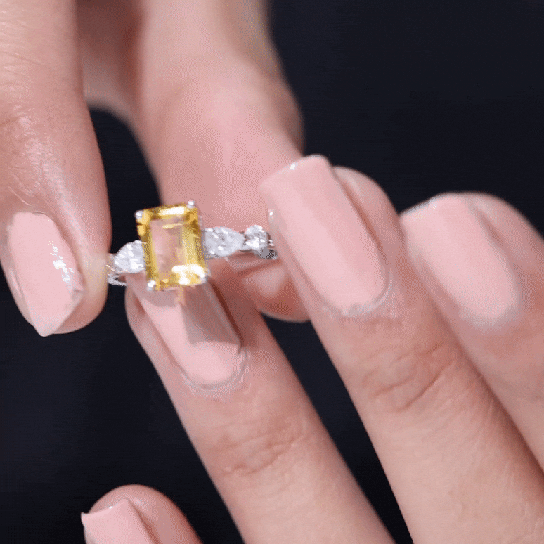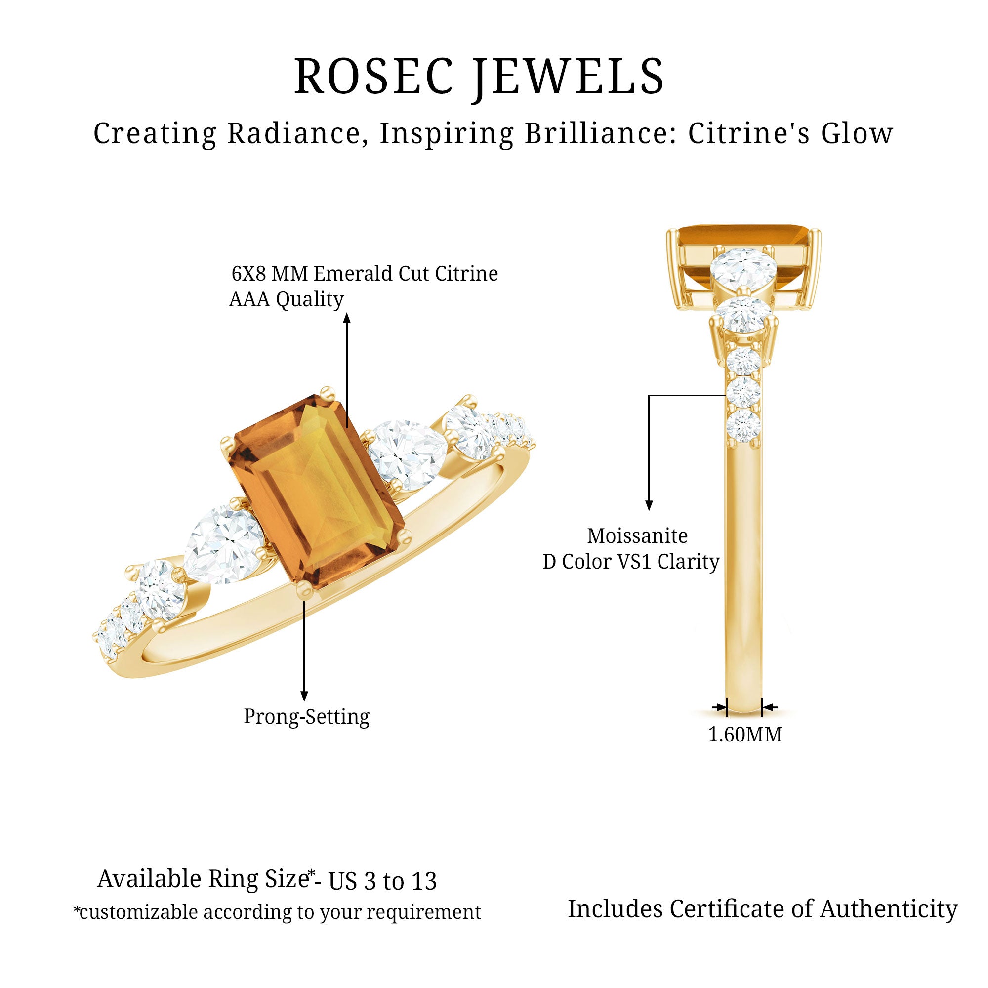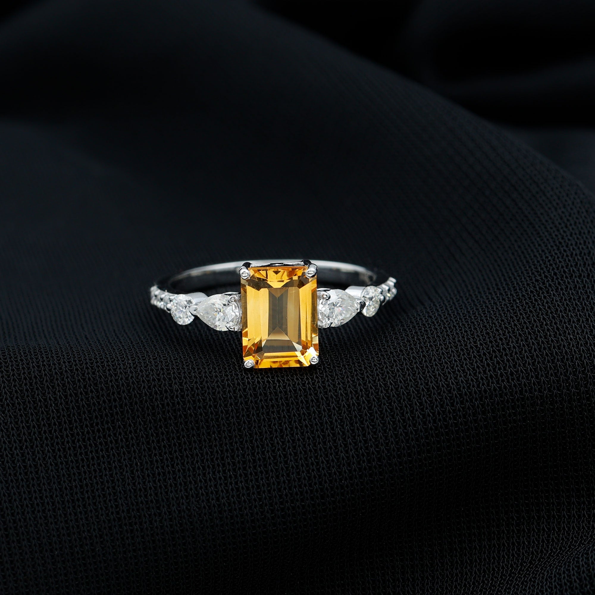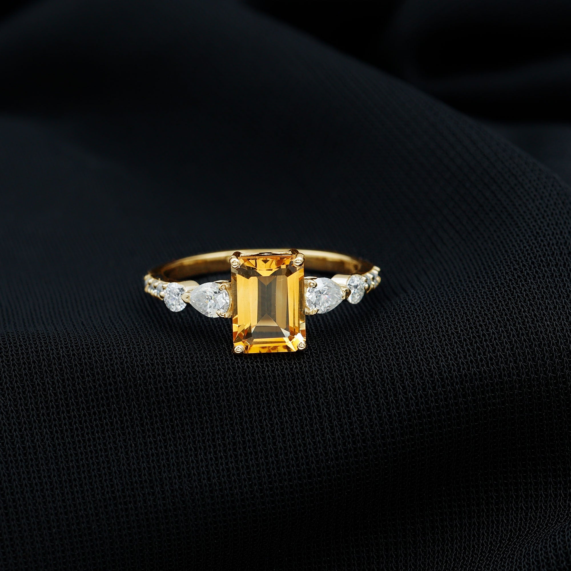 Bring your look to the next level by wearing this Classic Solitaire Ring embellished with Octagon Cut Citrine in Prong Setting with Pear and Round Cut Moissanite Side Stones. This Citrine Solitaire Ring is crafted with Gold for a luxurious appeal. Surprise your lady love with this elegant Citrine Ring and make her heart flutter.