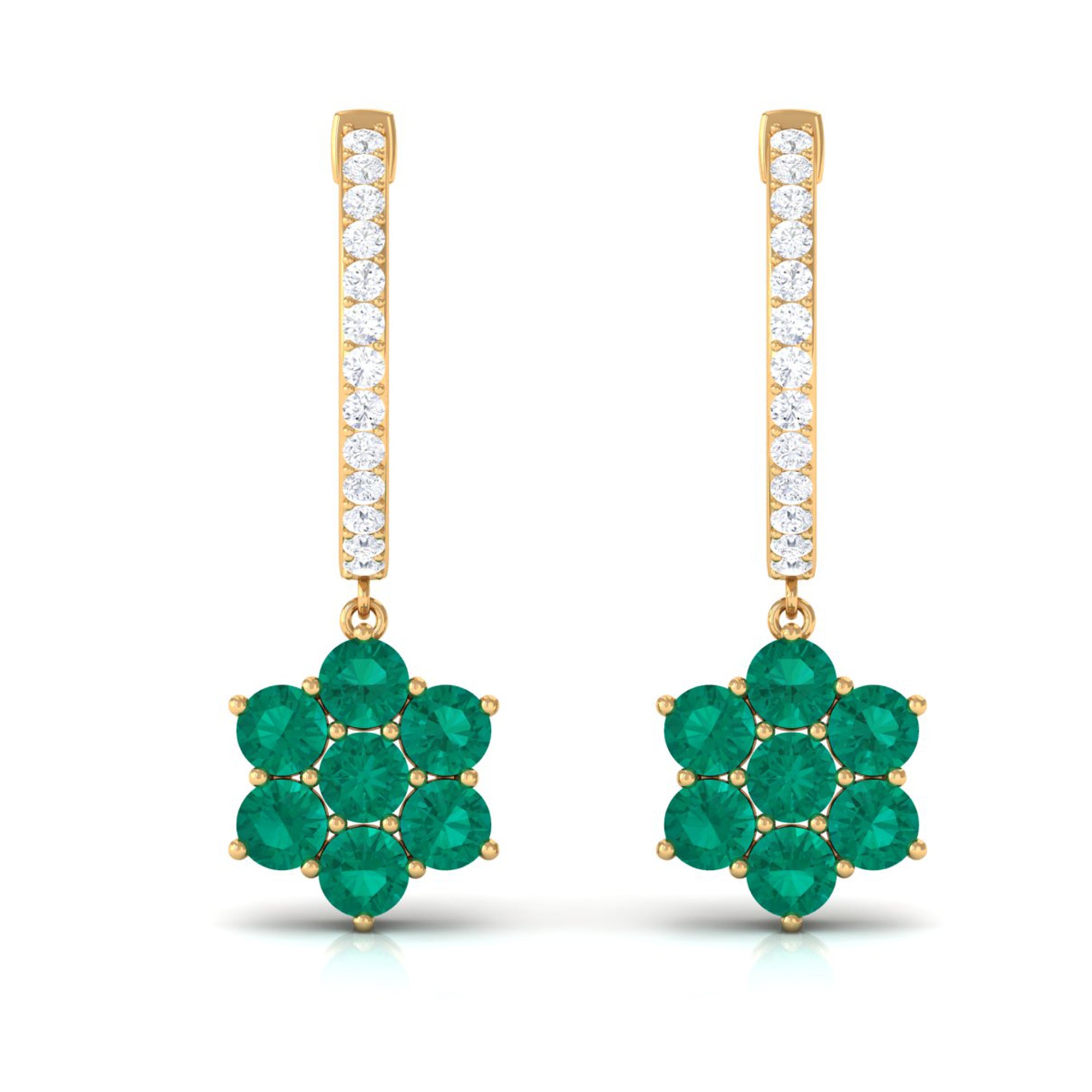 Get lots of compliments with these Flower Drop Earrings, a refreshing blend of vibrant color and timeless sparkle. Designed to captivate, each earring features 3 mm Round Shape Emerald stones arranged in a charming flower pattern that instantly adds a touch of romance and elegance. The flower gently dangles from a sleek Half Hoop, beautifully lined with dainty Diamond stones that shimmer with every move. Secured with Screw Back Closure, these Emerald Diamond Earrings offer comfort and style all in one. Whether you are dressing up for a dinner date, stepping out for a special celebration or simply adding a pop of green to your everyday outfits, these Emerald Drop Earrings make the perfect accessory. Packaged in a signature jewelry box, these Hoop Drop Earrings are also an ideal gift for birthdays, anniversaries or anyone who adores fine jewelry with a natural touch.