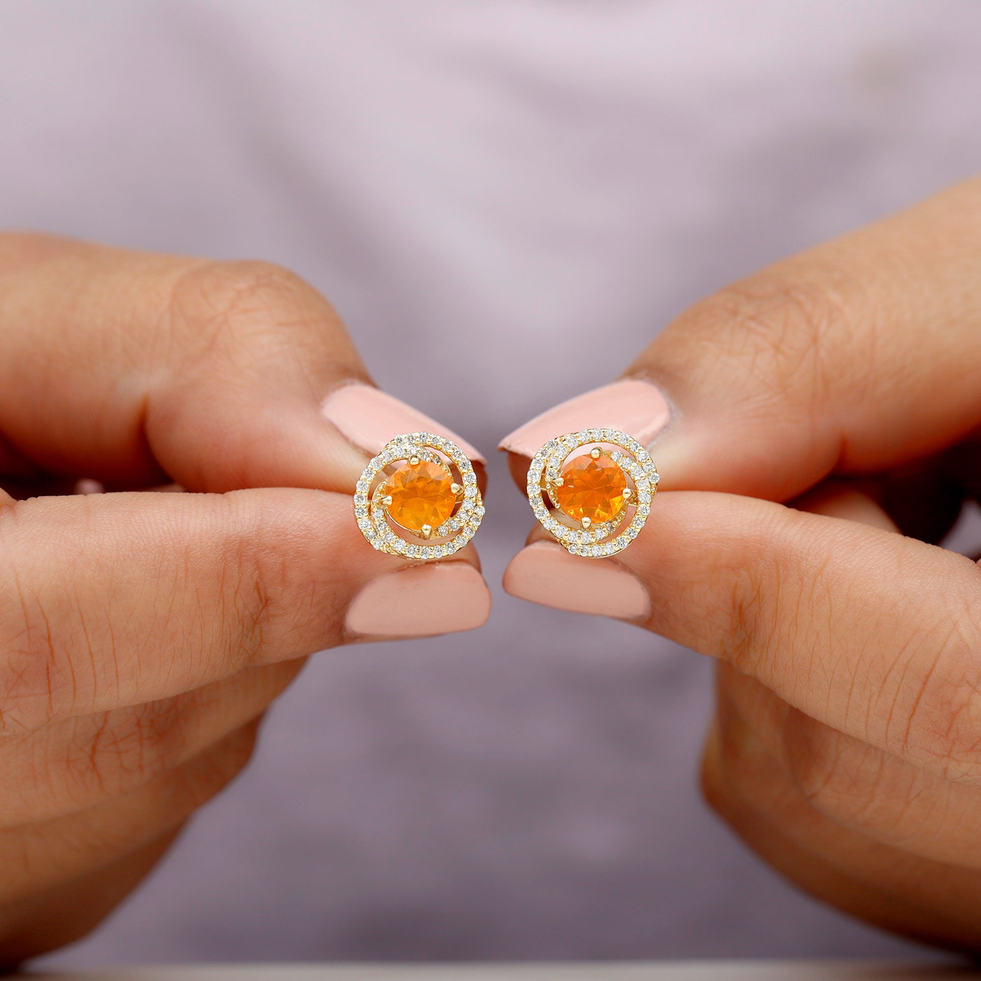 Celebrate your anniversary in style with this exquisite Swirl Stud Earring. The piece features a Brilliant Round Shape Fire Opal in a prong setting, surrounded by multiple circles of Diamond that add to its uniqueness and appeal. The earrings are mounted in Solid Gold, making them an ideal gift for your beloved wife.
