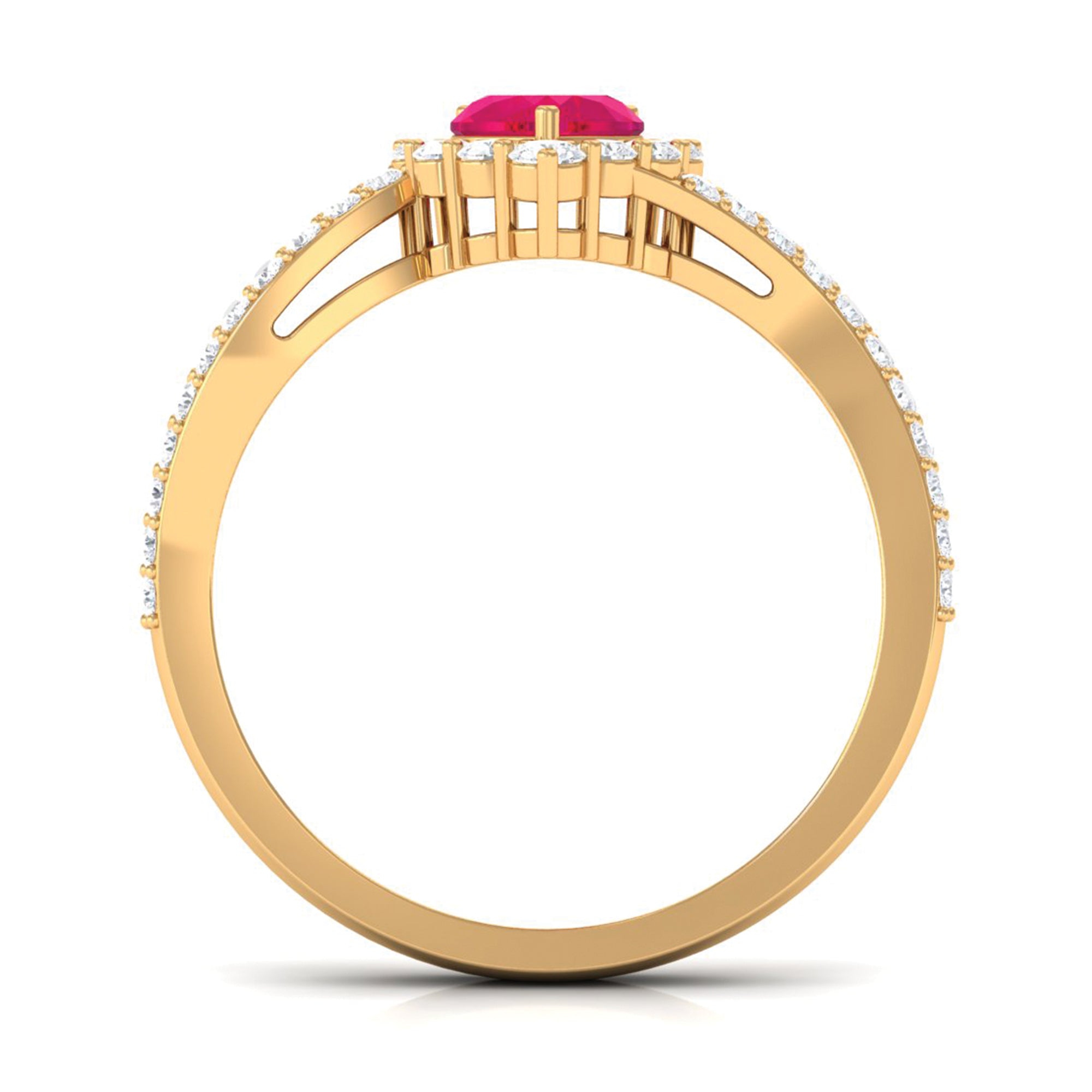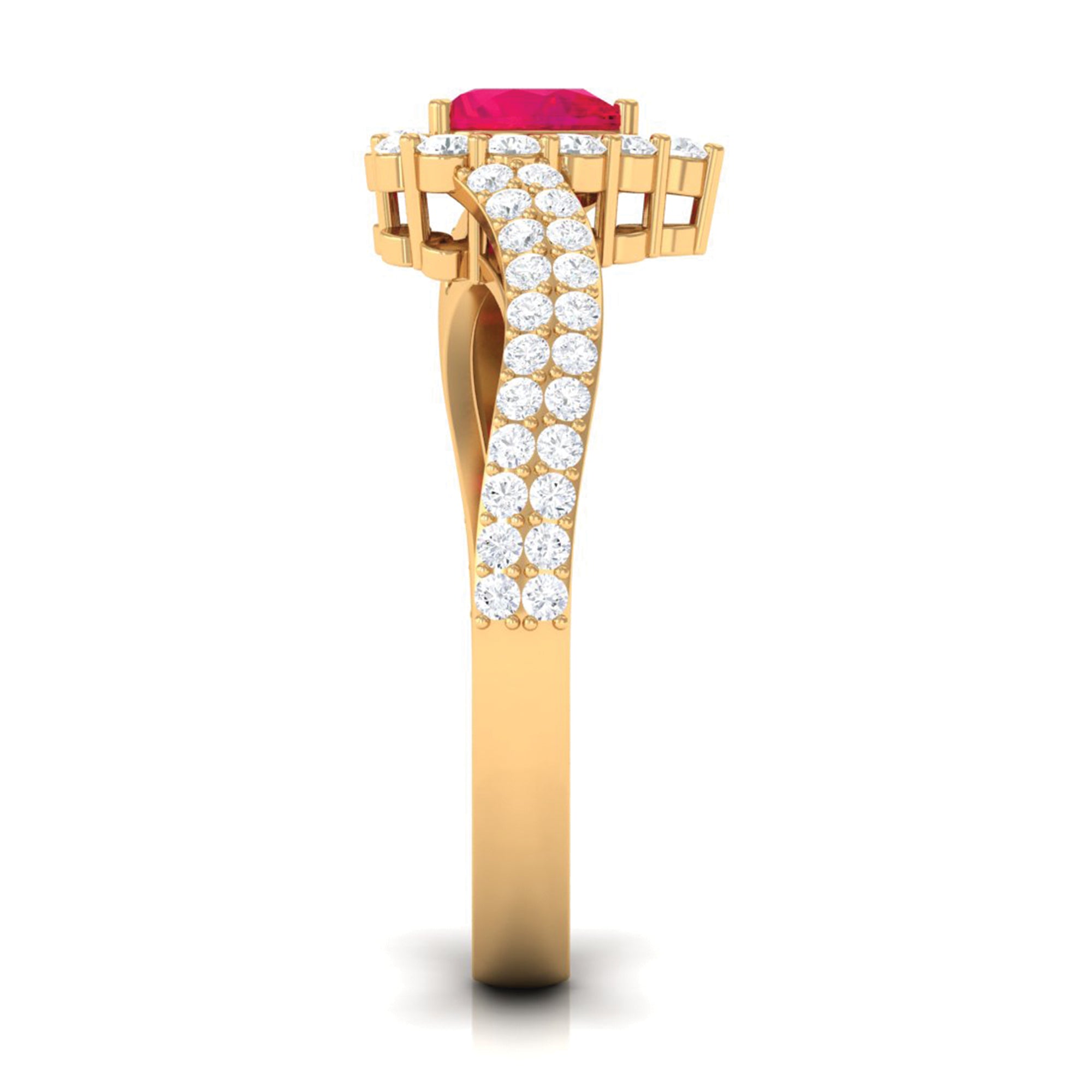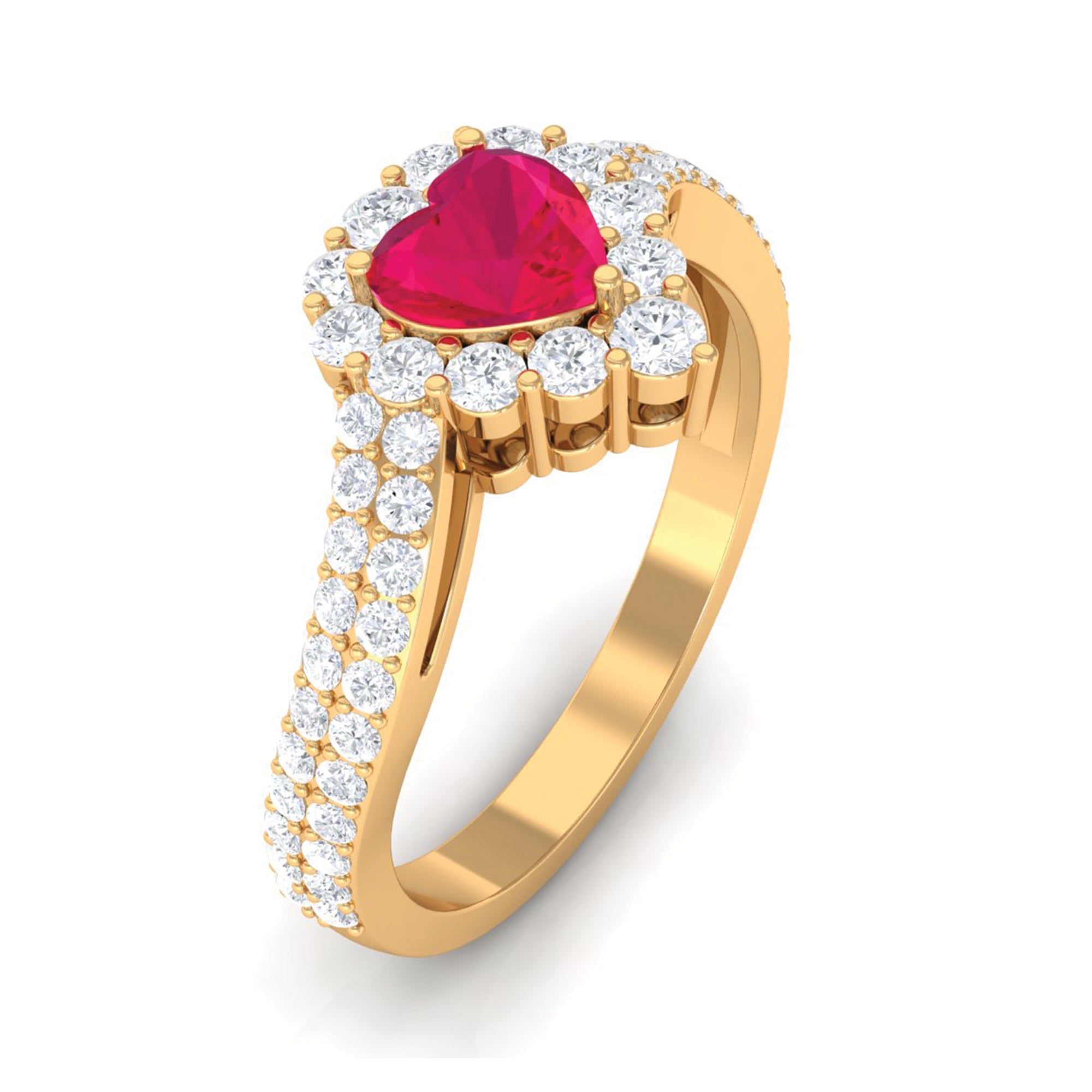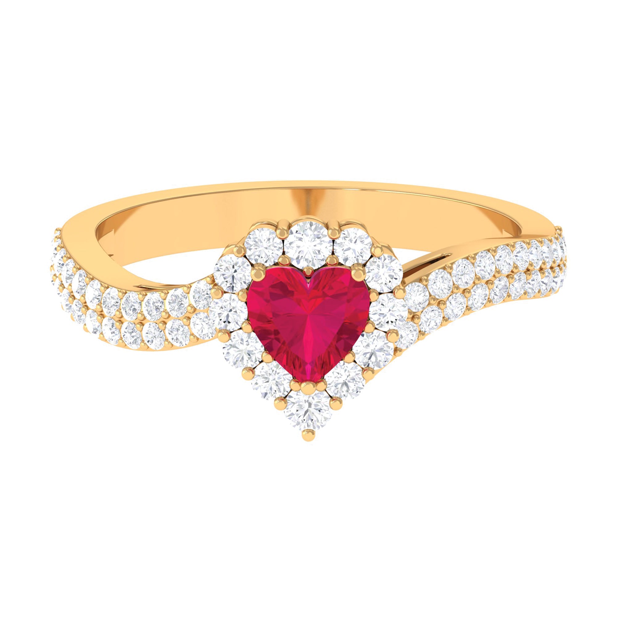This ruby engagement ring is a stunning and unique piece of jewelry. The ring features a heart-shaped ruby as the centerpiece, set in a bypass shank with a halo of sparkling Diamond also set as side stones. The ring is crafted in gold. The ruby is a precious gemstone known for its rich red color, symbolizing love and passion. The heart-shaped design gives the ring a romantic and feminine look. The Diamond halo and side stones are known for their brilliance and fire, adding an extra sparkle to the ring. The ring is crafted with great care and precision, making it a perfect symbol of love and commitment. The ring is perfect for an engagement ring or a special occasion.
