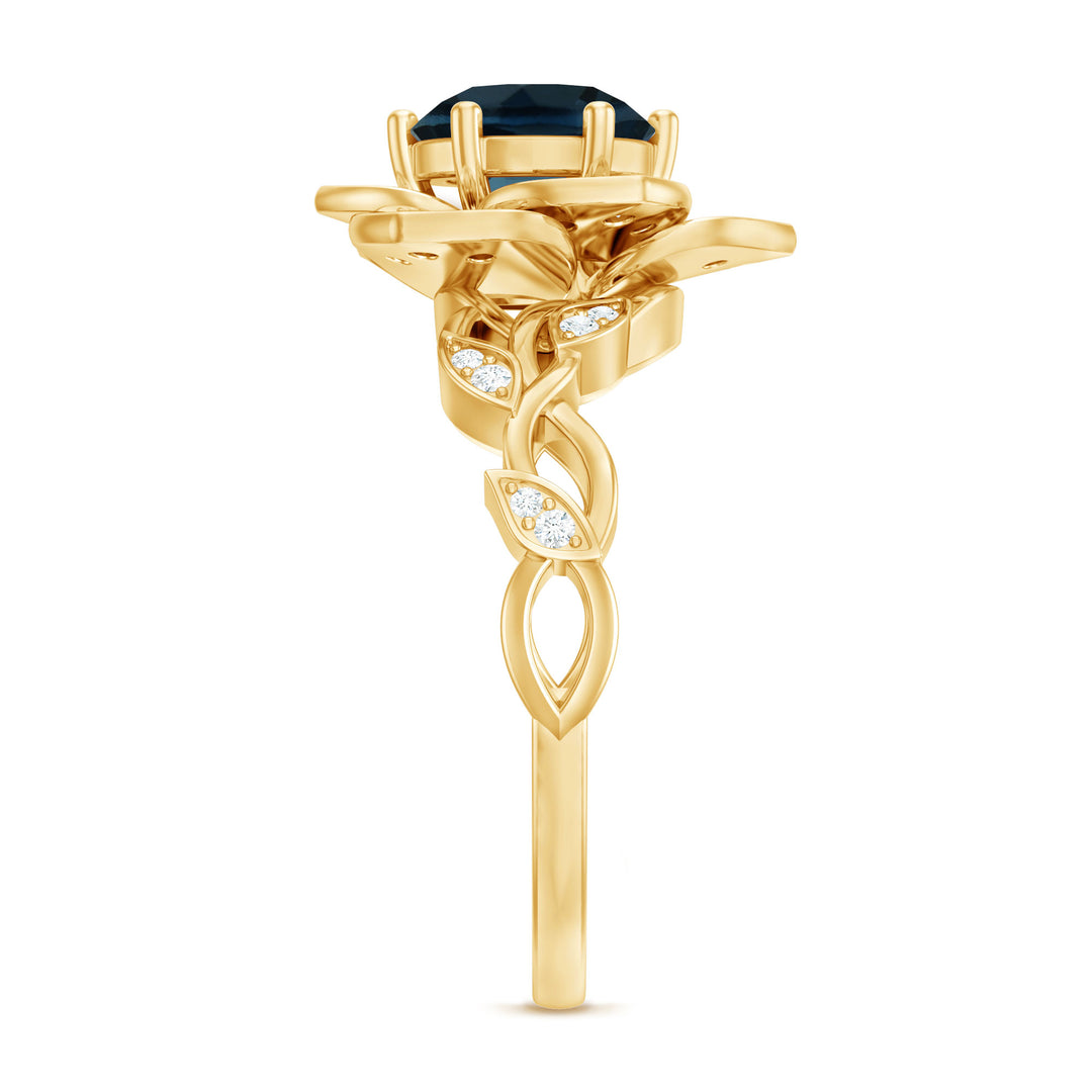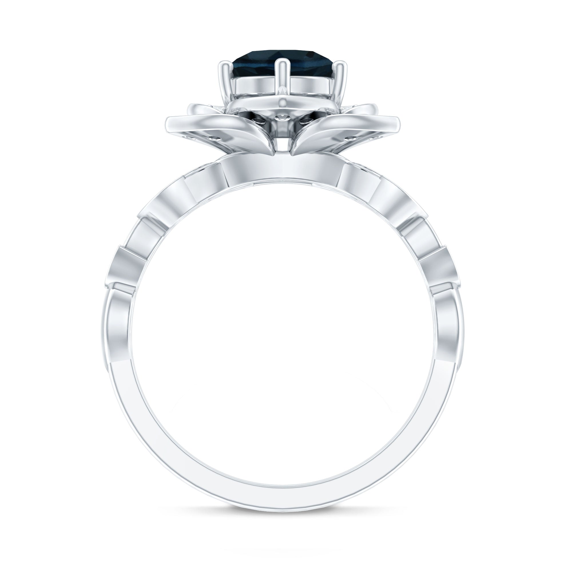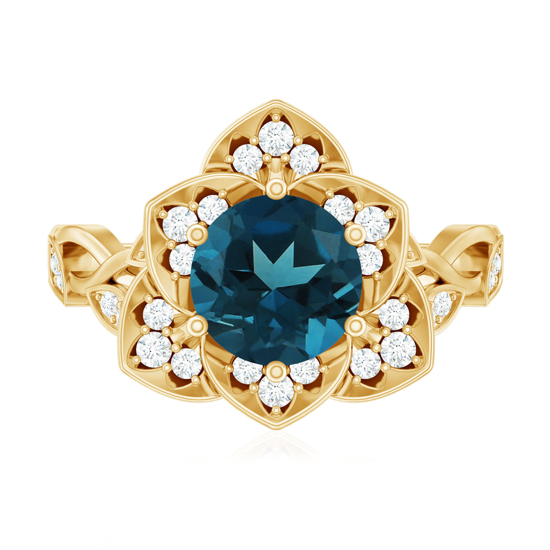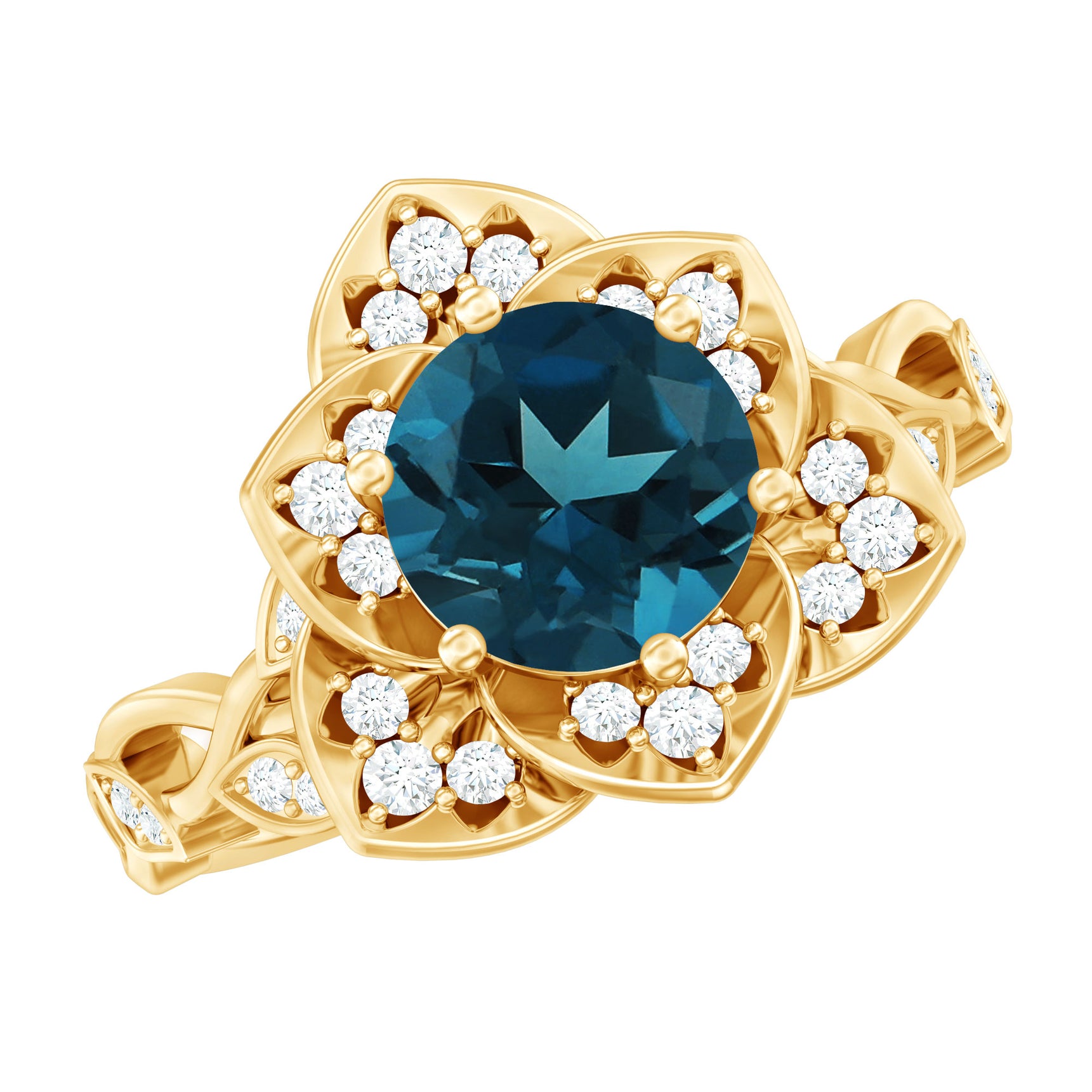 Turn heads at your next cocktail party with this eye-catching Flower Statement Ring, made to shine with bold style and feminine charm. Right at the center, it features a 7 MM round shaped London Blue Topaz that glows with deep blue tones, giving off an elegant vibe that is hard to miss. Surrounding the topaz are sparkling diamonds, set over delicate metal leaves that bring a romantic or floral inspired touch. The band continues the nature inspired theme with tiny leaf like details, each set with small diamonds that catch the light just right, like little drops of sparkle. This London Blue Topaz and Diamond Engagement Ring is not just beautiful, it is a full-on style statement. Whether you are dressing up for a special night out or adding some glam to your everyday look, this Blue Topaz Flower Ring brings a mix of elegance and fun to any outfit. The floral shape adds a touch of whimsy, while the blue topaz keeps things bold and classy. Perfect for women who love jewelry that feels unique and artistic, this Topaz Cocktail Ring is a conversation starter. Packed in a pretty jewelry box and available in multiple sizes, it also makes a thoughtful gift for birthdays, anniversaries, or just because. Add this floral beauty to your collection and let your hands do the talking.