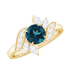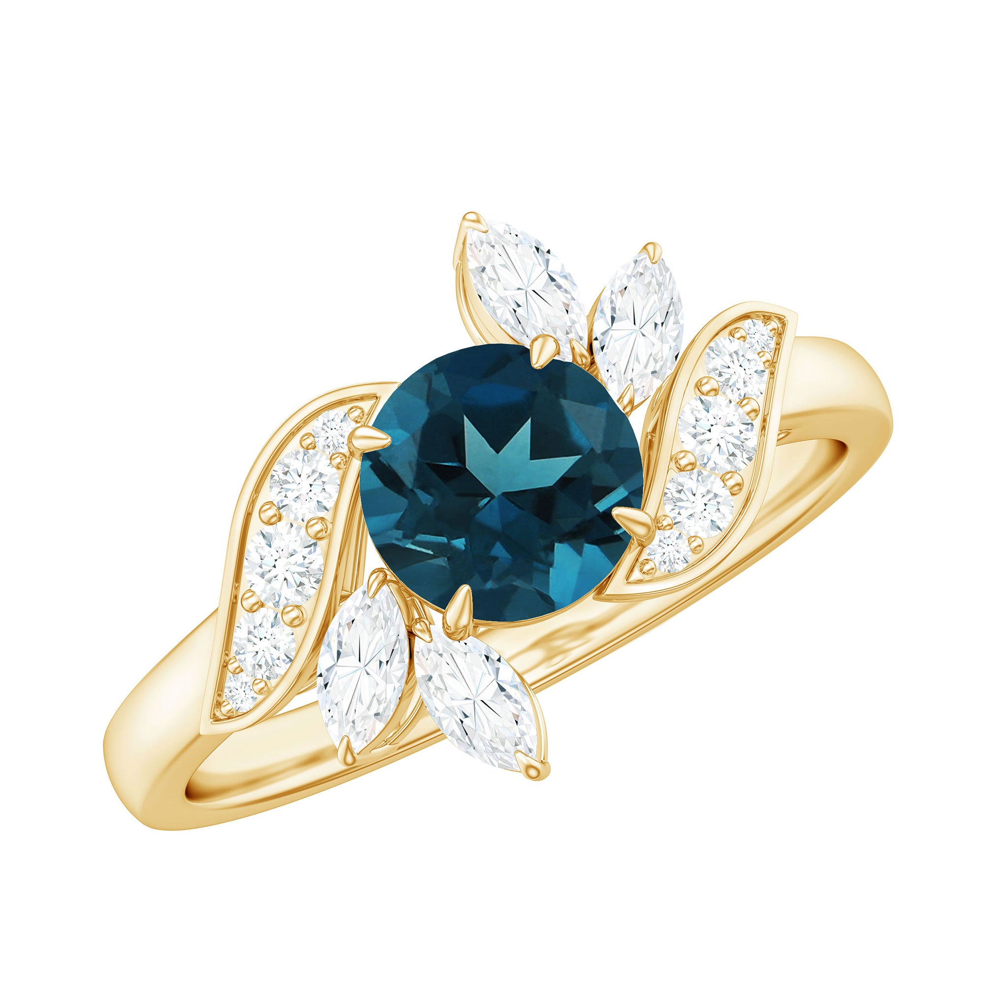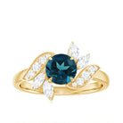 Inspired by the splendor of nature, this London Blue Topaz Engagement Ring is truly exceptional and imbued with significance. It features a radiant 7 MM round shape London Blue Topaz, set in a claw setting that allows its deep blue hue to shine brilliantly. Surrounding the blue topaz are intricate leaf-inspired motifs that gently embrace the center stone, with each leaf adorned with small round and marquise shaped diamonds that provide a soft shimmer and enliven the overall appearance. This Blue Topaz and Diamond Engagement Ring represents the ideal blend of natural beauty and enduring sparkle, designed for someone who perceives love as a remarkable journey filled with adventure and enchantment. It possesses a touch of whimsy, a hint of elegance, and is entirely distinctive, much like the individual who wears it. Whether she is a trailblazer or a believer in love stories with a unique twist, this Floral Engagement Ring is a perfect match. It is elegantly packaged in a charming jewelry box and is offered in various sizes to ensure a perfect fit. More than merely a piece of jewelry, this Topaz Flower Ring symbolizes eternity, serving as a reminder of the beautiful moments and memories that render your love story truly unique.