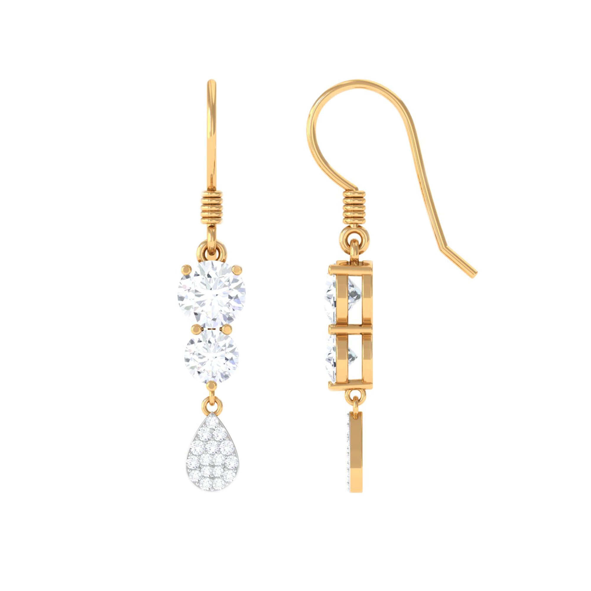 Add a touch of sparkle and shine to your everyday look with these Minimal Dangle Earrings. These Moissanite earrings showcase round-cut Moissanite stones arranged in a dangle style, complemented by delicate more dainty round Moissanite stones on the pear shape. Crafted from solid gold, these Moissanite dangle earrings are a must-have accessory that will enhance your radiance and warmth.