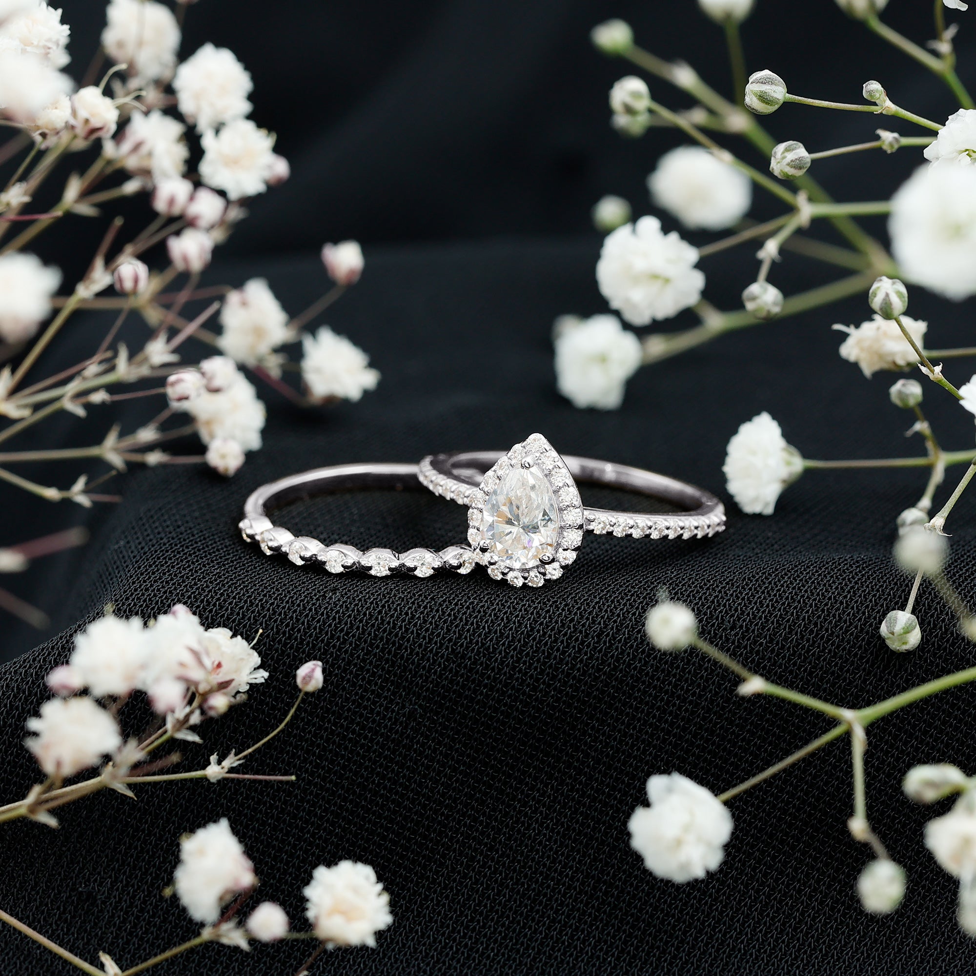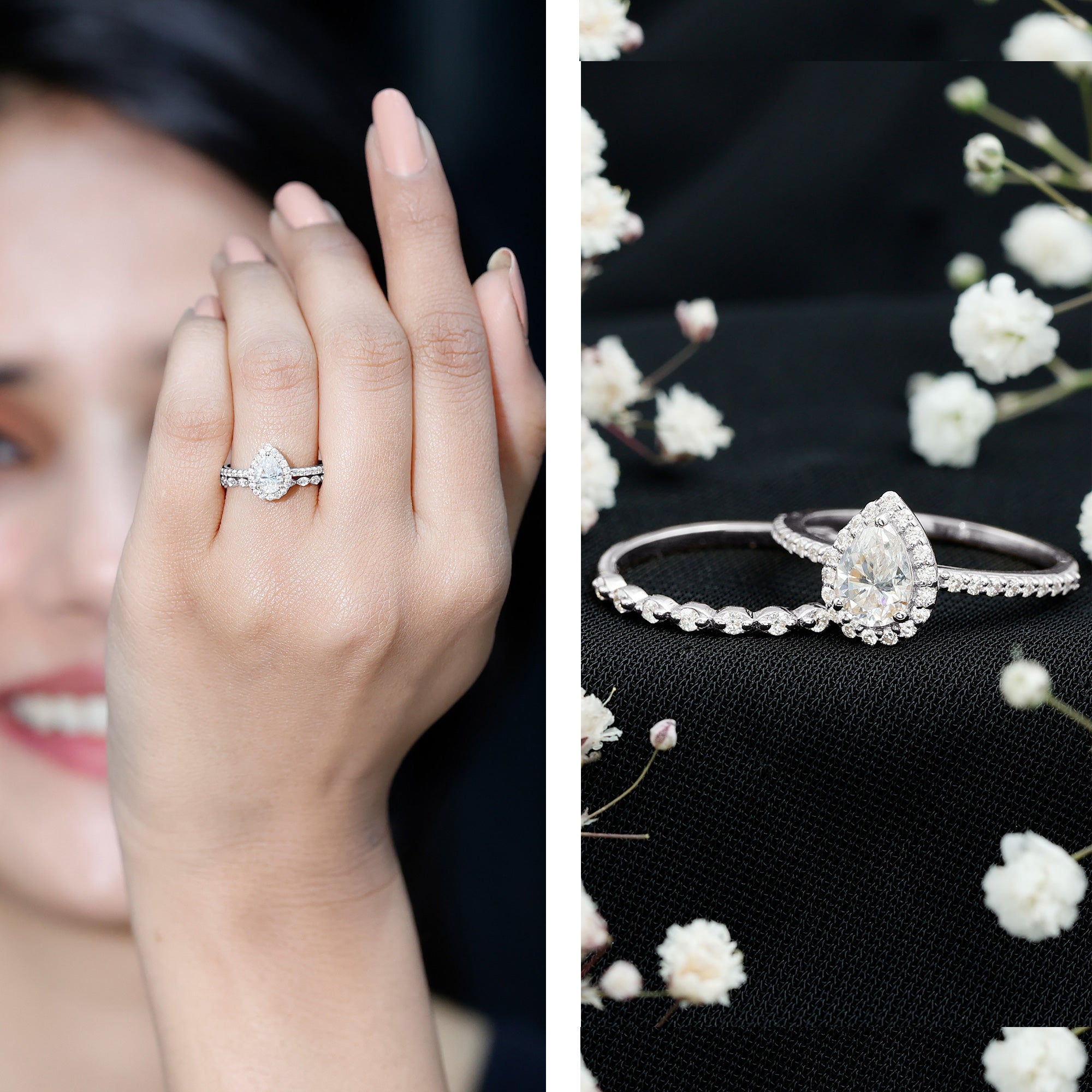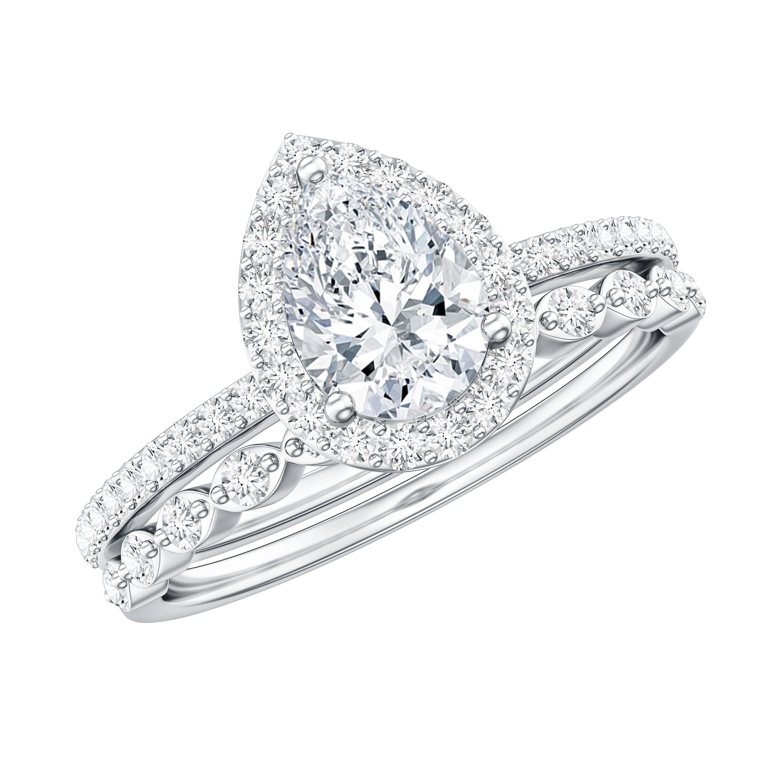 The coordinated ring set ensures a unified look, while the halo design enhances visual depth. The teardrop shape provides a distinctive appearance that remains versatile across different styles.
