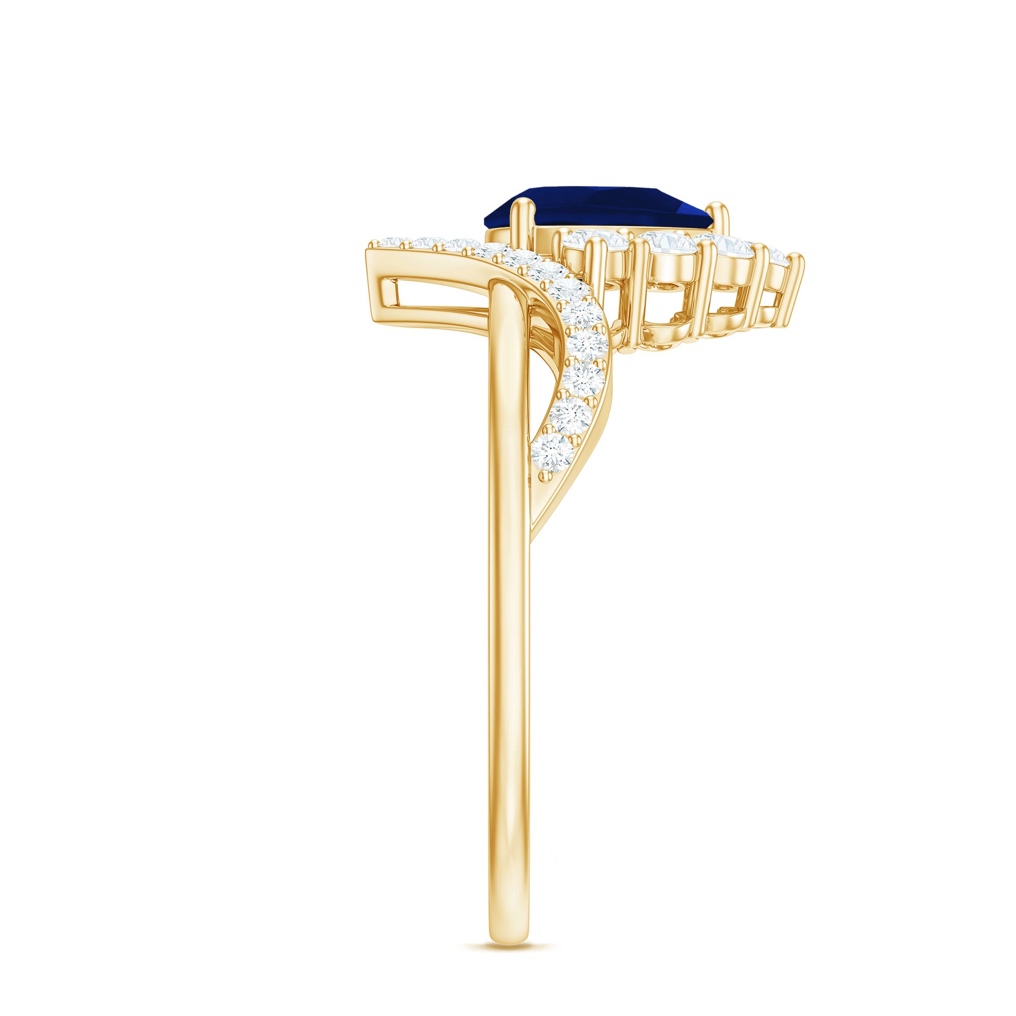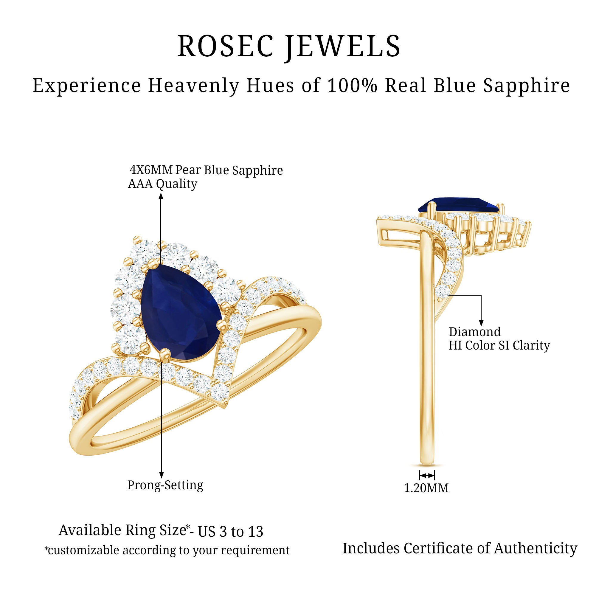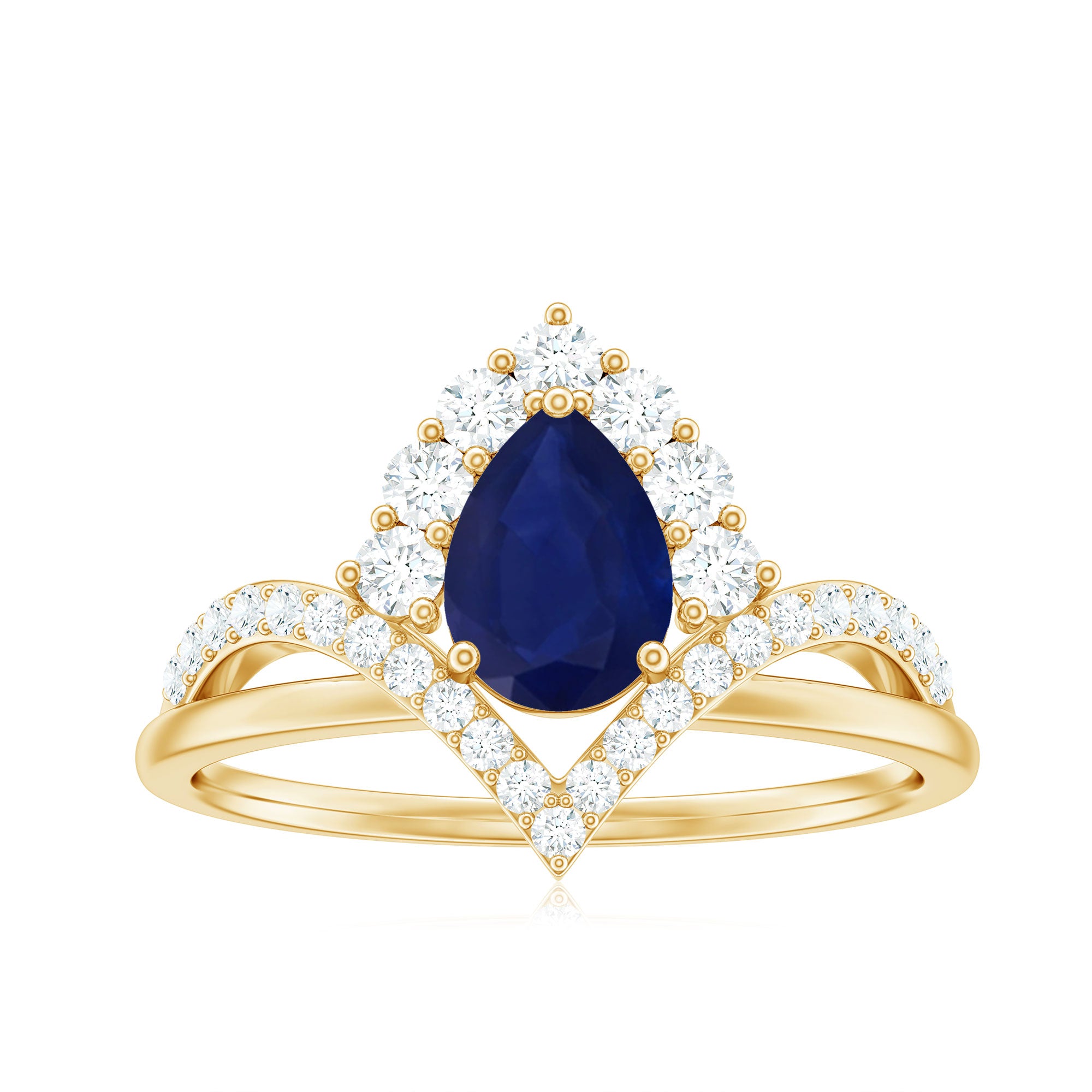 Give a flair of elegance to your look with this Designer Ring adorned with Pear Cut Blue Sapphire set as Solitaire in 3-Prong Setting with Diamond Accent, crafted in Solid Gold, this designer Ring is a timeless treasure.