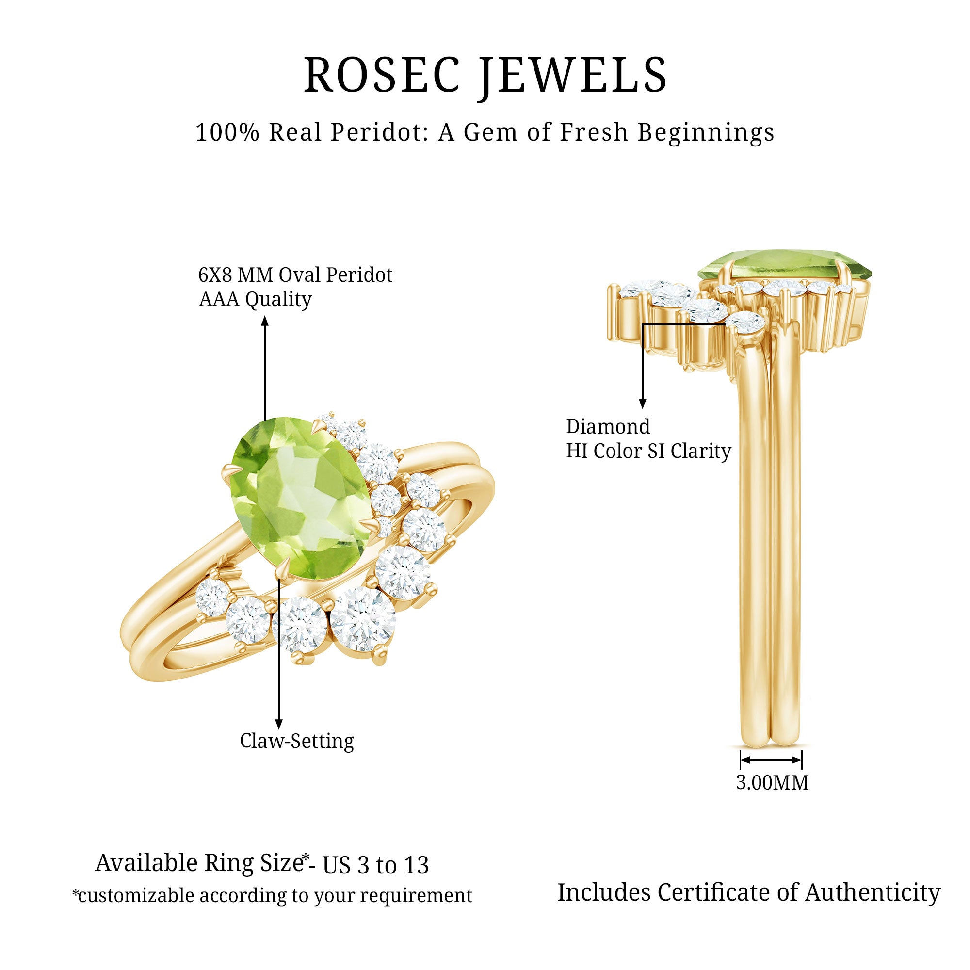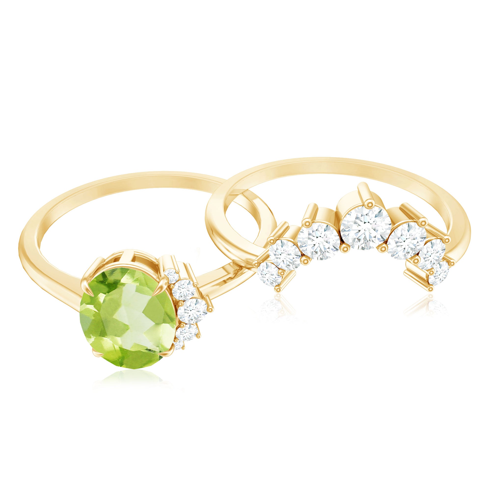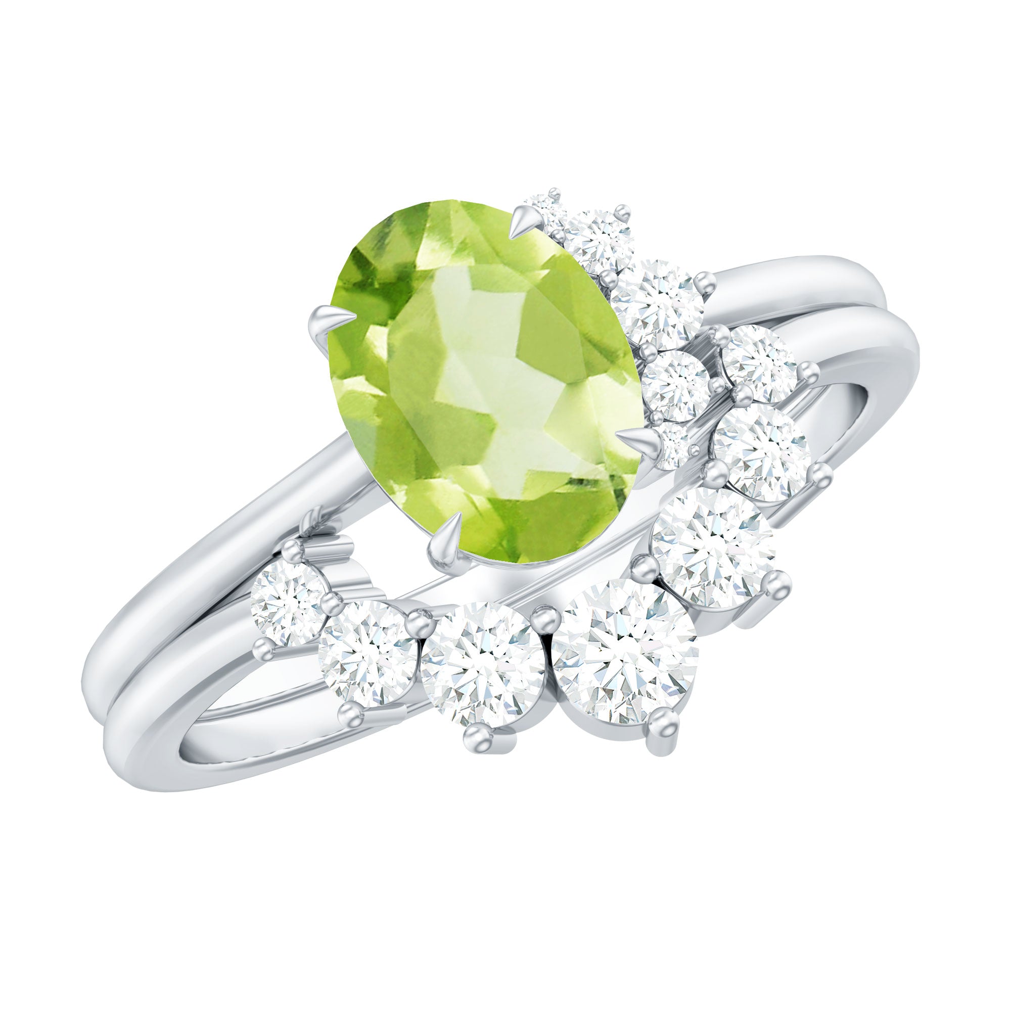 A Perfect and Lovely Engagement Enhancer Ring Set has adorned with Oval Shape Peridot set as a solitaire in a claw setting and Round Shape Diamond in a prong setting on enhancer band. This Engagement Enhancer Ring Set is crafted in solid gold.