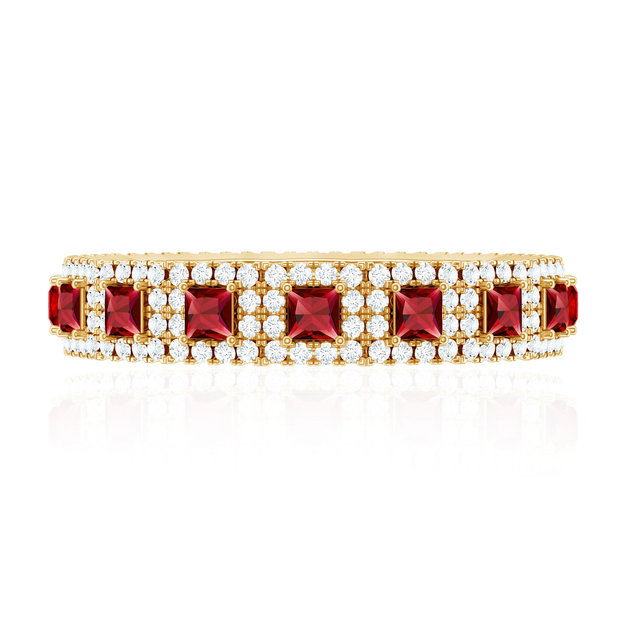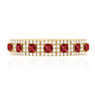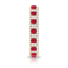 Wedding Band Ring is embellished with captivating Princess Cut Created Ruby Gemstones encircled with Round Shape Diamond Accent set in a prong setting. This Band Ring is composed of Solid Gold, this fabulous piece will look great on every woman.