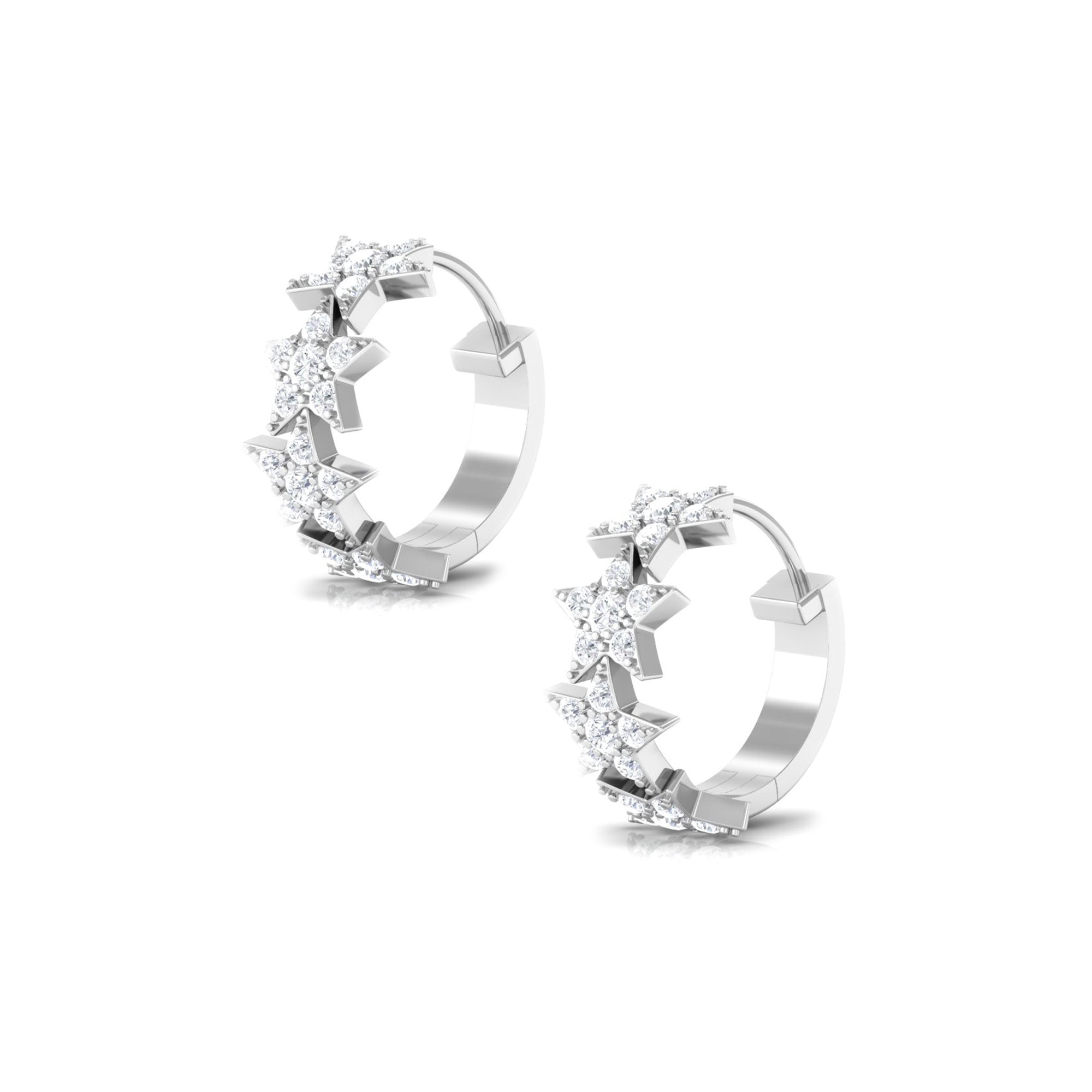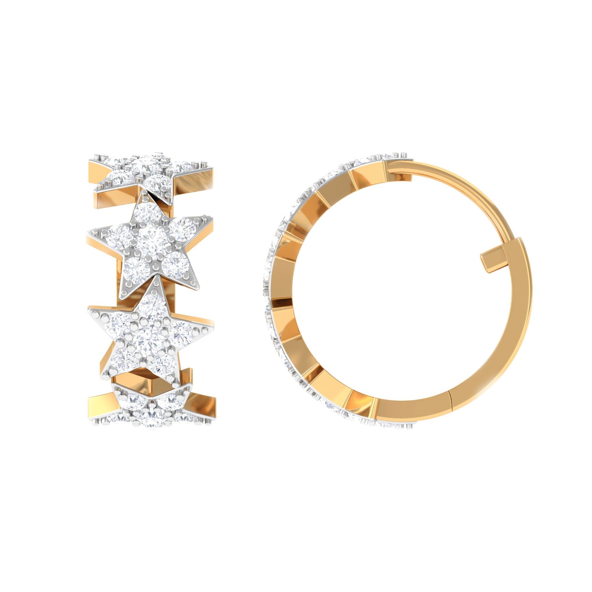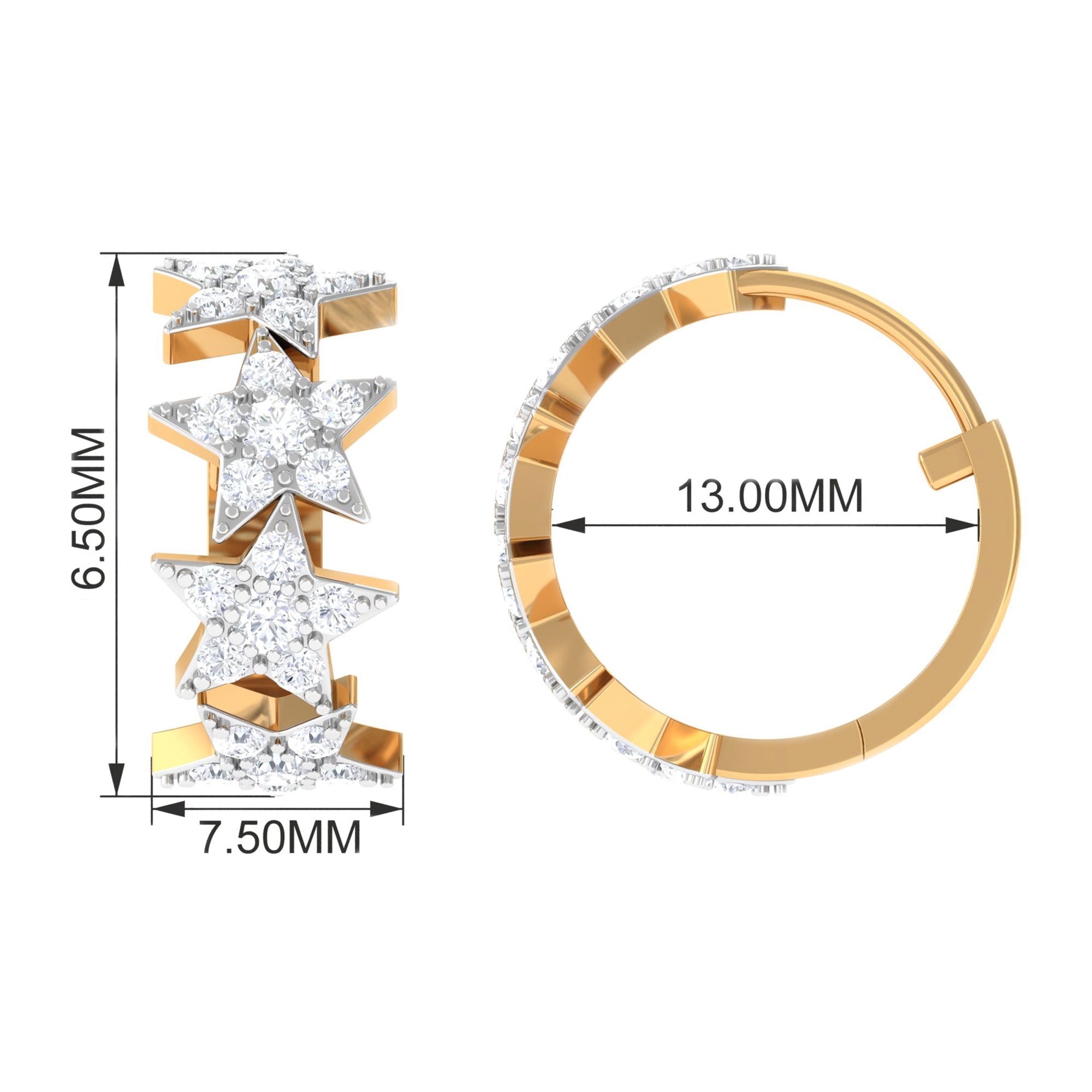 Add a touch of magic to your style with these Star Hoop Earrings. The Gold Hoops feature enchanting stars adorned with scintillating Round Cut Moissanite in a prong setting, secured comfortably with a hinged back. Elevate your casual and party look by wearing these unique Huggie Hoop Earrings. Surprise your beloved on her birthday with these stunning Star Earrings as a gift, and let her sparkle and shine wherever she goes.