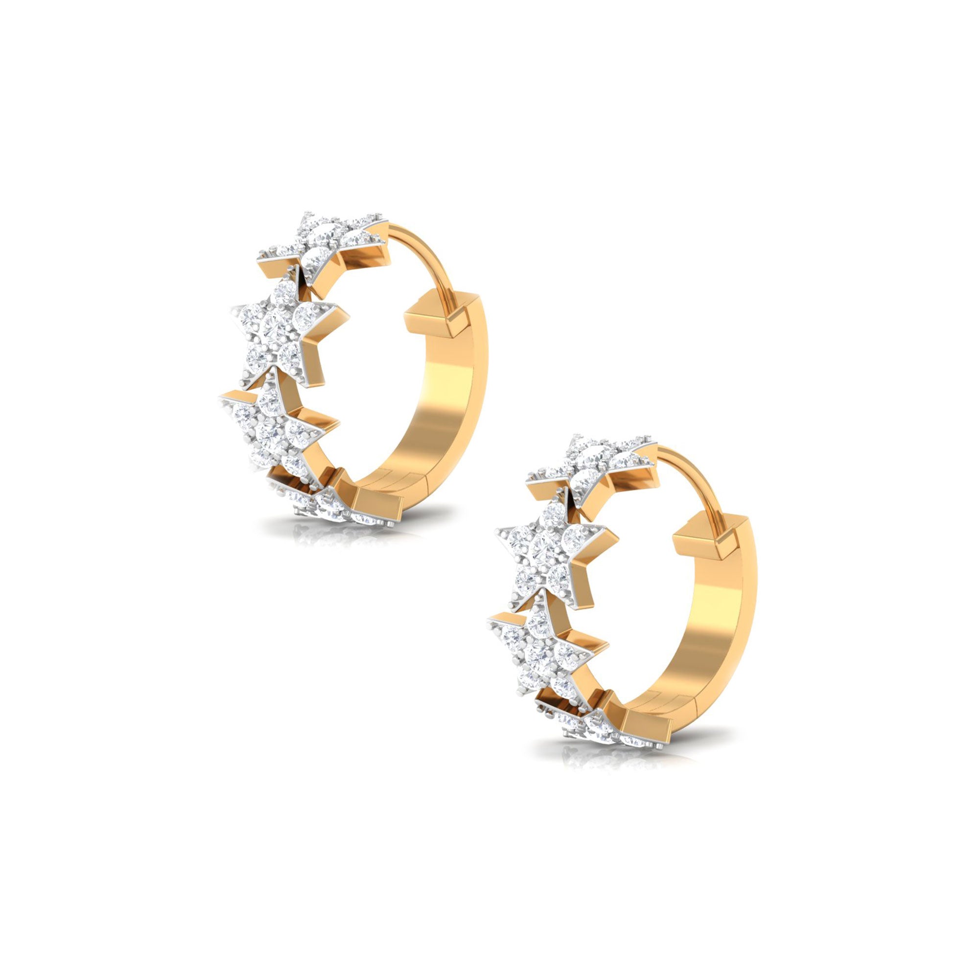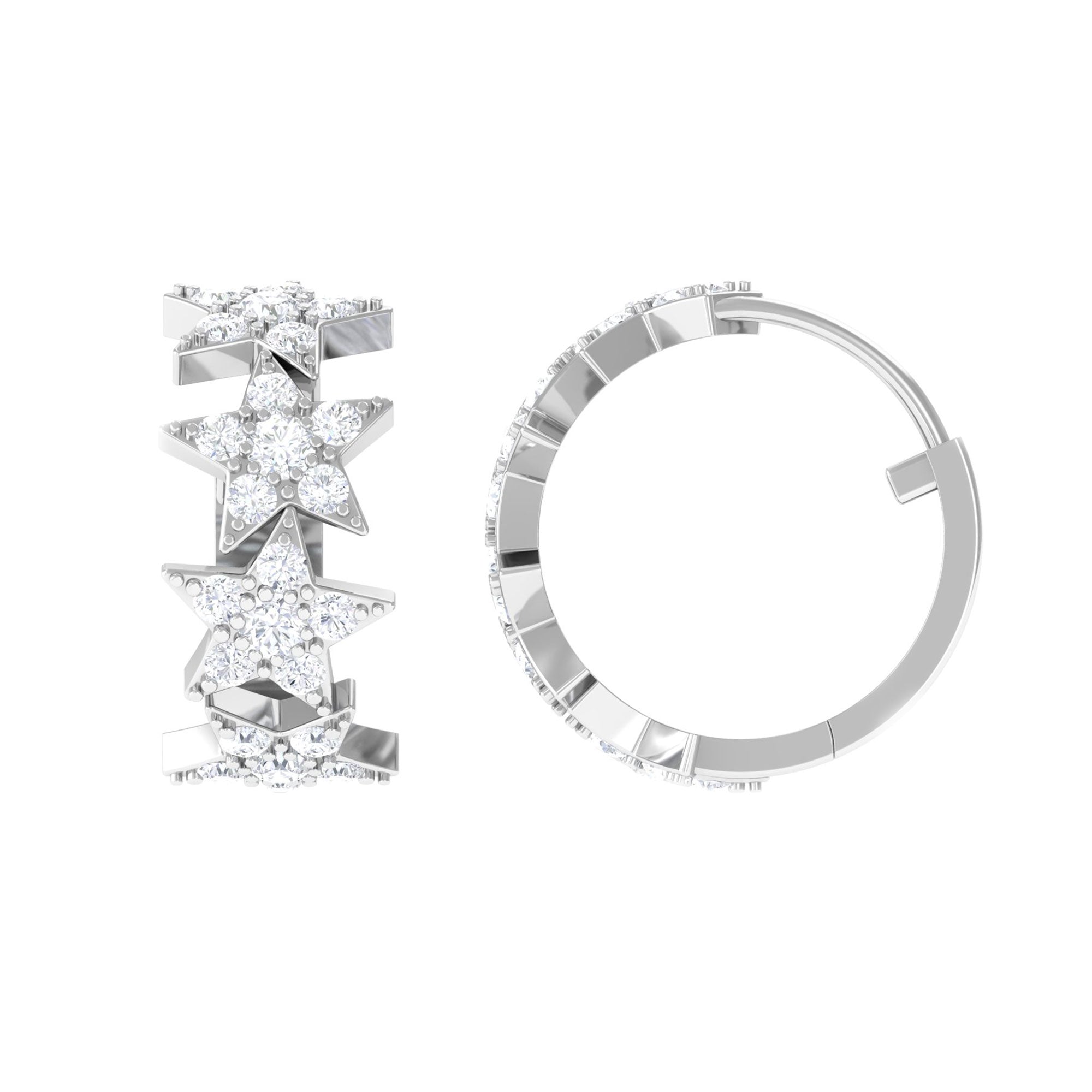 Add a touch of magic to your style with these Star Hoop Earrings. The Gold Hoops feature enchanting stars adorned with scintillating Round Cut Moissanite in a prong setting, secured comfortably with a hinged back. Elevate your casual and party look by wearing these unique Huggie Hoop Earrings. Surprise your beloved on her birthday with these stunning Star Earrings as a gift, and let her sparkle and shine wherever she goes.