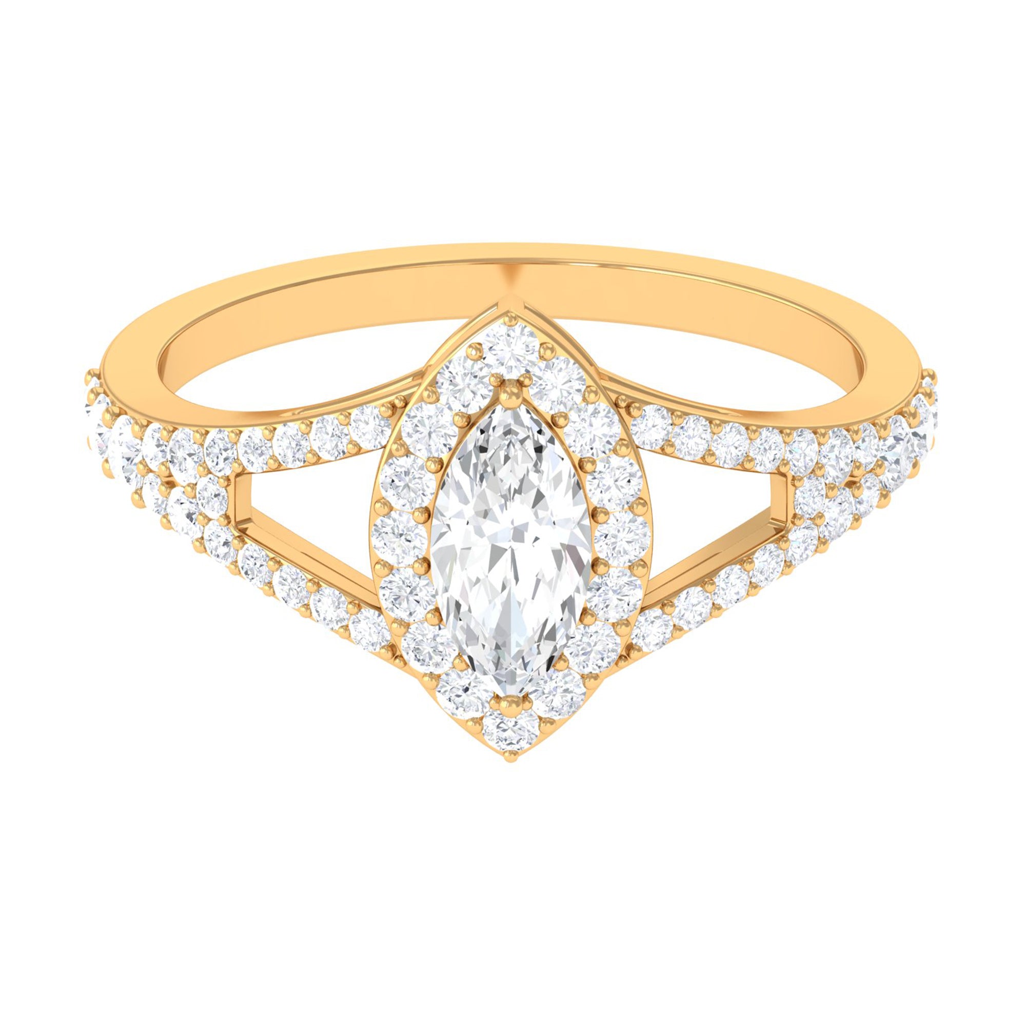 Cubic Zirconia Engagement Ring is crafted in Gold, embellished with Marquise cut Zircon to give this ring a perfect look. The Round Cut Zircon Halo and Side Stone is for a better and classic look. This CZ Engagement Ring has an exquisite Split Shank, make this ring perfect for your lady.