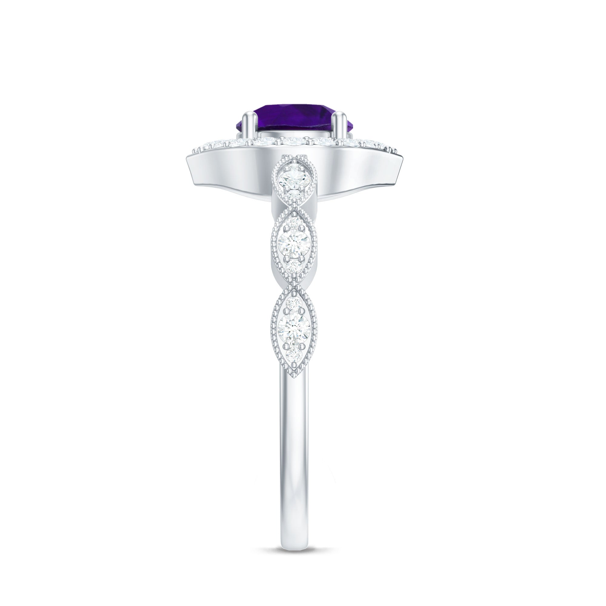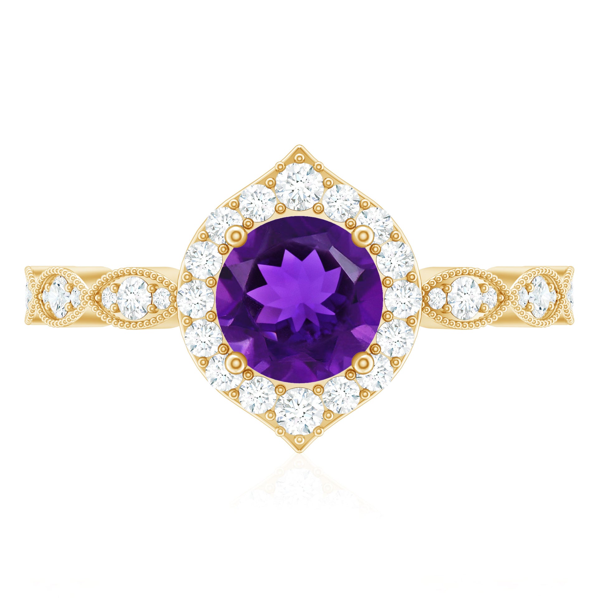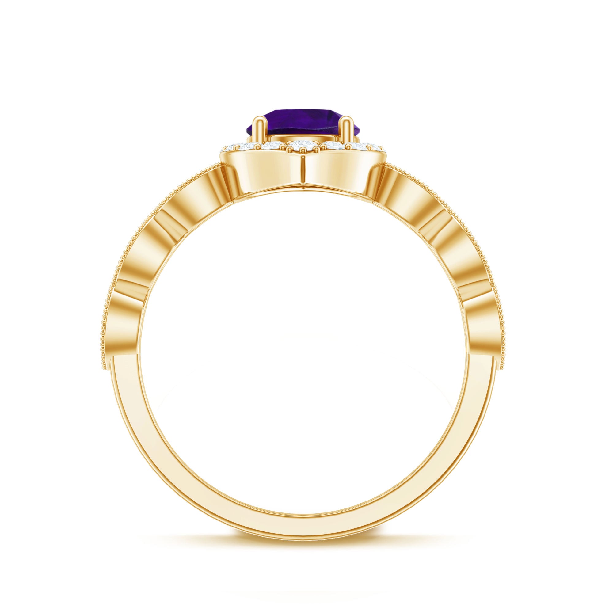 Glamorous Prong Set Amethyst sparkle along this Engagement Ring and beautifully accented by moissanite. This Timeless Amethyst Engagement Ring is made in Gold to showcase the brilliance of this scintillating ring. This Vintage Amethyst Ring is classy and has an opulent appeal.