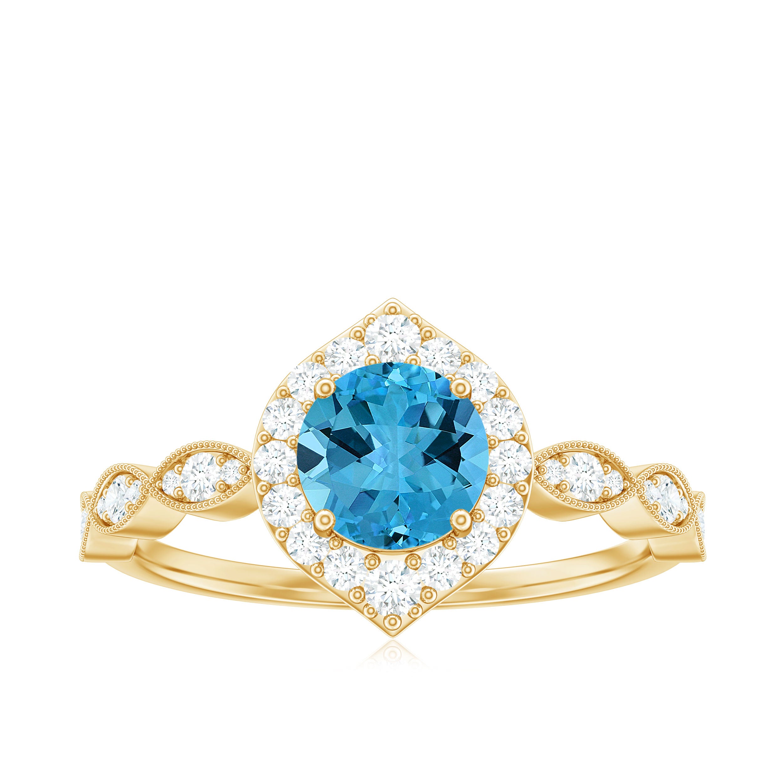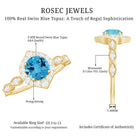 Glamorous Prong Set Swiss Blue Topaz sparkle along this Engagement Ring and beautifully accented by moissanite. This Timeless Swiss Blue Topaz Engagement Ring is made in Gold to showcase the brilliance of this scintillating ring. This Vintage Ring is classy and has an opulent appeal.