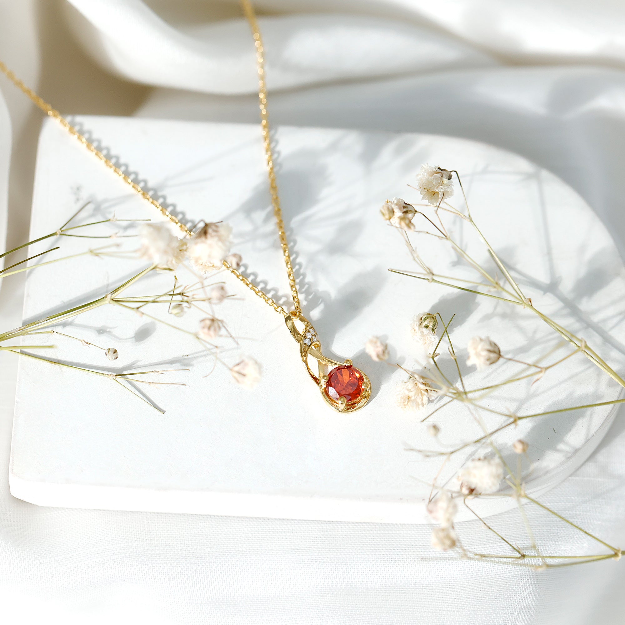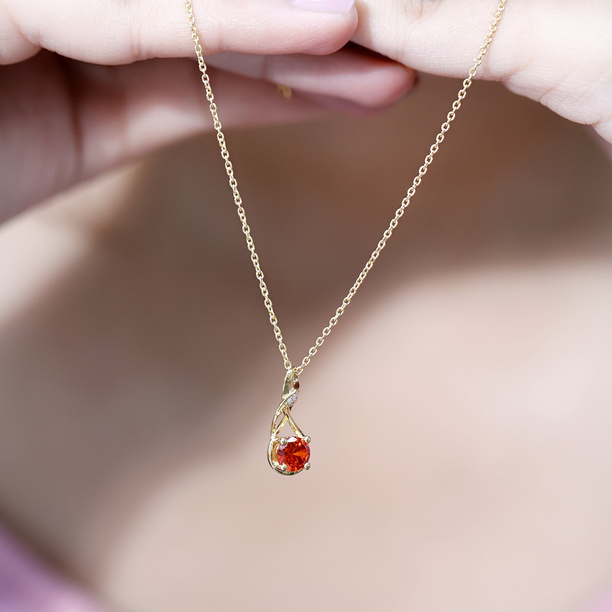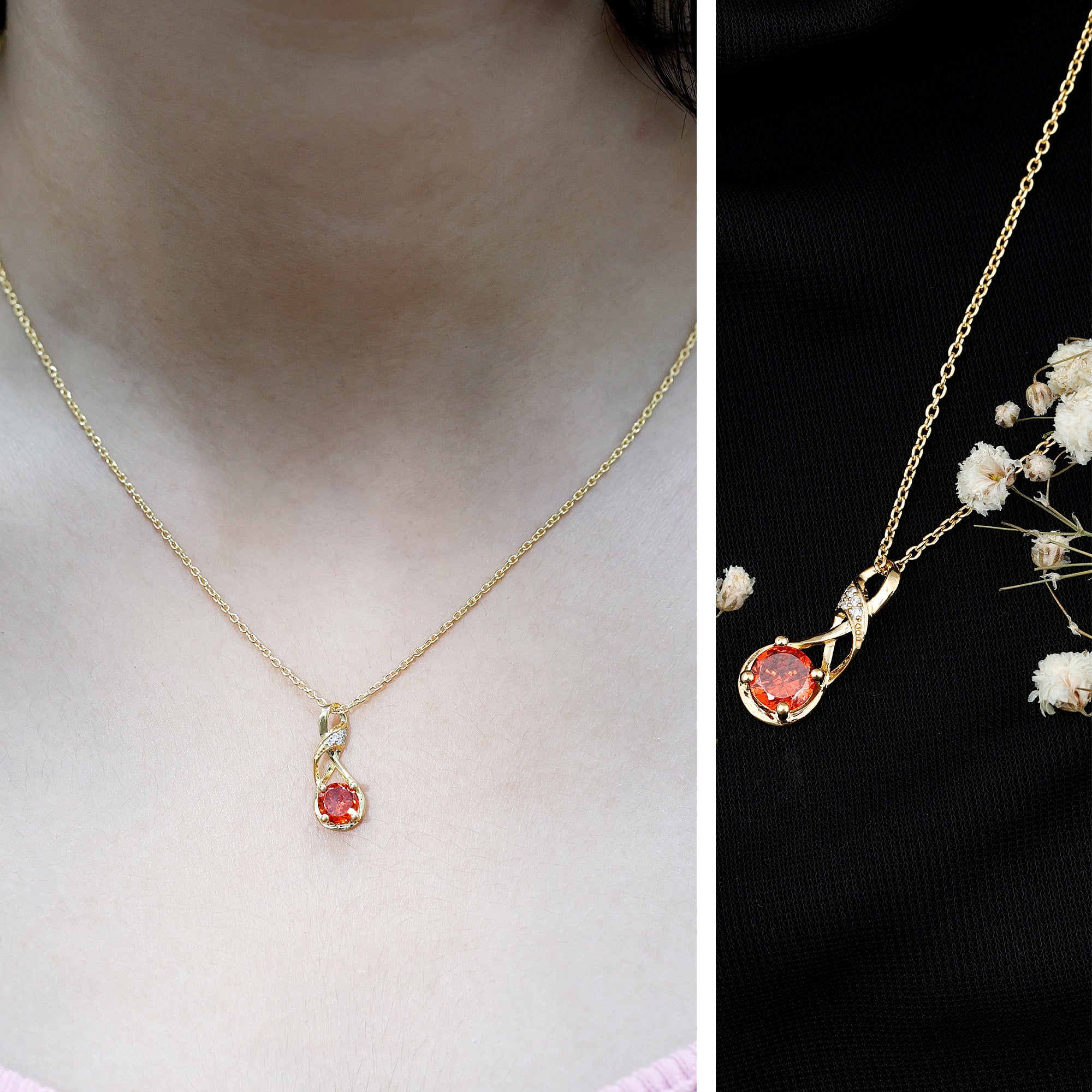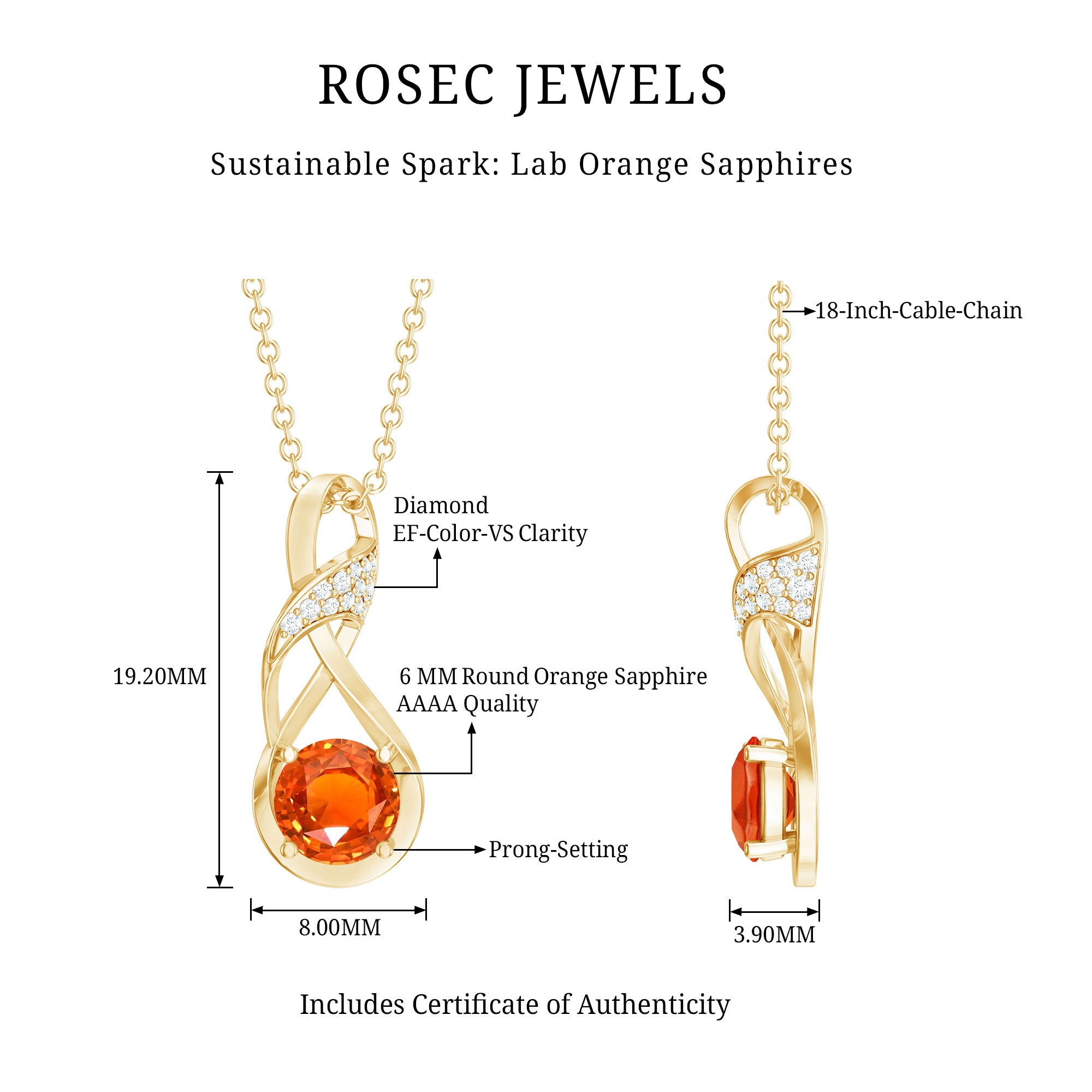 This Lab Grown Orange Sapphire Necklace is a beautiful reminder of everlasting love and connection. Thoughtfully designed and made with care, it is a meaningful piece that blends elegance with simplicity. Crafted in 14k yellow gold plated silver, the Infinity Pendant features a 6 MM round cut lab grown orange sapphire, held in a prong setting. The stone sits gently within an infinity symbol, shaped like a flowing figure eight, that represents forever. The curve of the infinity is further accented with shimmering round lab grown diamonds, adding a soft sparkle that enhances the overall look without being too bold. The Infinity Symbol Necklace hangs gracefully from a strong and comfortable chain that sits perfectly around the neck. Its lightweight design makes it easy to wear daily, while the thoughtful details give it a special occasion feel. Whether worn alone or layered, it carries deep meaning, a symbol of love that has no end. With its modern yet timeless design, this Sapphire and Diamond Necklace makes a perfect gift for someone special or a personal piece to celebrate your own journey. It comes beautifully packaged in a signature jewelry box and includes a certificate of authenticity, making it ready to gift for birthdays, anniversaries, or any moment that matters.
