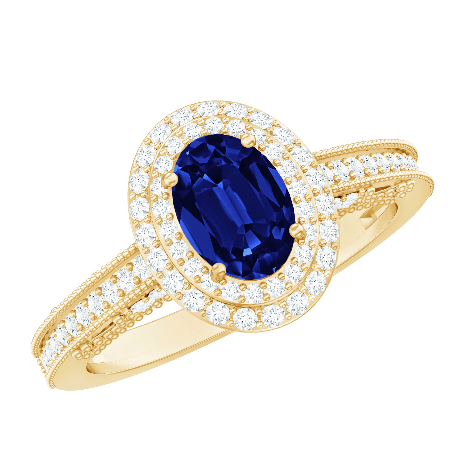 Timeless yet undeniably captivating, this Vintage Inspired Engagement Ring brings romance and elegance together in the most enchanting way. At the center of this stunning piece rests a brilliant 5X7 mm Oval Shape Lab Created Blue Sapphire set in Prong Setting, glowing with deep, royal blue tones that symbolize loyalty, passion and everlasting devotion. Surrounding the center stone is a dazzling Double Halo of sparkling Diamond stones that amplify its beauty, creating a radiant frame that catches the light from every angle. The band itself is adorned with shimmering Diamond stones and intricate Beaded detailing, adding texture and a touch of antique charm that makes the design truly special. Every element of this Oval Engagement Ring is thoughtfully crafted to celebrate love stories that deserve something extraordinary. Whether it marks the beginning of a forever journey or becomes a treasured symbol of commitment, this Lab Grown Blue Sapphire Engagement Ring speaks of romance in the most beautiful way. Presented in a signature jewelry box and available in multiple ring sizes, this Double Halo Engagement Ring is ready to become part of a moment that will be remembered for a lifetime.