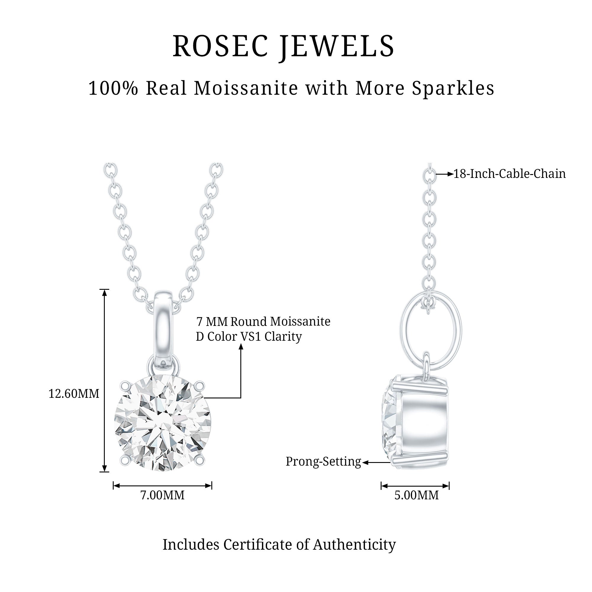 Treat your special lady to something timeless and meaningful, just like our Solitaire Moissanite Necklace. Made by Rosec Jewels, this Single Stone Pendant showcases a gorgeous 7 MM round cut moissanite set in prong setting for that classy vibe. This 1 Carat Moissanite Necklace is not just any jewelry, it is a must-have for every woman’s collection. The Moissanite Locket features a simple bail that lets the cable chain slide through effortlessly. You can choose to get this necklace with or without a chain, based on what she likes. By giving her this Round Moissanite Necklace, you will enhance her jewelry collection with a touch of luxury she can flaunt anytime, anywhere. Plus, the secure Signature Jewelry Box packaging not only adds an element of surprise but also provides safe storage for her treasured piece. The dazzling beauty of this Solitaire Pendant Necklace makes it ideal for everyday wear or dressing up for special occasions.