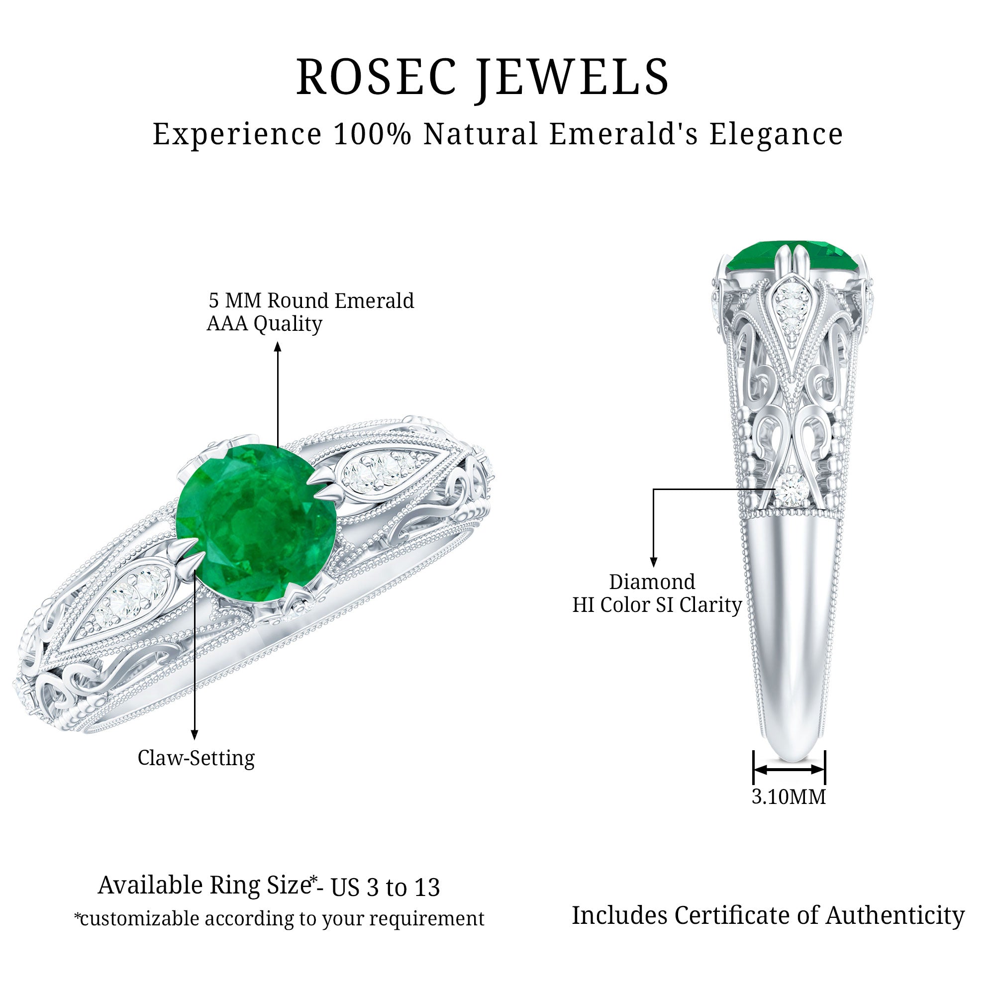 Step back in time with this Vintage Looking Engagement Ring, where vintage charm meets modern elegance. This stunning Solitaire Engagement Ring features a rich 5 mm Round Shape Emerald, its deep green hue exuding timeless romance and strength, accentuated by sparkling Diamond stones. The intricate Beaded Detailing along the band adds a touch of old-world craftsmanship, elevating the design with a sense of history and sophistication. This Vintage Emerald Engagement Ring is carefully crafted to tell a story of love that transcends time, capturing the essence of a vintage masterpiece. Whether you are proposing or celebrating an anniversary, this Emerald Diamond Ring is a symbol of eternal devotion, designed to make the moment unforgettable. Presented in a signature jewelry box and available in a range of sizes, this Real Emerald Engagement Ring is ready to be a part of your journey together.