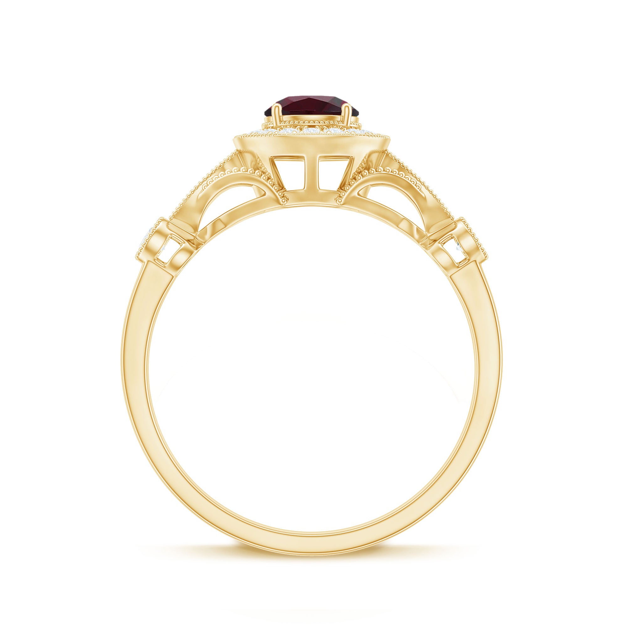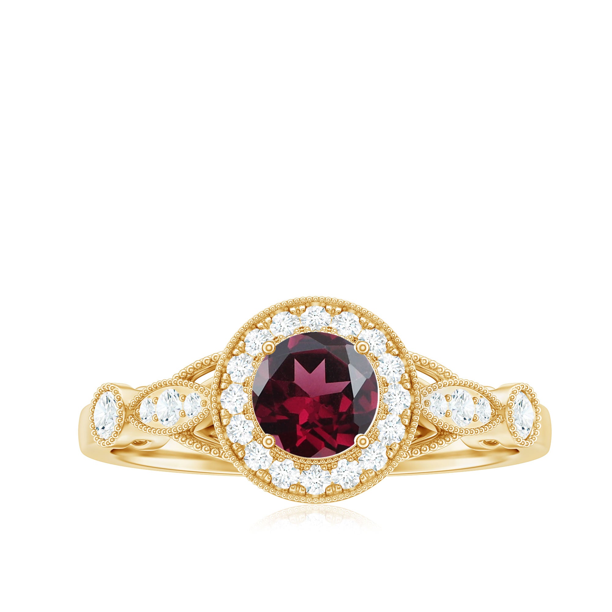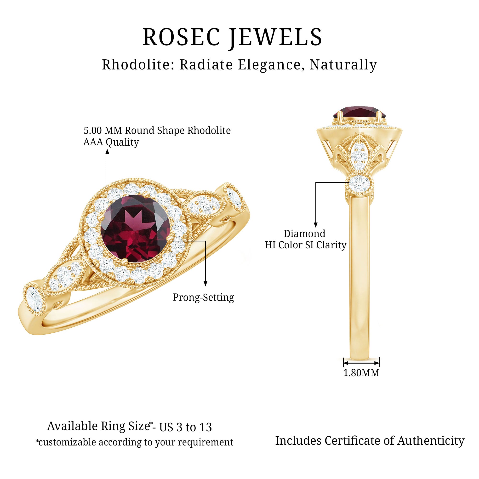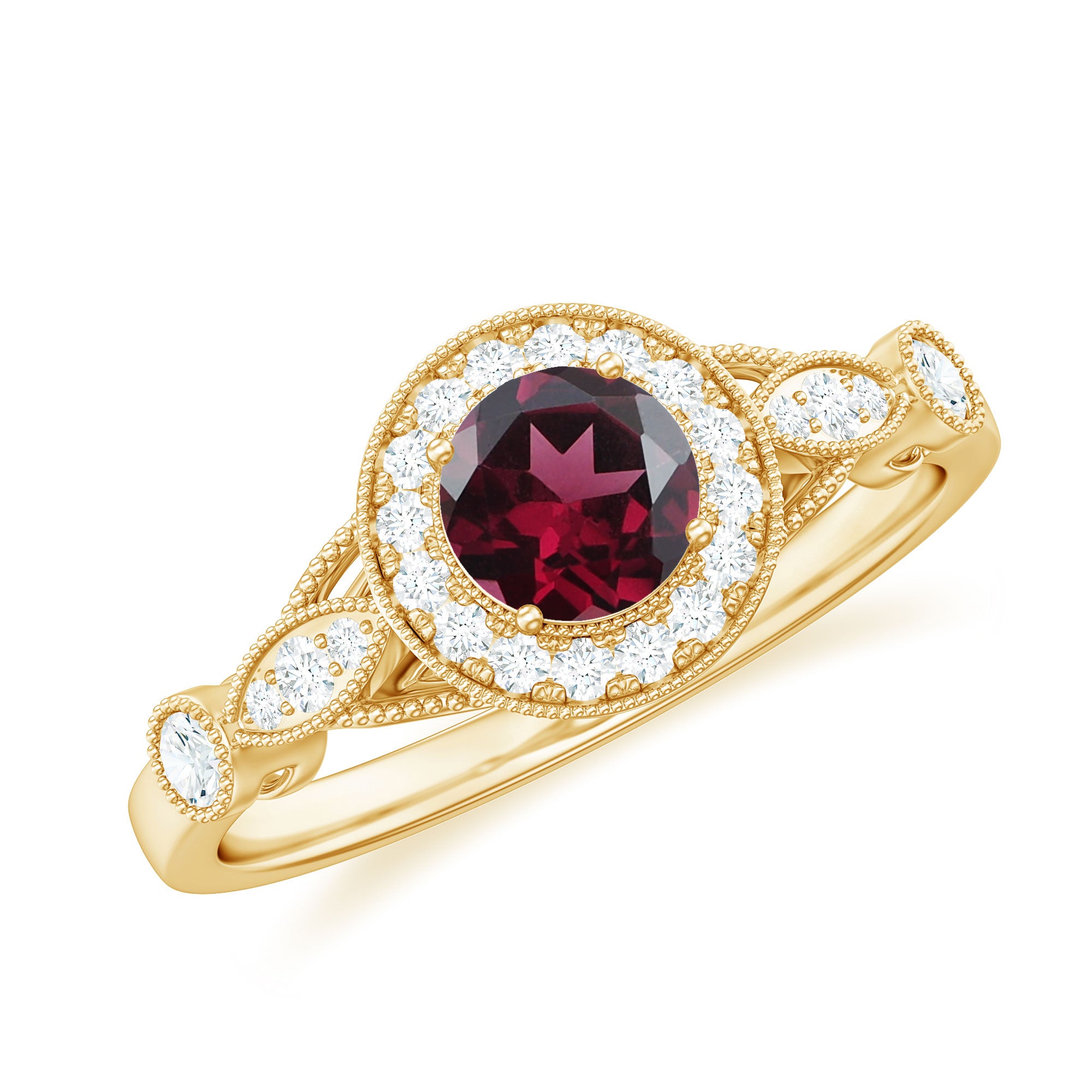 The Vintage Engagement Ring is adorned with 5 MM Round Shape Rhodolite in 4 Prong Setting mounted in Solid Gold and embellished with Round Diamond arranged in Halo on the Solitaire Ring. The Engagement Ring is also decorated with Milgrain for a Vintage look.