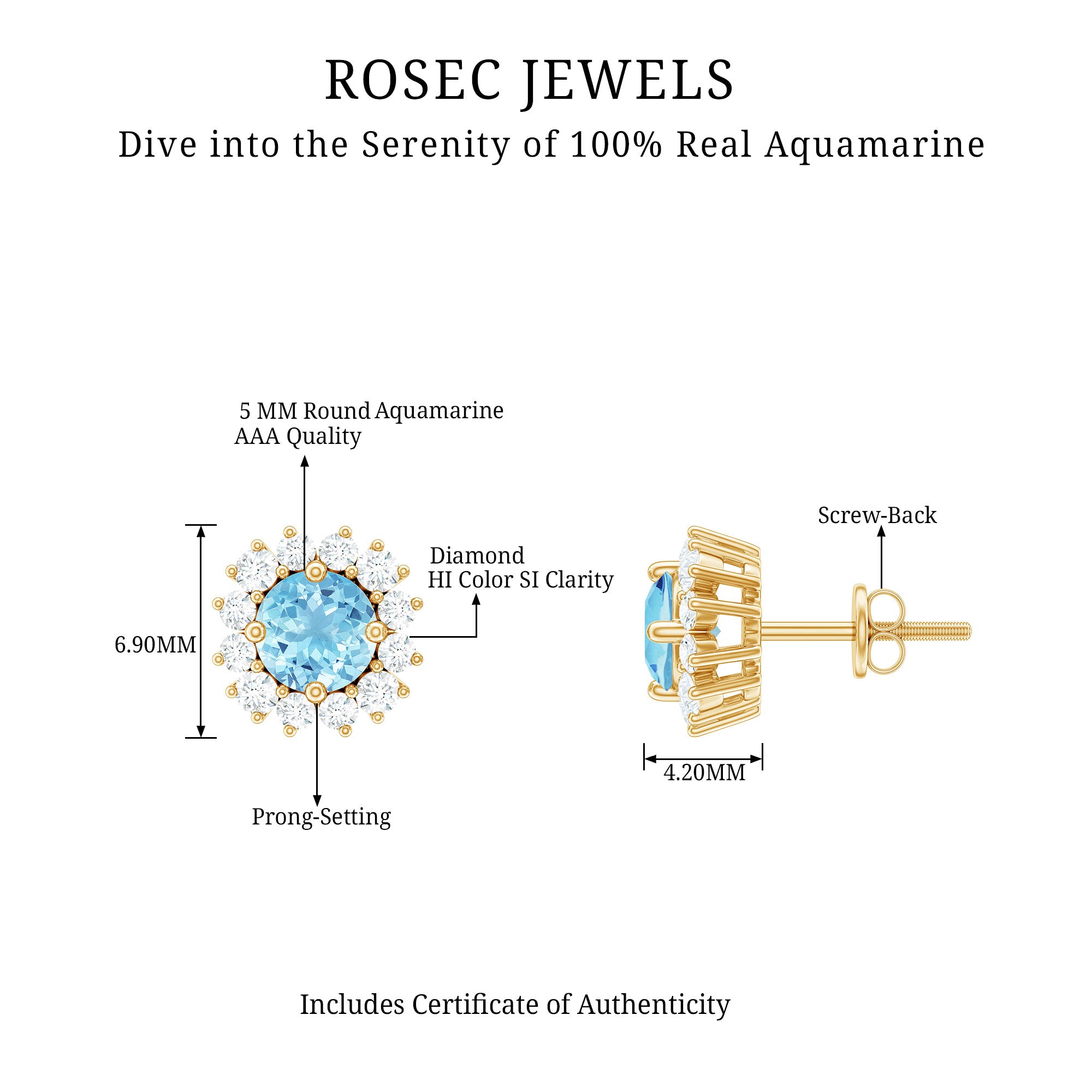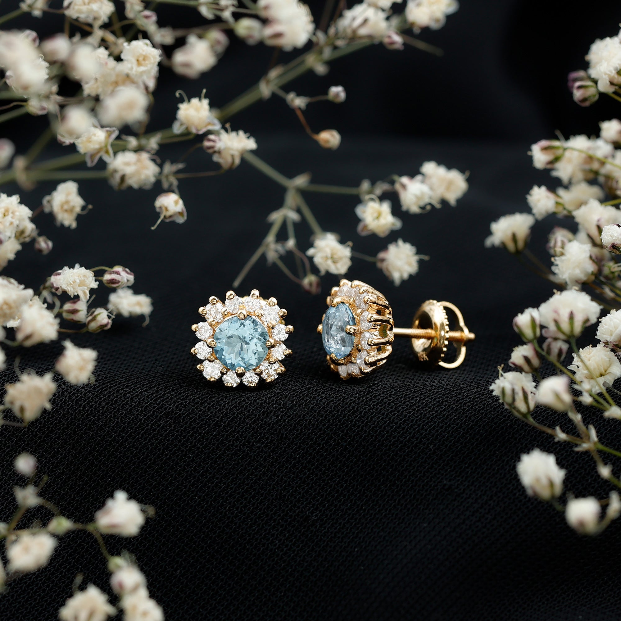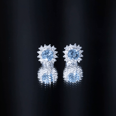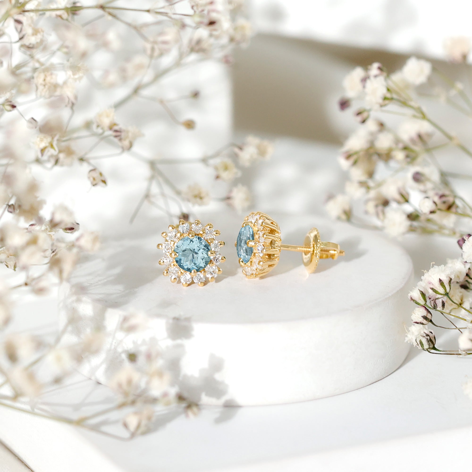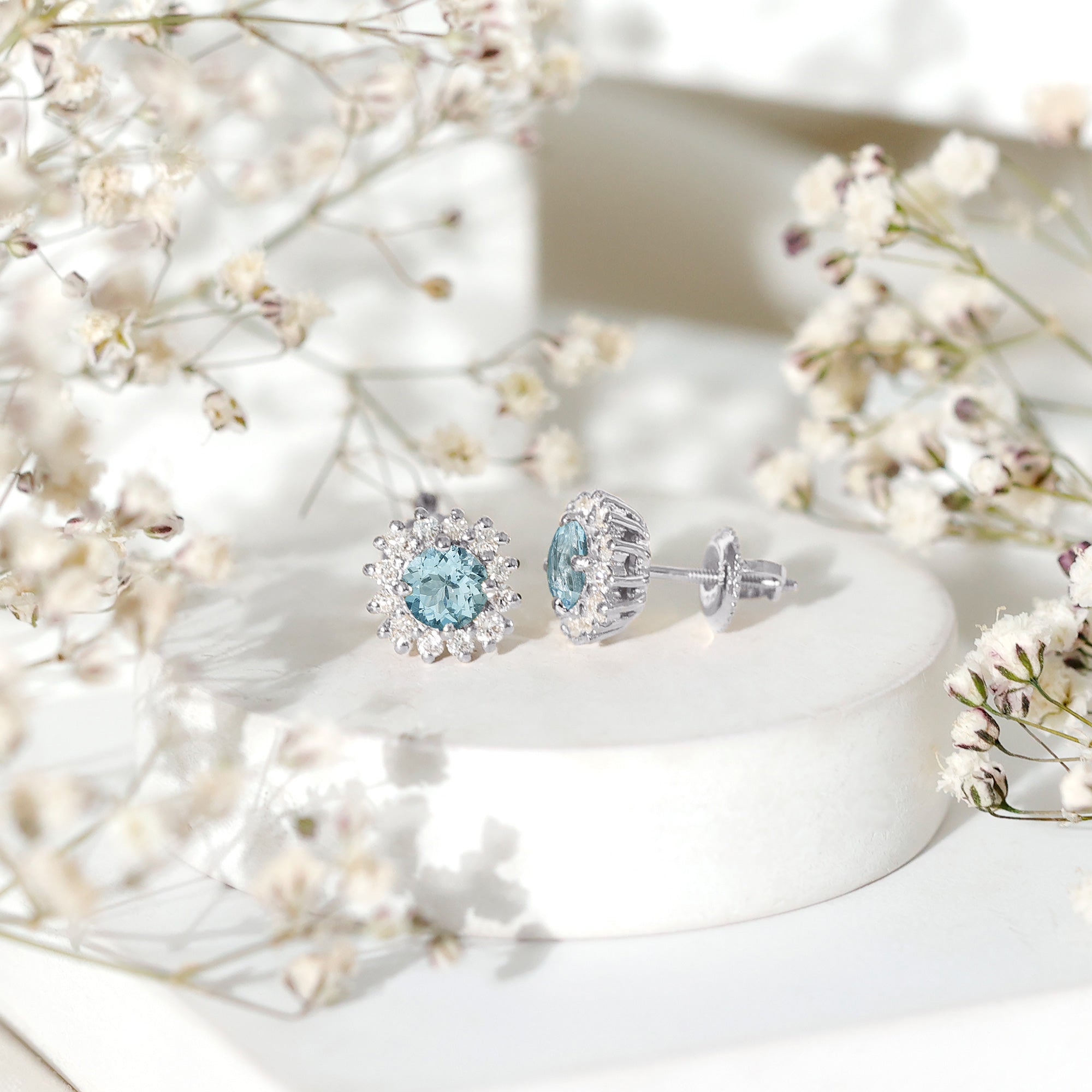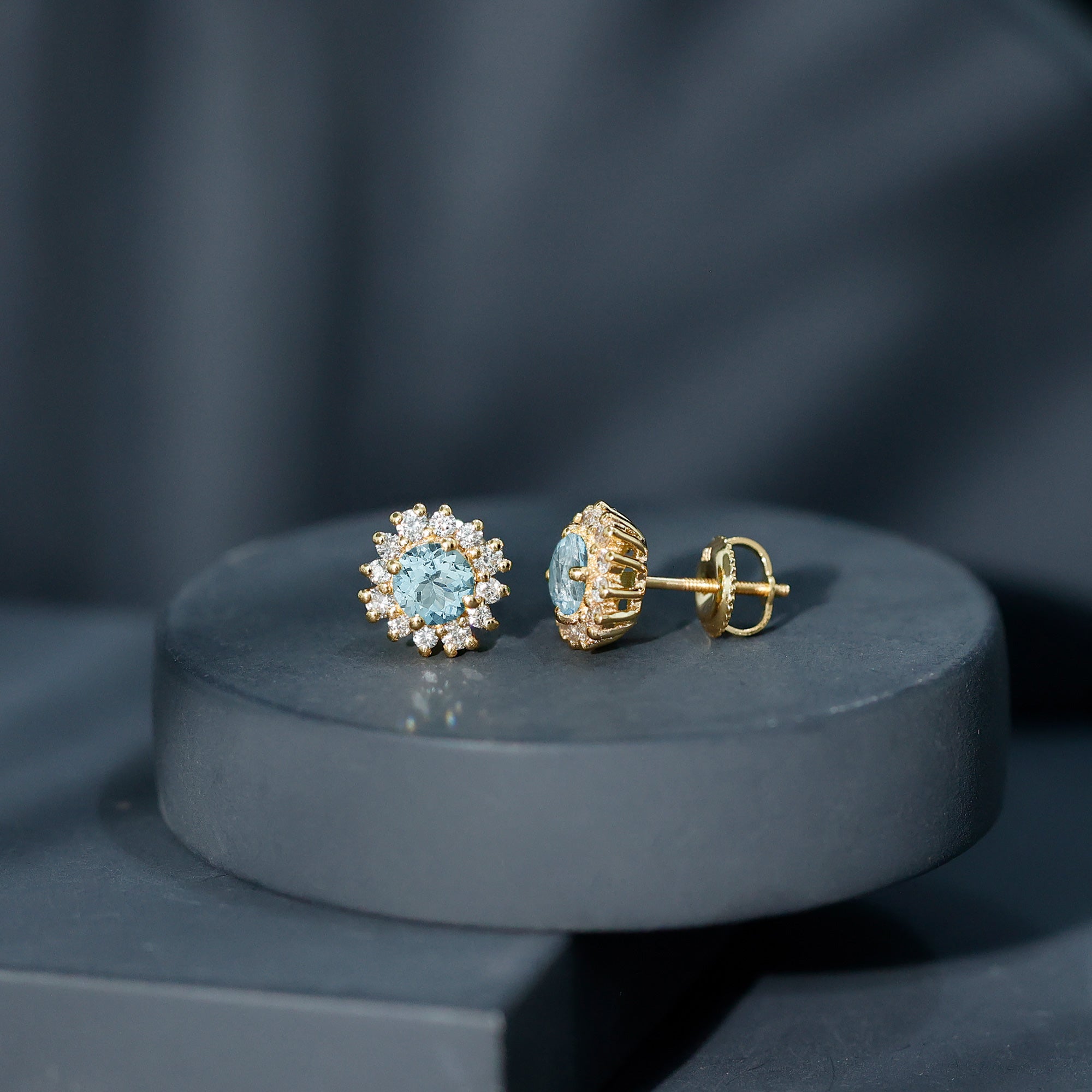 A Celebration without Gift is Incomplete, a Gift of Jewelry will bring smiles of delight on Mothers Day. Explore these Stud Earrings adorned with Round Shape Aquamarine in Prong Setting with Halo Diamond, crafted in Solid Gold Metal.