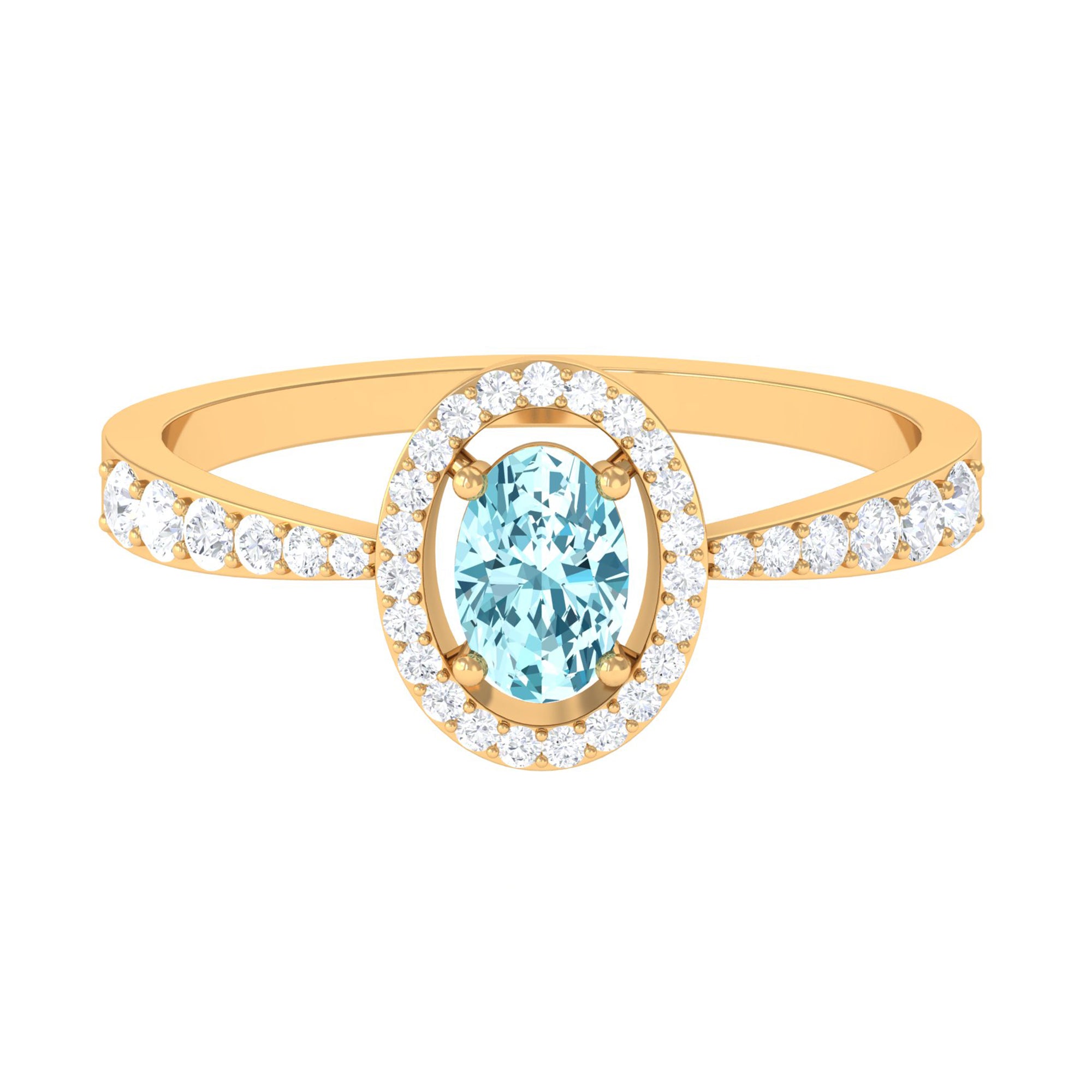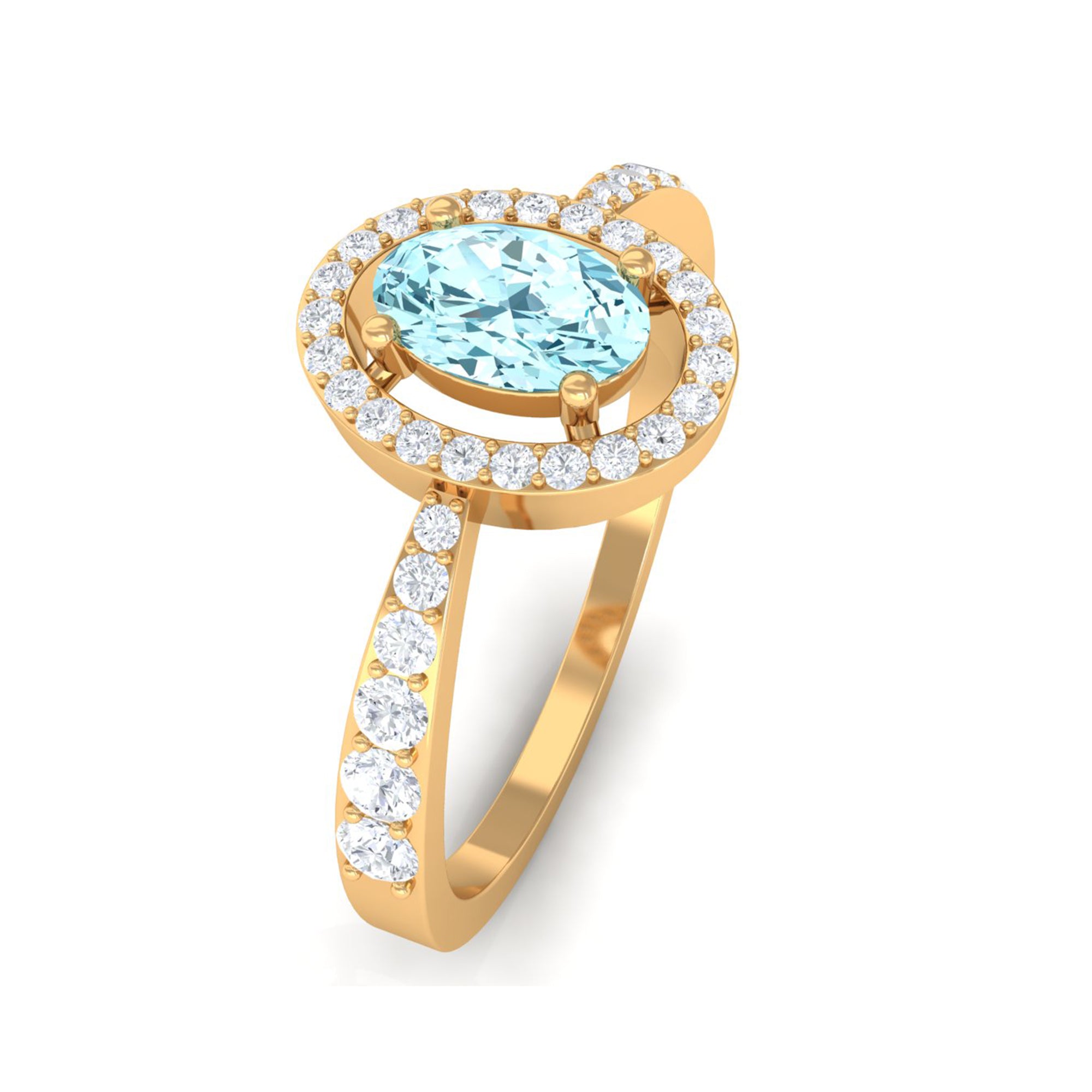 Start your journey of love with this Beautiful Aquamarine and Diamond Engagement Ring. It is embellished with Oval cut Aquamarine in Prong Setting and Round Shape Diamond creating a Floating Halo with Side Stones on the half Shank. This Aquamarine Engagement Ring is Crafted in Gold to make it a piece of women Fine jewelry.