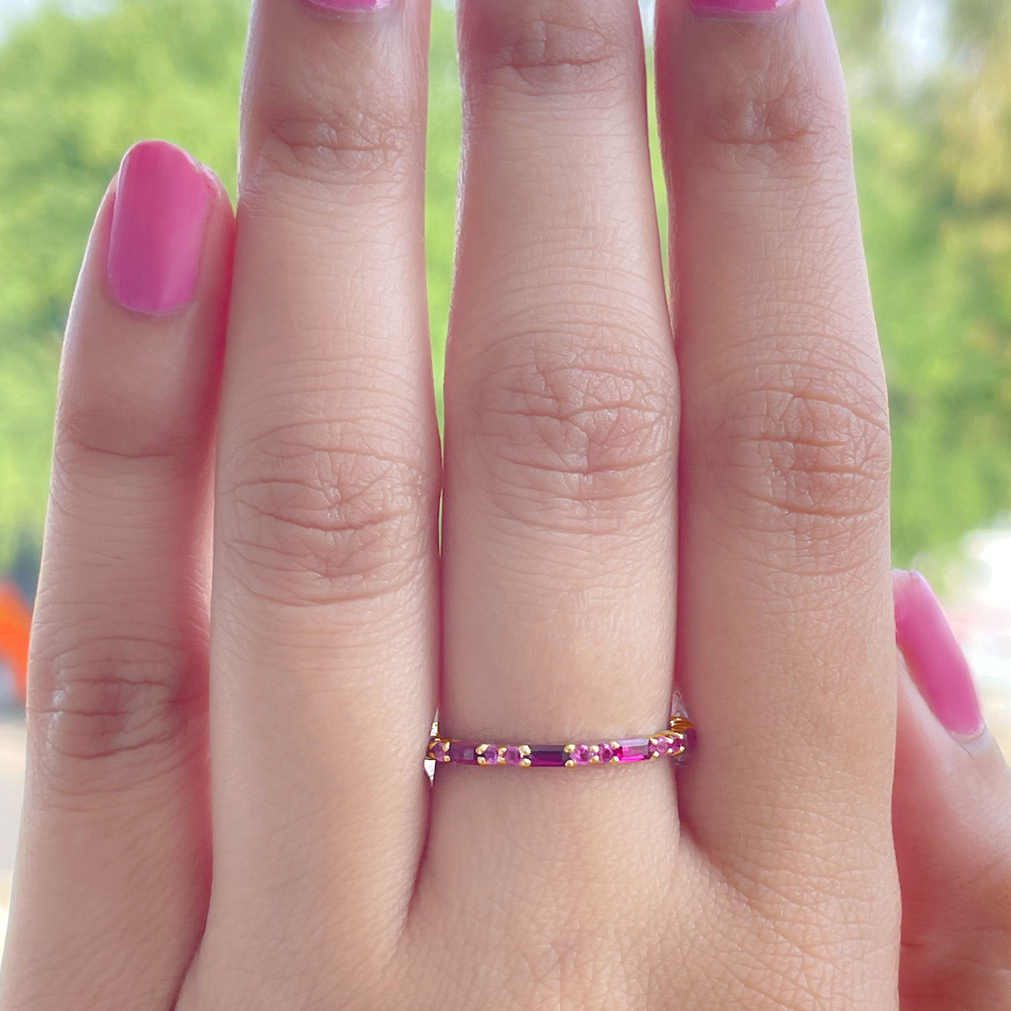Propose to the love of your life with this elegant and modern Lab Created Ruby Ring. The ring is adorned with a combination of baguette and round cut lab created Ruby in a stunning prong setting. The ring is crafted with solid gold, adding a touch of sophistication to the design. Make a lasting impression with this beautiful and timeless ring.