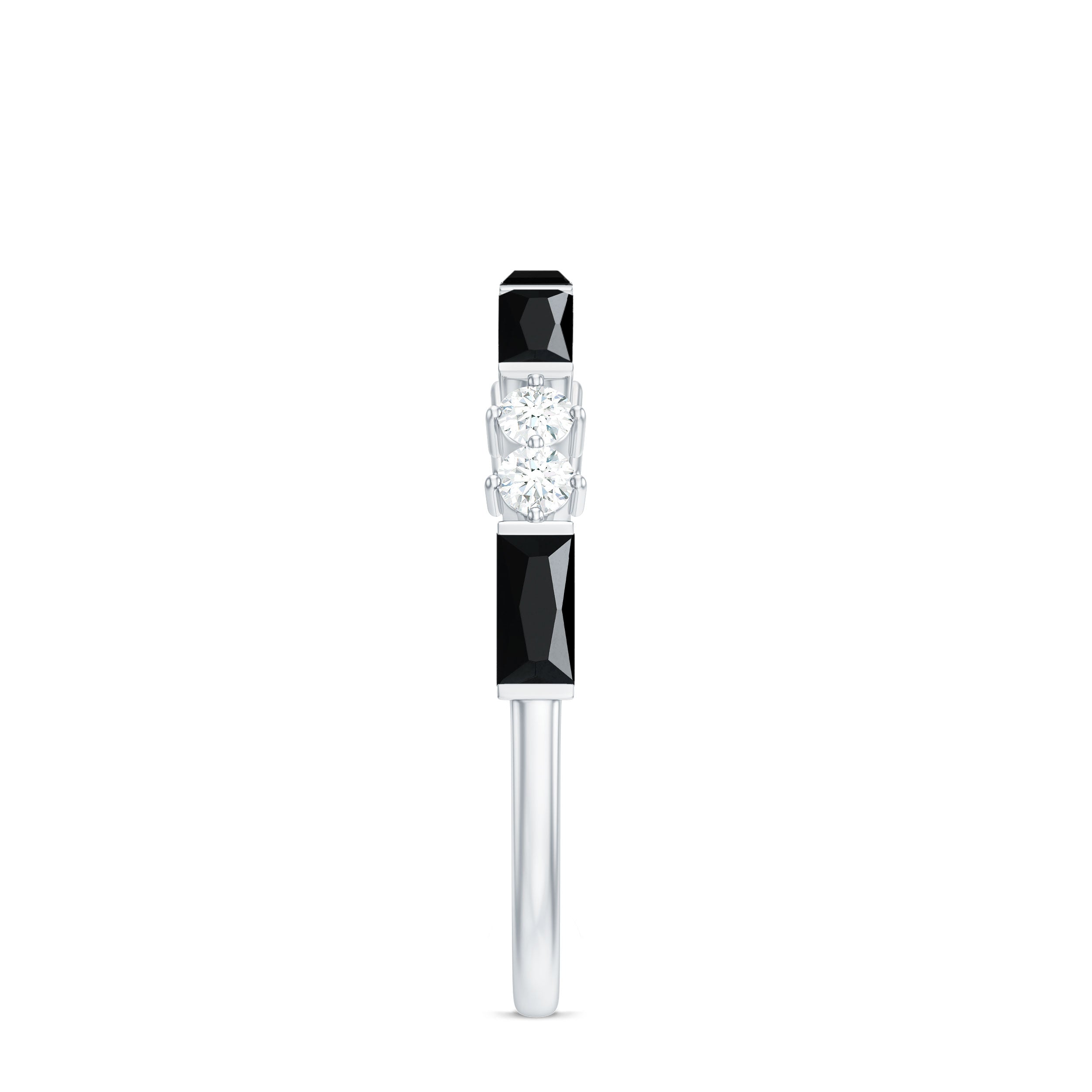 Strike out a wonderful statement on any special occasion by wearing this elegant Half Eternity Ring adorned with Baguette Shape Created Black Diamond and Round Shape White Diamond gemstones.Lab Created Black Diamond - Brilliant Cut Lab Created Black Diamond Gemstone exhibits AAAA Quality and possess vibrant color. It is Certified and inclusion free, which makes it a preferable and highly desirable gem. It is a perfect alternate option of Black Diamond in budget. Exceptional Durability and vitreous Luster of this stone makes it a popular cost-friendly choice. Diamond - HI Color SI Clarity and precise Carat Weight possessed by Brilliant Cut Diamond indicates its preciousness. April Birthstone summons good fortune, serenity, and wealth. It is Real and Certified, helps in enhancing physical health and evokes emotions. Diamond shows great Durability and Luster, forever sparkling nature of diamond makes it the most desirable stone of all times.