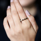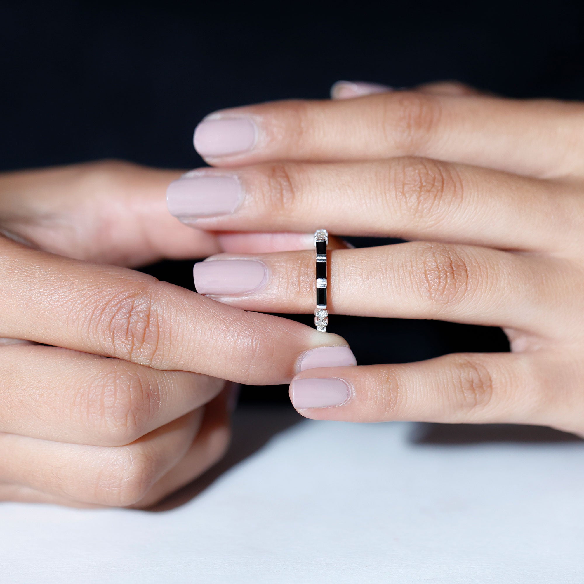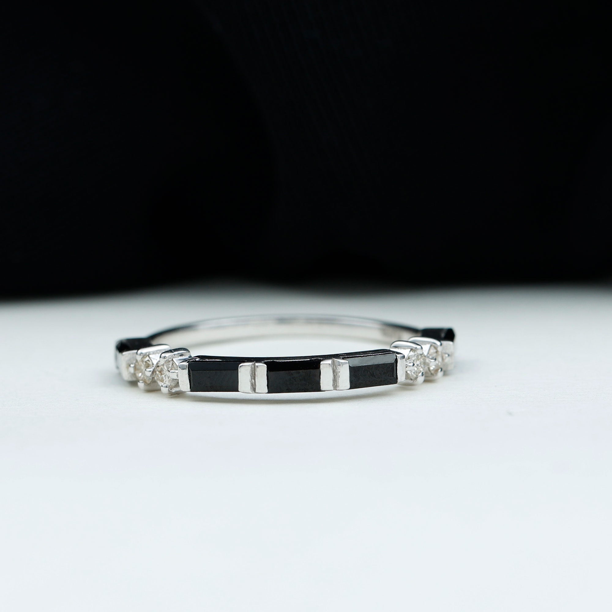 Strike out a wonderful statement on any special occasion by wearing this elegant Half Eternity Ring adorned with Baguette Shape Created Black Diamond and Round Shape White Diamond gemstones.Lab Created Black Diamond - Brilliant Cut Lab Created Black Diamond Gemstone exhibits AAAA Quality and possess vibrant color. It is Certified and inclusion free, which makes it a preferable and highly desirable gem. It is a perfect alternate option of Black Diamond in budget. Exceptional Durability and vitreous Luster of this stone makes it a popular cost-friendly choice. Diamond - HI Color SI Clarity and precise Carat Weight possessed by Brilliant Cut Diamond indicates its preciousness. April Birthstone summons good fortune, serenity, and wealth. It is Real and Certified, helps in enhancing physical health and evokes emotions. Diamond shows great Durability and Luster, forever sparkling nature of diamond makes it the most desirable stone of all times.