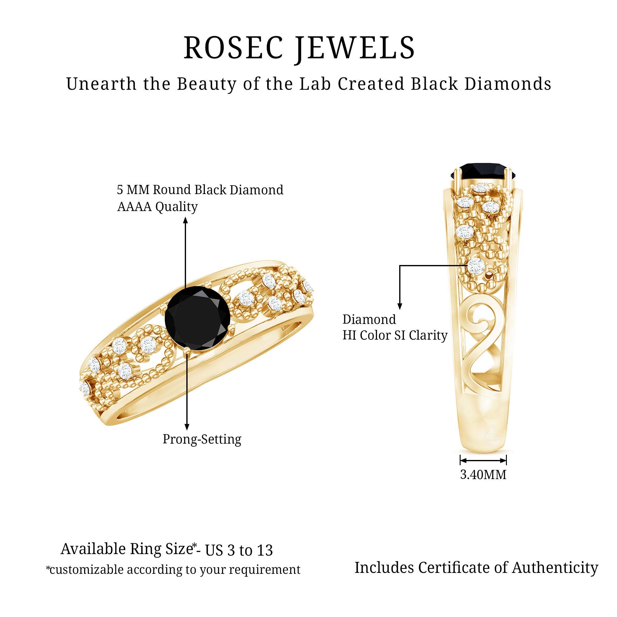 This stunning Solitaire Band Ring is a unique and elegant piece of jewelry. The center stone is a mesmerizing created Black Diamond, drawing attention to the beauty and sophistication of this ring. The band itself is beautifully decorated with sparkling Diamond stones and beaded gold, adding extra glitz and glamour to this already stunning piece. The combination of created Black Diamonds and beaded gold creates a modern, yet timeless look that will never go out of style. This ring is perfect for those looking for a standout piece of jewelry to add to their collection.