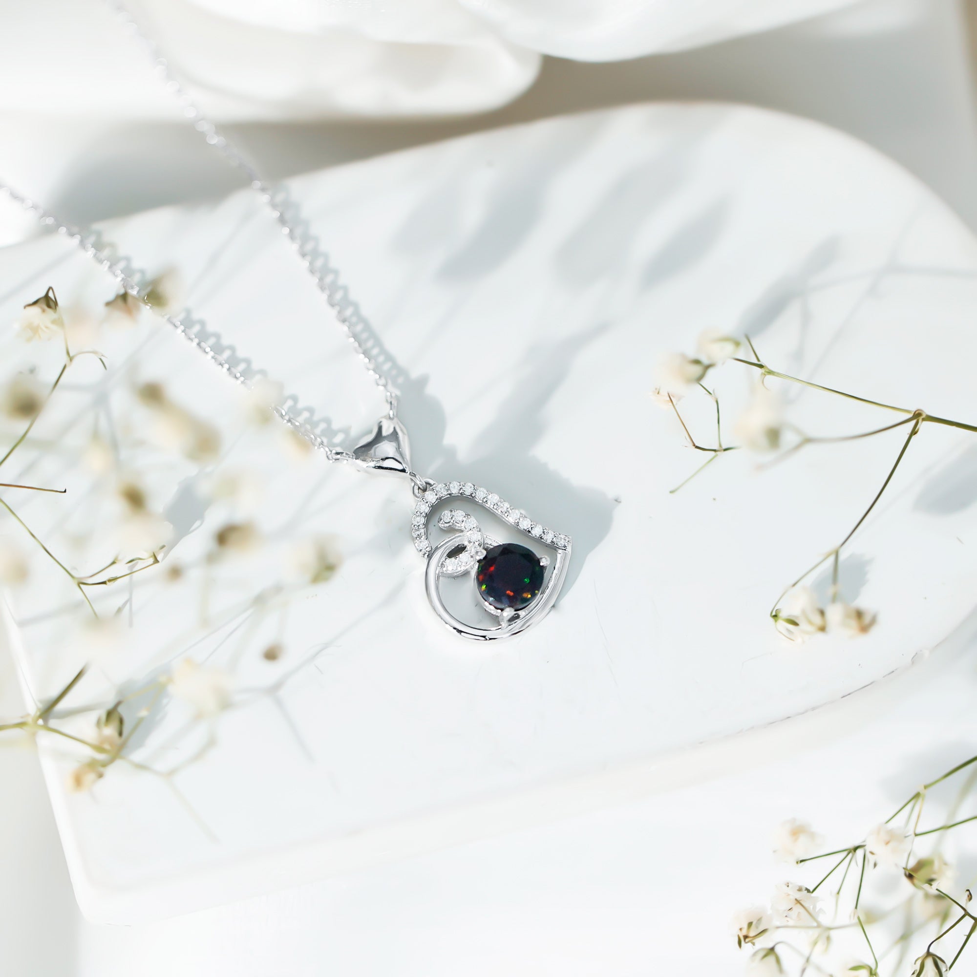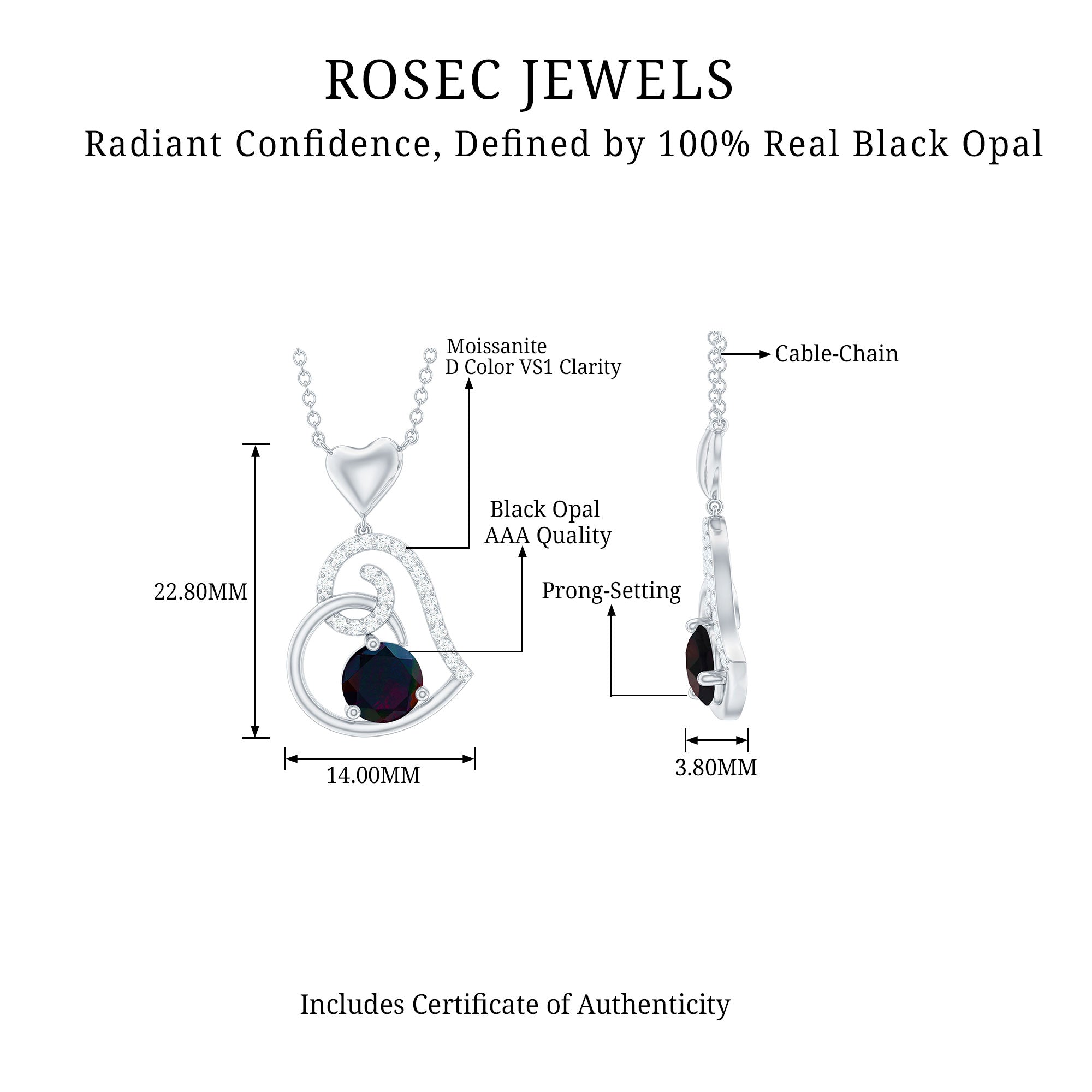 Add a touch of enchantment to your look with this stunning Heart Drop Pendant, crafted in Solid Gold and adorned with a Round Shape Black Opal as a Solitaire in a 3 Prong Setting, and a Round Shape Moissanite in a Surface Prong Setting. Let the brilliance of these precious gemstones light up your world and make you shine.