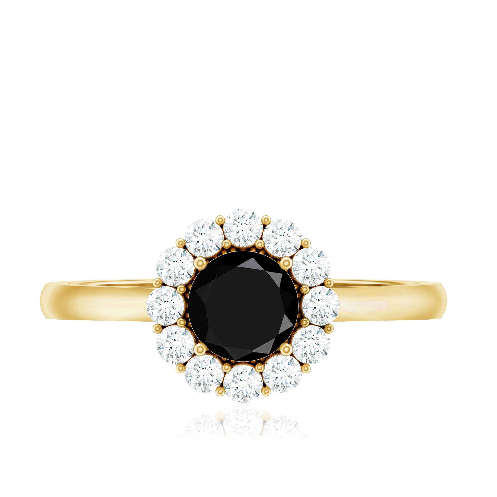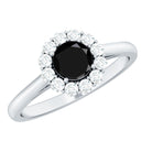 Enhance your beauty with Floating Halo Engagement Ring is embellished with Round Shape Black Spinel Set as a solitaire in a prong setting and Round Shape Diamond in a floating Halo. This Engagement Ring is composed of solid gold.
