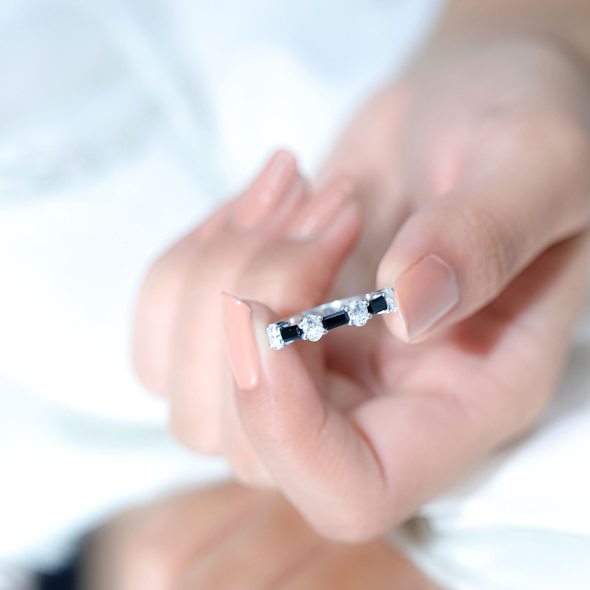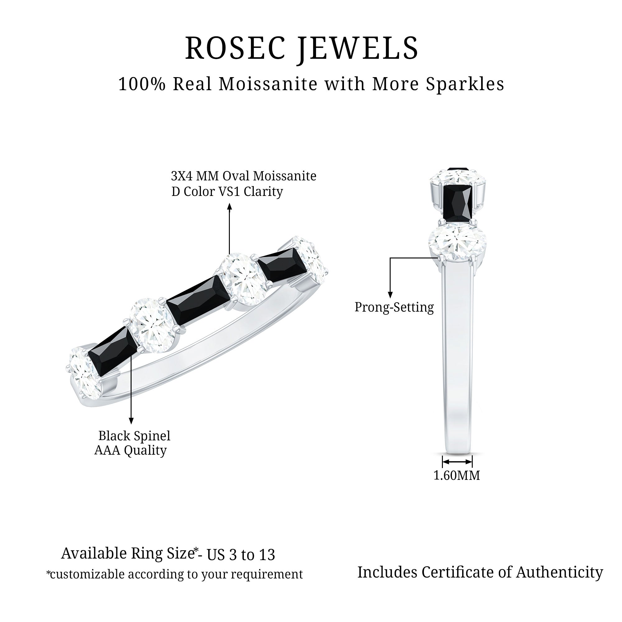 Lift up your look with this Half Eternity Ring, it is featuring Baguette Cut Black Spinel and Oval Cut Moissanite, held in Prong Setting to give this ring enchanting appeal. The Black Spinel and Moissanite are held alternative to each other. This Semi Eternity Ring will add effortless grace and charm to your look.