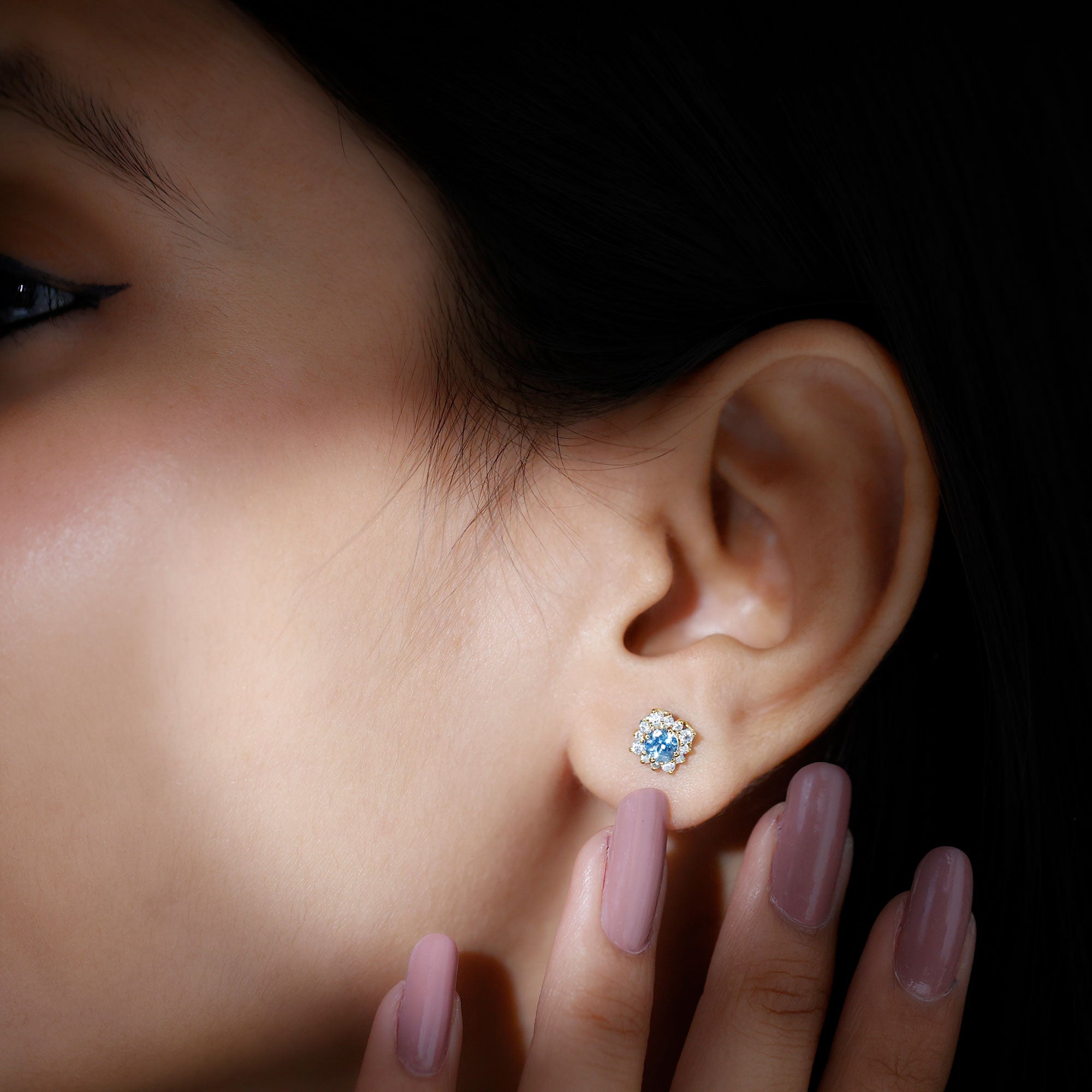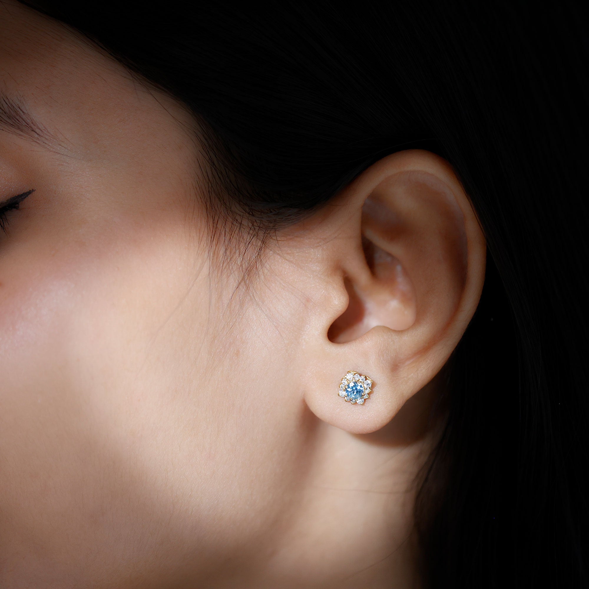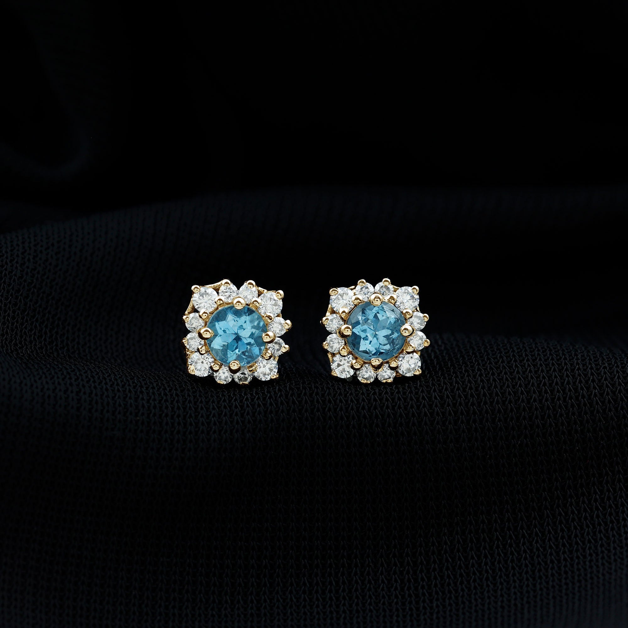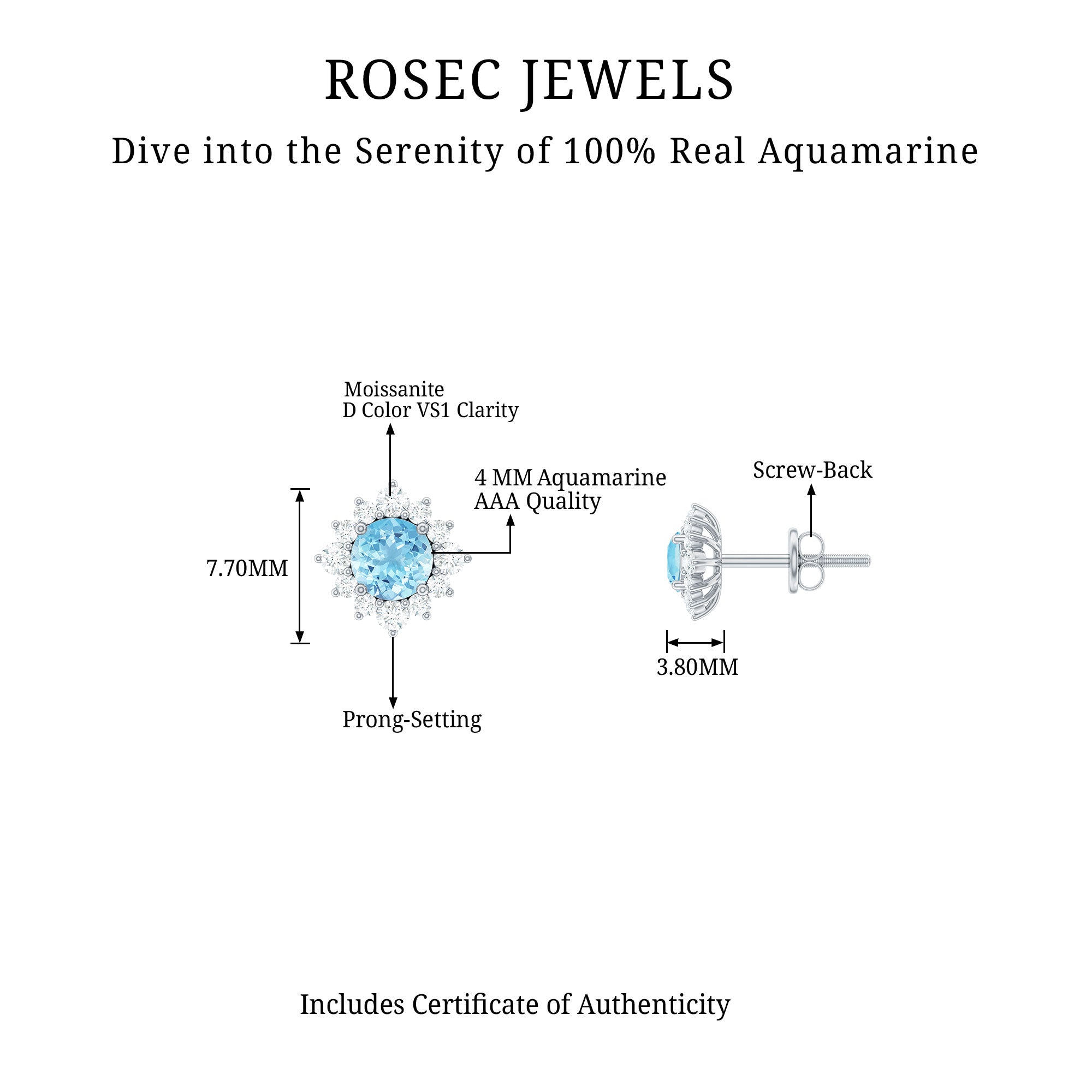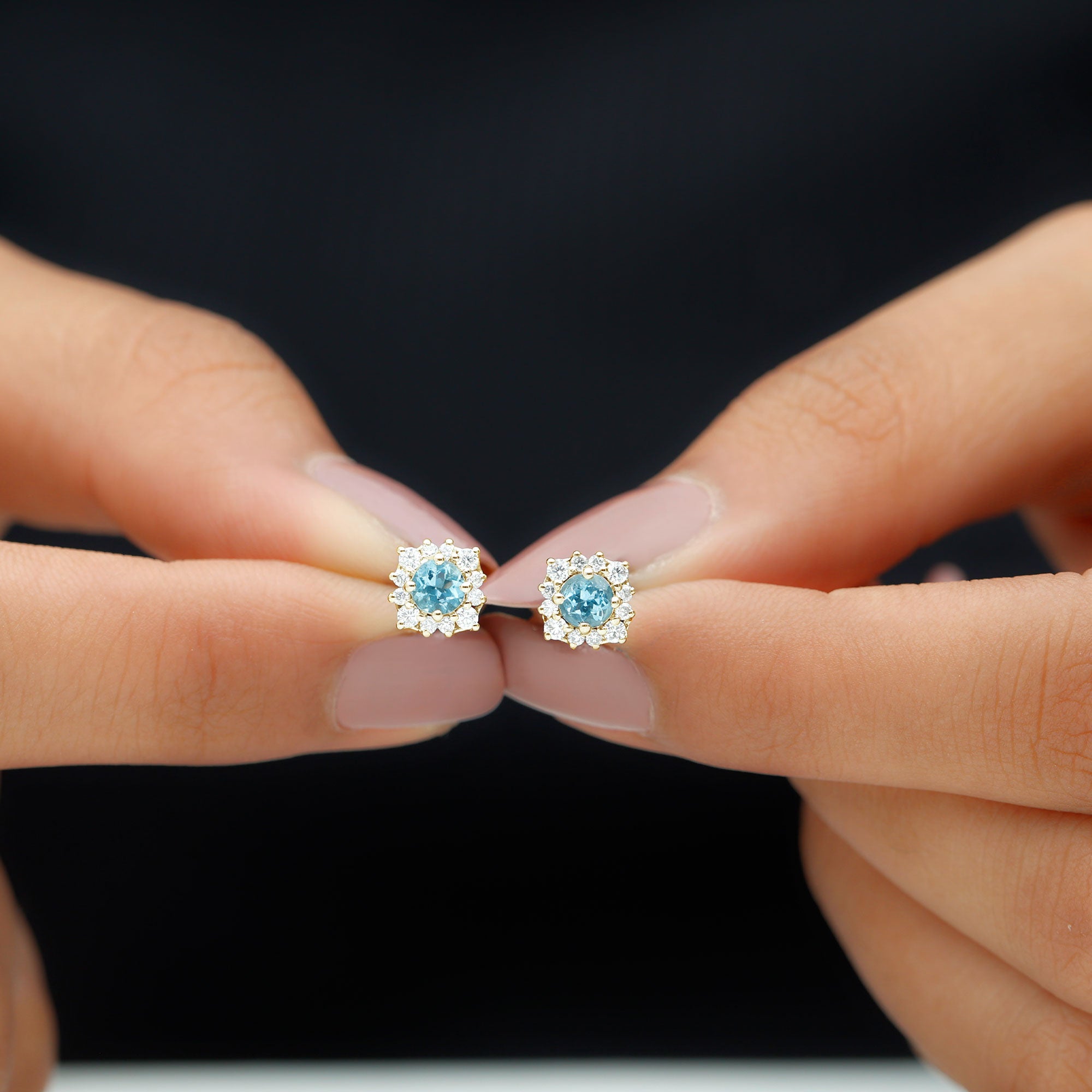 Look as stunning as ever while flaunting this pair of Halo Stud Earrings featuring a Round Shape Aquamarine Gemstone in the center set in prong setting encircled by a Halo of sparkling Round Shape Moissanite. The Classic Stud Earrings will make you the center of attraction at all your parties.
