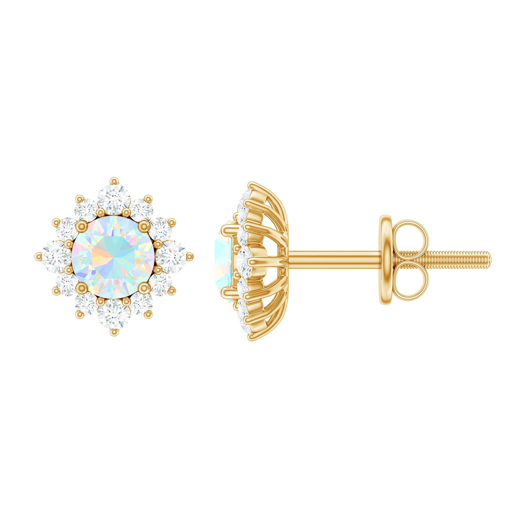 Look as stunning as ever while flaunting this pair of Halo Stud Earrings featuring a Round Shape Ethiopian Opal Gemstone in the center set in prong setting encircled by a Halo of sparkling Round Shape Diamond. The Classic Stud Earrings beautifully crafted in Solid Gold will make you the center of attraction at all your parties.
