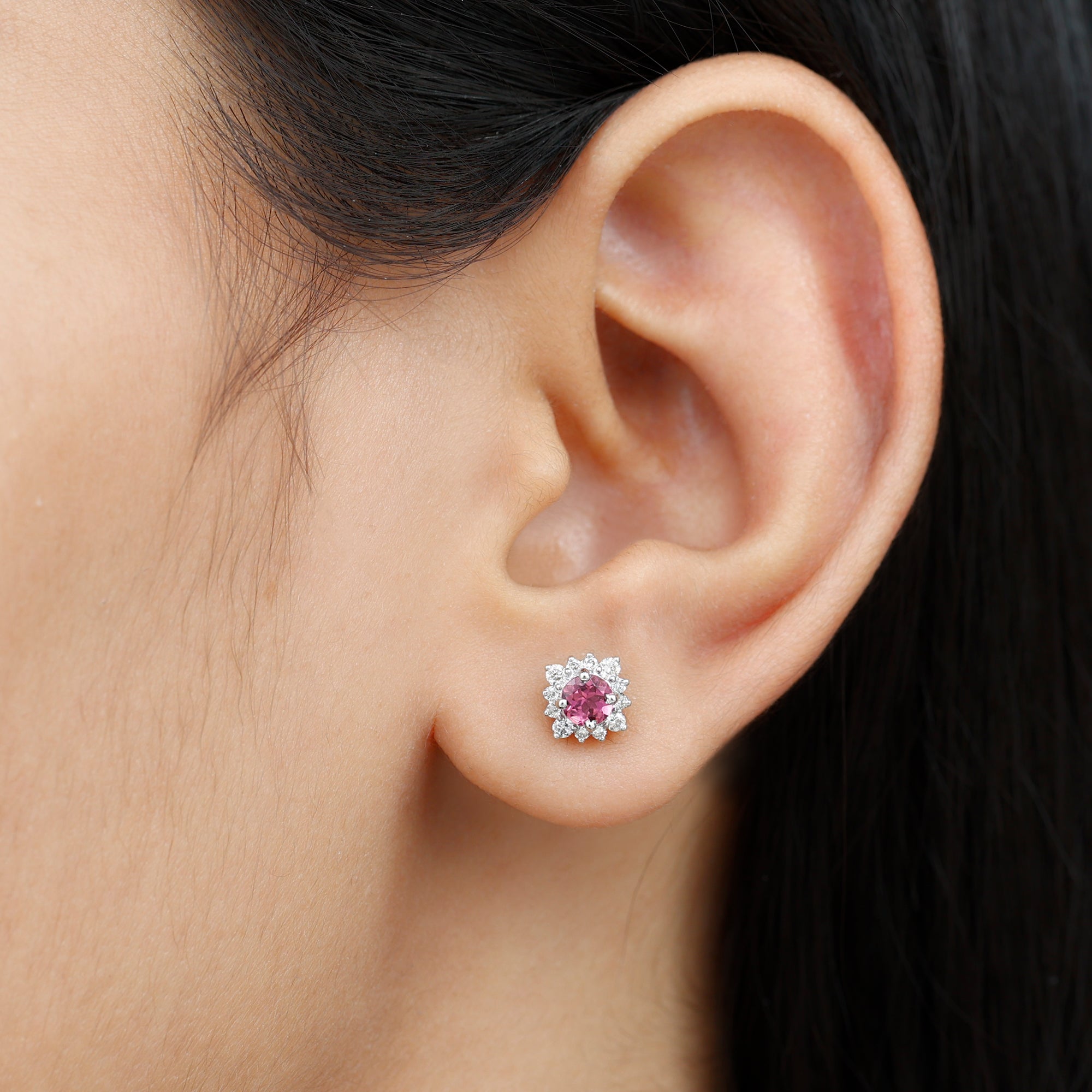 Look as stunning as ever while flaunting this pair of Halo Stud Earrings featuring a Round Shape Pink Tourmaline Gemstone in the center set in prong setting encircled by a Halo of sparkling Round Shape Diamond. The Classic Stud Earrings beautifully crafted in Solid Gold will make you the center of attraction at all your parties.