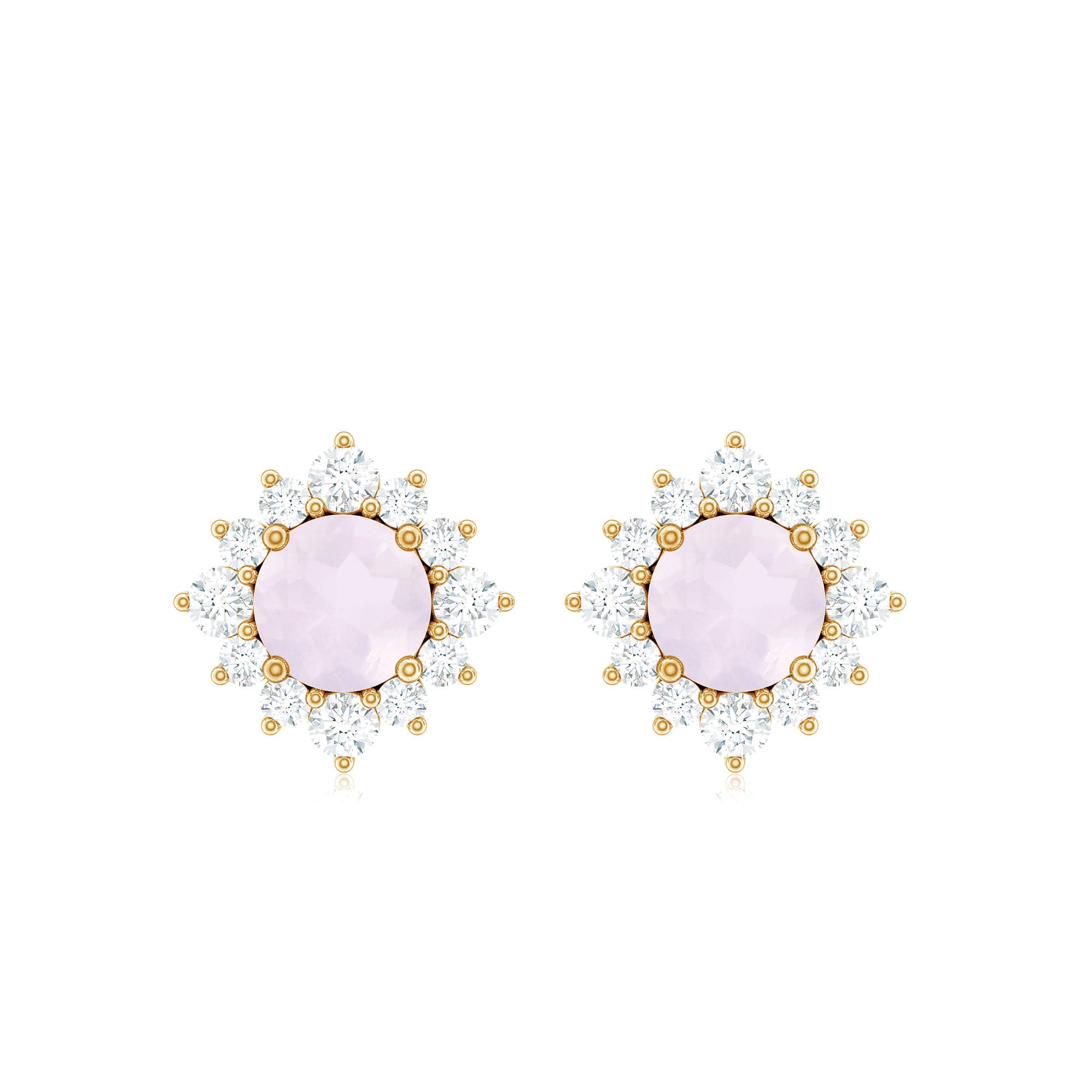 Look as stunning as ever while flaunting this pair of Halo Stud Earrings featuring a Round Shape Rose Quartz Gemstone in the center set in prong setting encircled by a Halo of sparkling Round Shape Diamond. The Classic Stud Earrings beautifully crafted in Solid Gold will make you the center of attraction at all your parties.