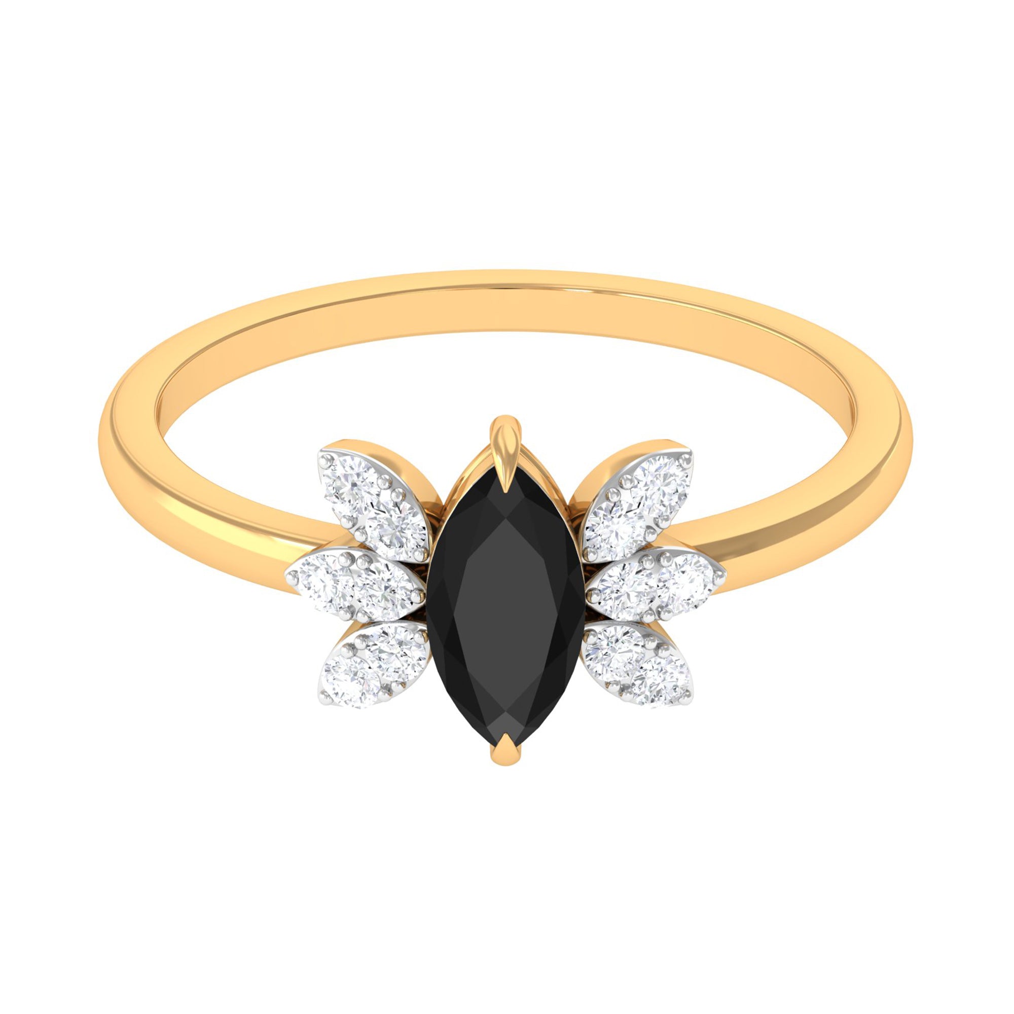 Featuring an elegant Black Spinel Ring adorned with marquise cut solitaire Black Spinel set at the center of the ring in claw setting with and Round Shape Diamond set in gold marquise shape on both side of the center stone creates an appealing look. This Black Spinel Solitaire Ring is crafted in Gold for an eye catching and appealing look.