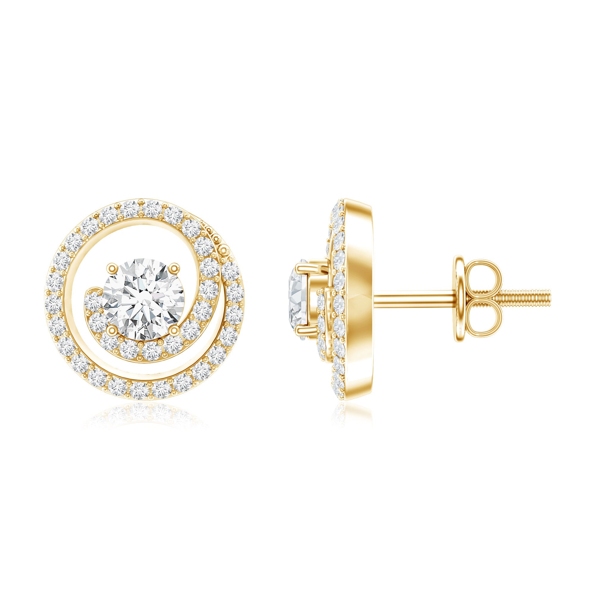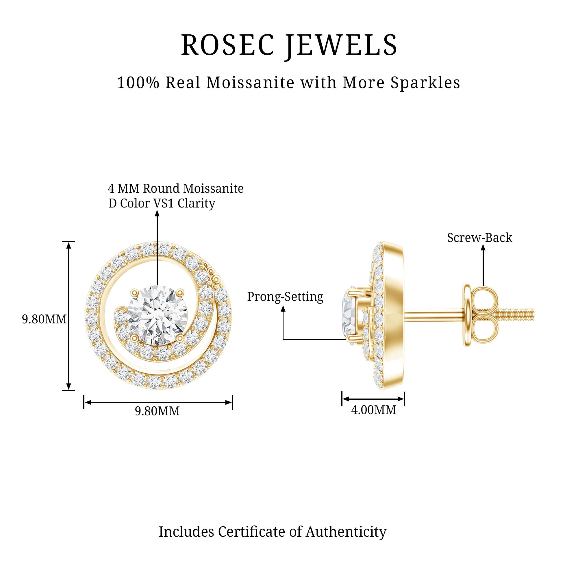 Designed for your everyday style, the Swirl Stud Earrings is adorned with Round Cut Certified Moissanite in Prong Setting. These Moissanite Stud Earrings will be a charming piece for a woman to wear. These Contemporary Earrings are composed in Solid Gold and comes with screw back.