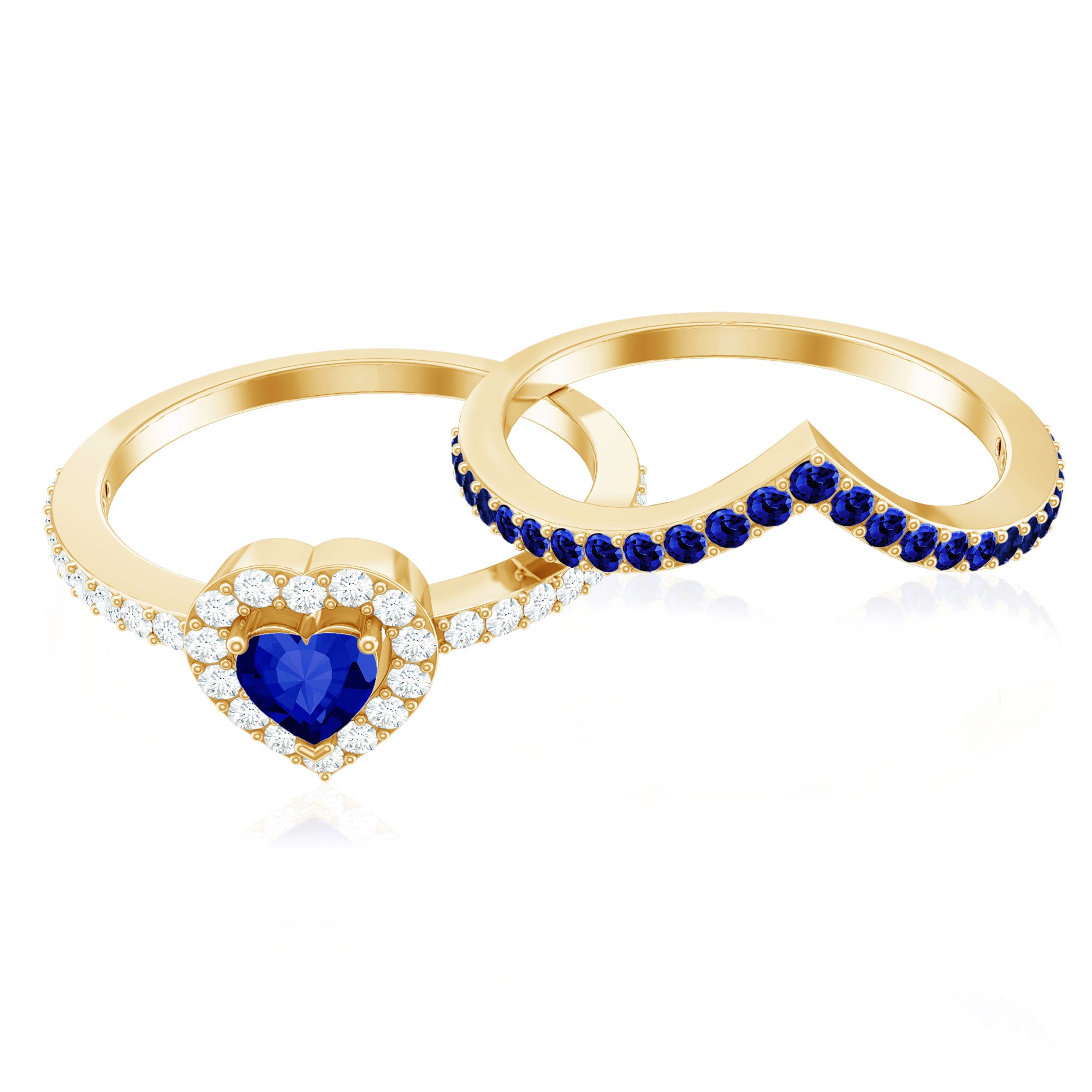 Celebrate your special day in style with this exquisite Wedding Ring Set made from Solid Gold. The heart ring set includes a stunning Heart Bridal Ring, adorned with a heart-shaped created Blue Sapphire and Diamond accent, as well as a matching created Blue Sapphire Chevron Wedding Band.