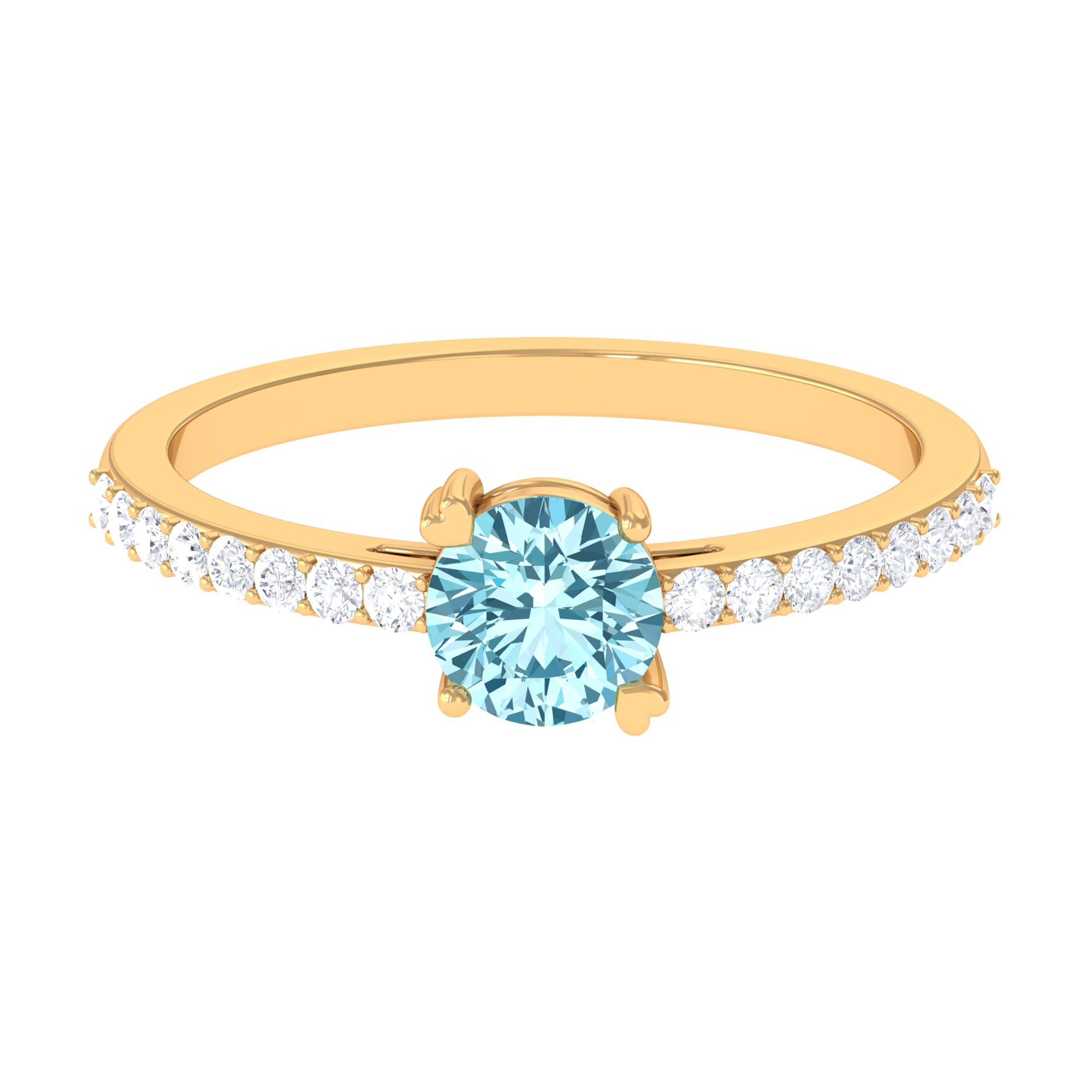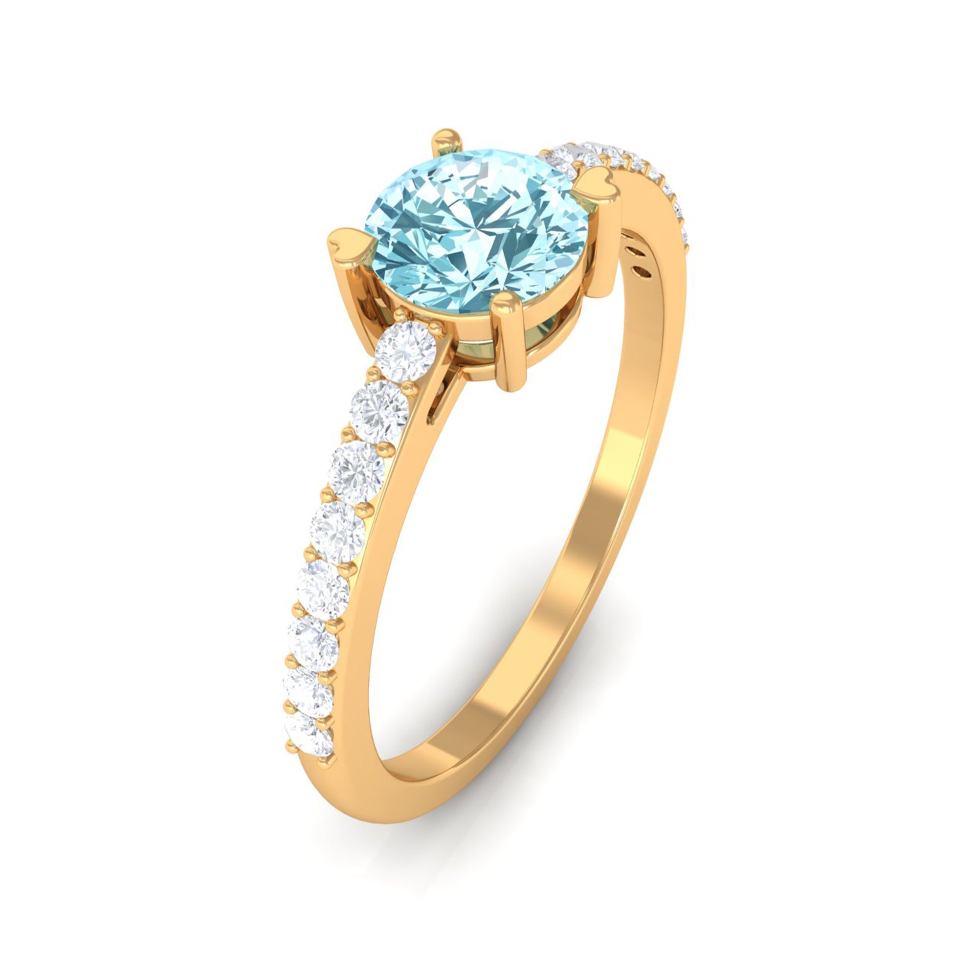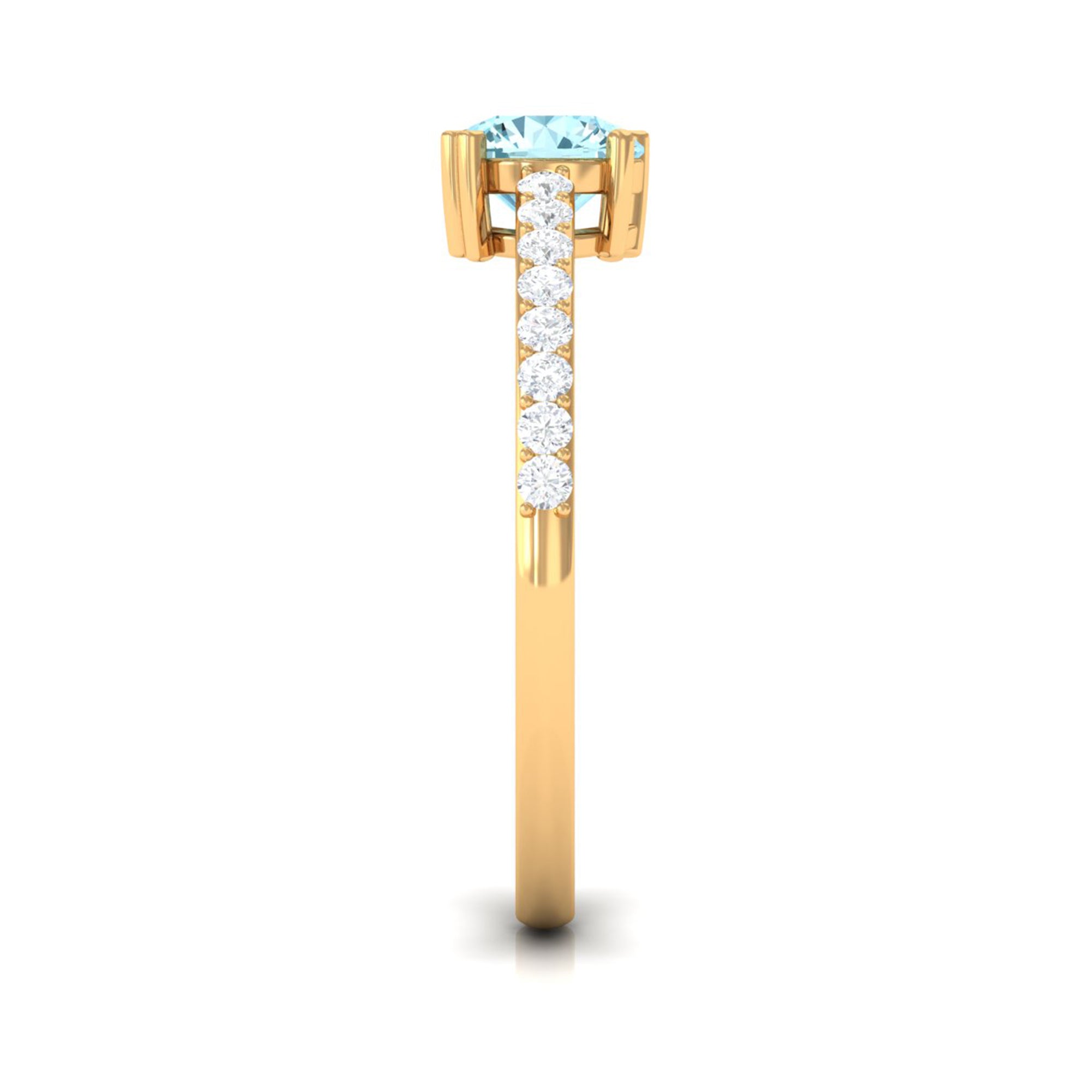 Flaunt her style with this lovely and amazing Solitaire Promise Ring as a birthday gift. This Promise Ring for Women is beautifully crafted with Round Shape Aquamarine as a solitaire in a designer setting with Round Diamond in a Side Stones. This March Birthstone Ring is mounted in gold metal.