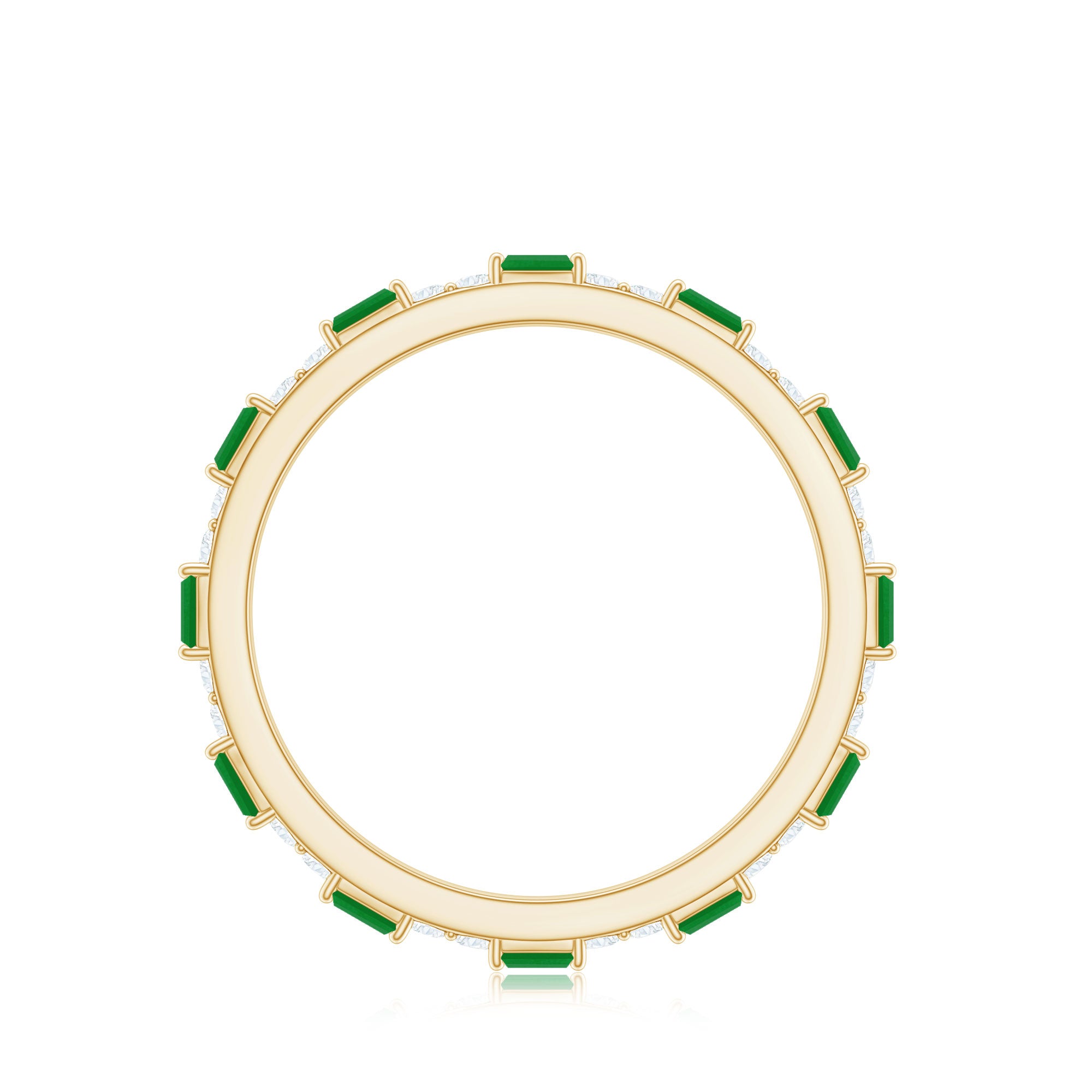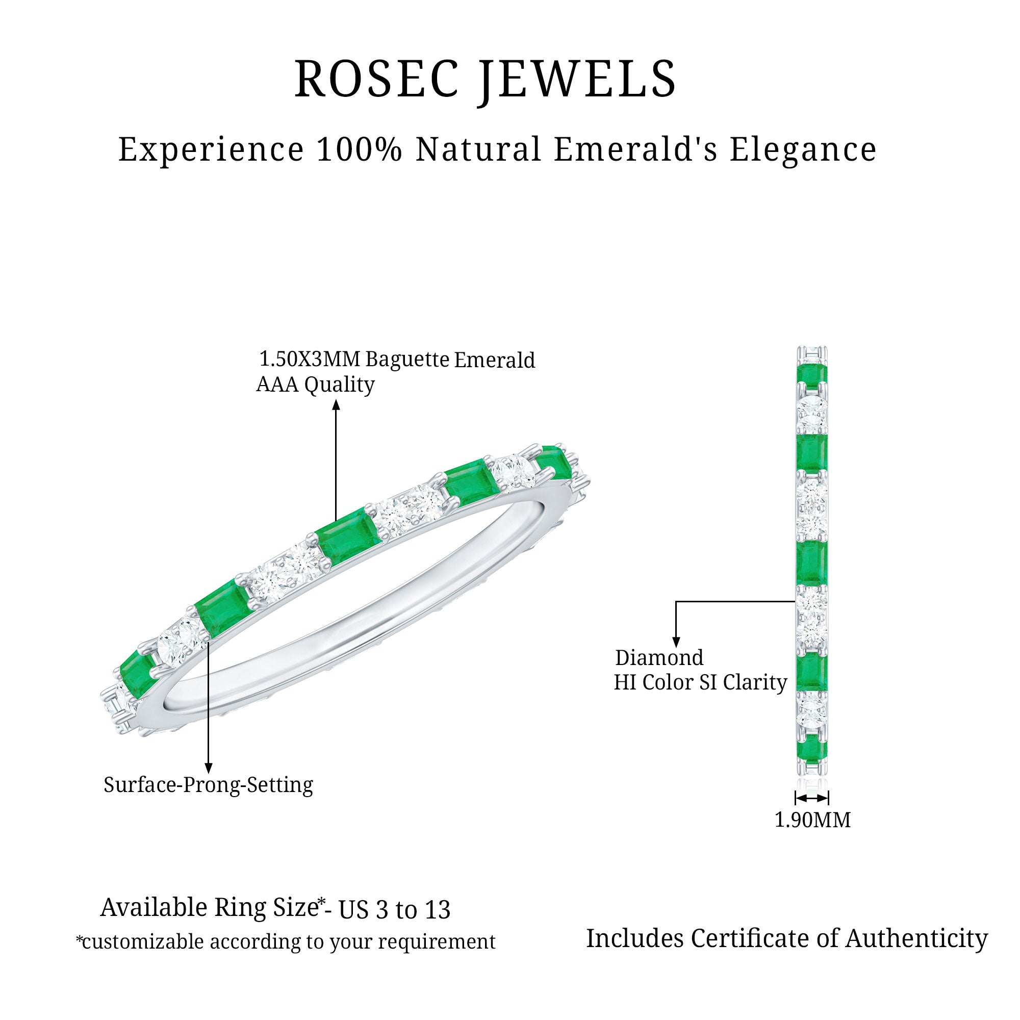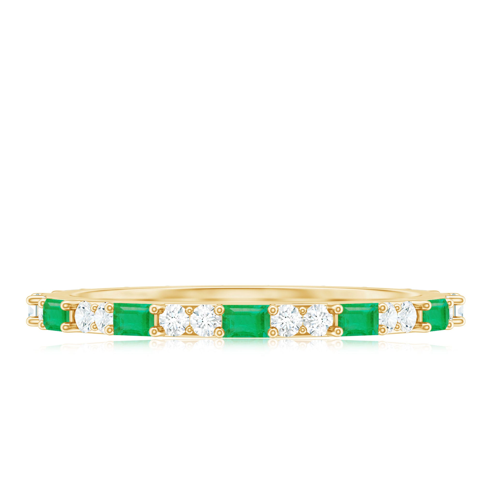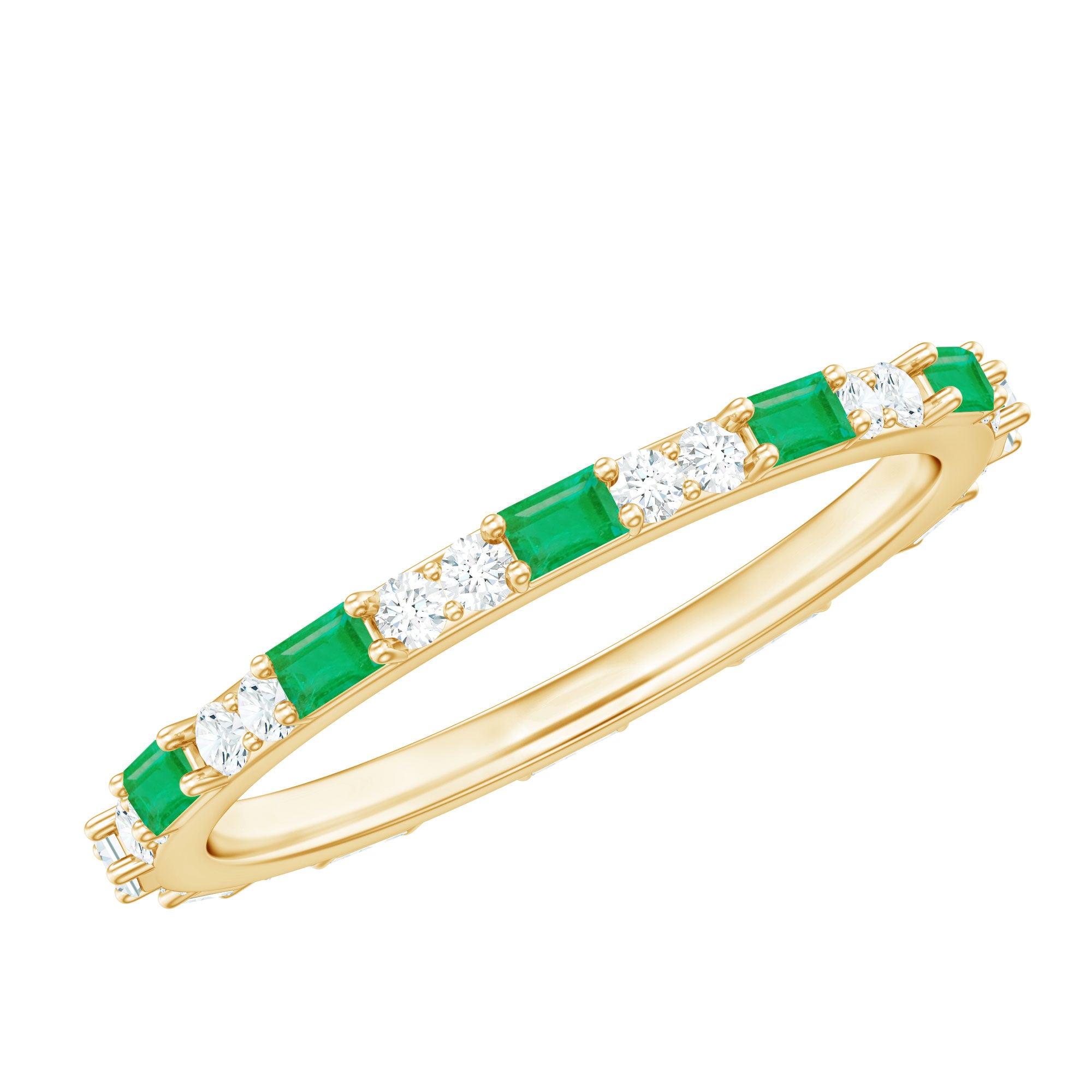 Radiate elegance with every glance, wearing this stunning Emerald Eternity Ring, a modern symbol of everlasting love and sophistication. Designed in a striking East West style, this masterpiece features an alternating pattern of horizontally placed Baguette Shape Emerald and sparkling Round Diamond stones, creating a rhythm of light and color that dances beautifully across the band. AAA Quality Emerald and HI-SI Diamond stones together form the perfect harmony of nature and luxury. Whether worn alone as a statement of devotion or stacked with other favorites for a chic layered look, this Emerald Diamond Ring captures both versatility and allure. Crafted with perfection, this Emerald Stackable Ring embodies the idea of love that never ends. Perfect for anniversaries, milestones or any special moment, this Baguette Eternity Ring arrives in a beautifully designed jewelry box and is available in various ring sizes for an ideal fit. A circle of brilliance that will sparkle with every chapter of your love story.