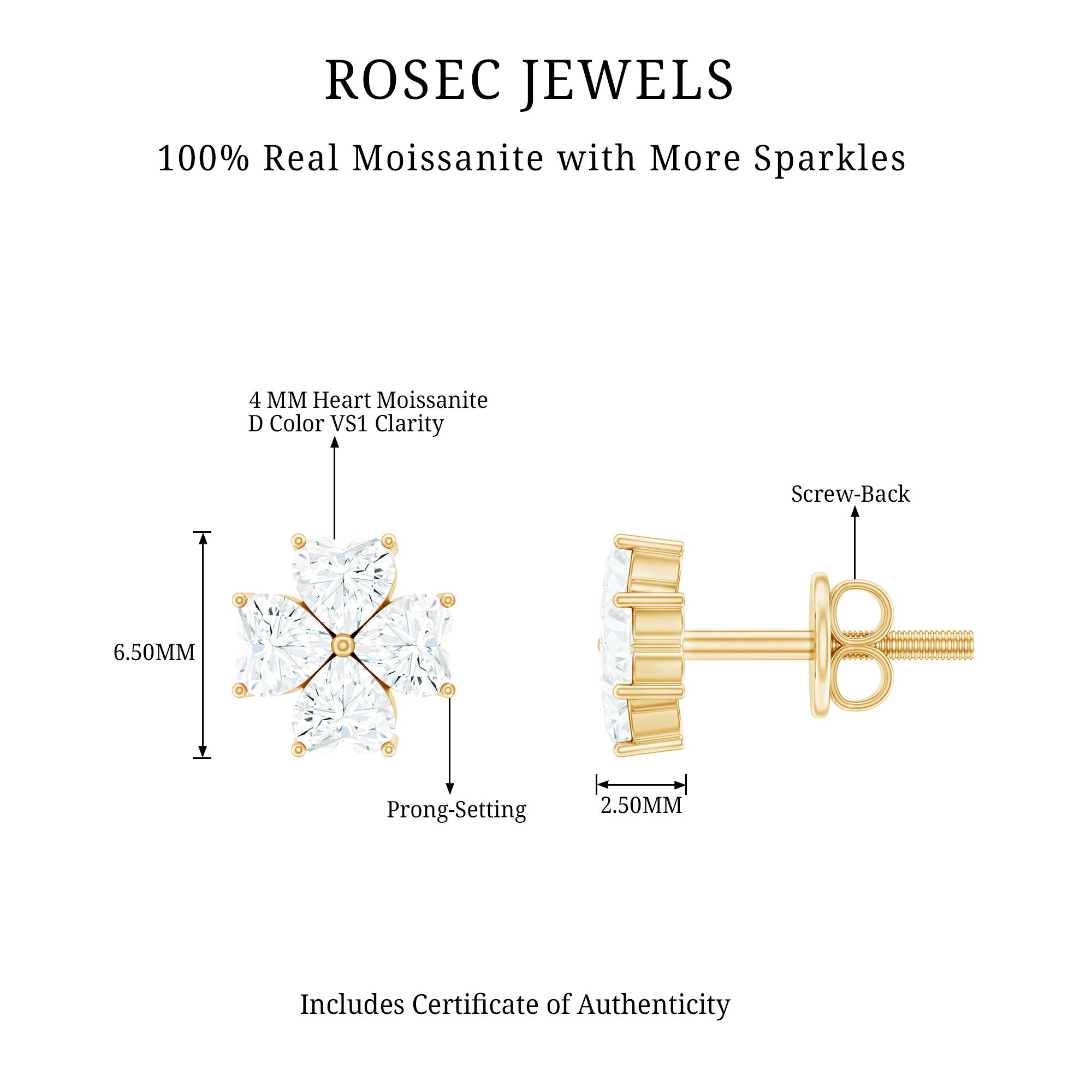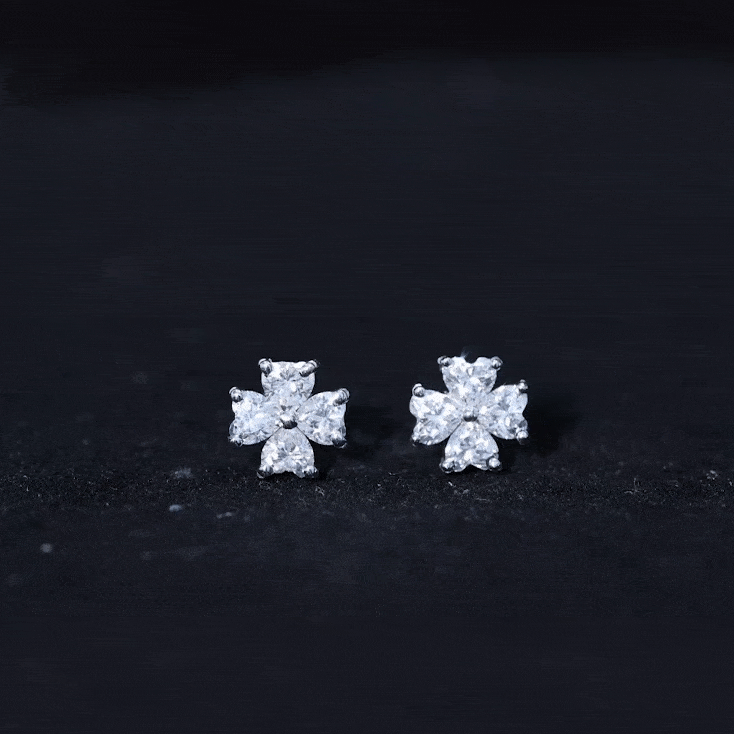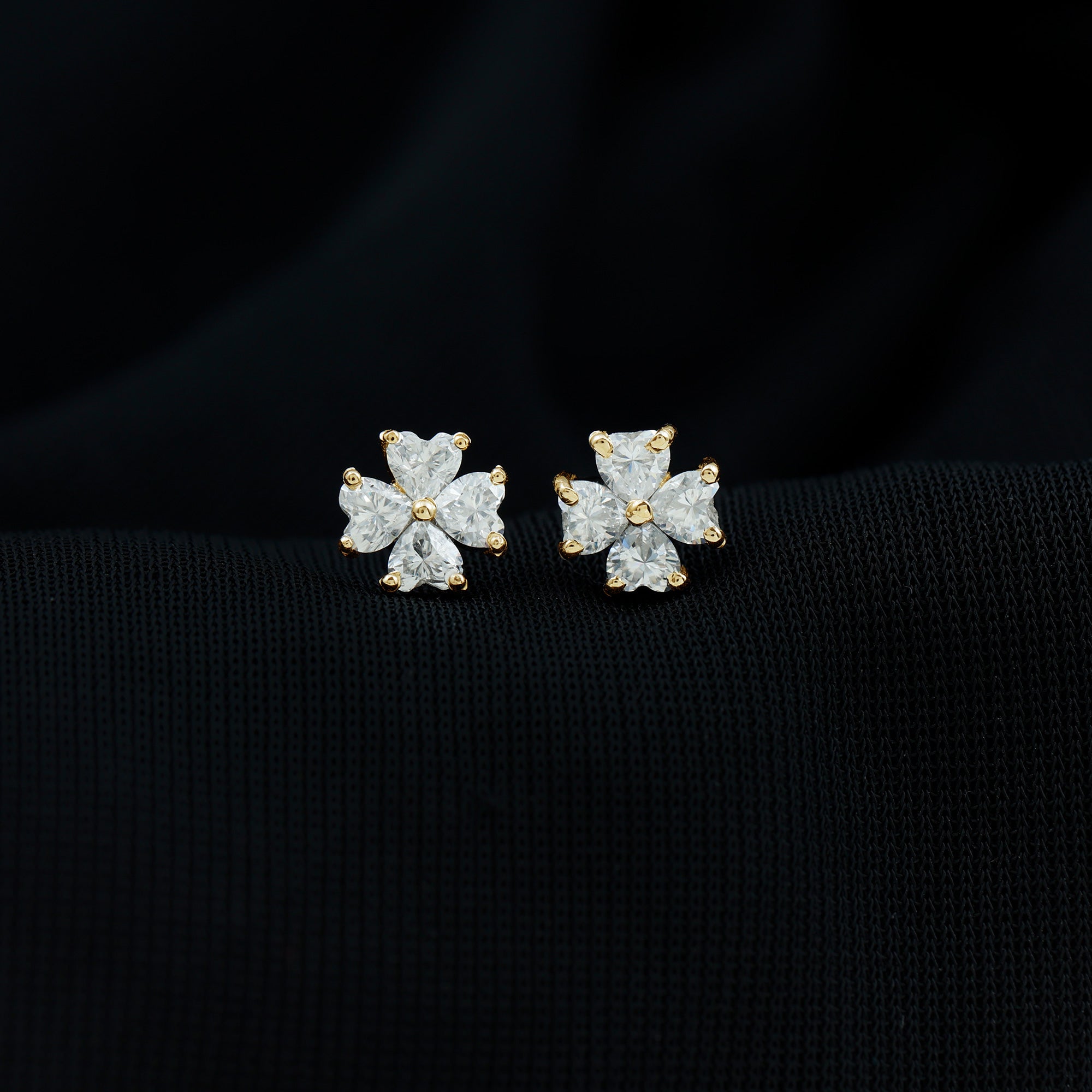 Uniquely crafted floral stud earrings with four heart-shaped moissanites in prong settings. Classic, trendy, and effortlessly radiant.