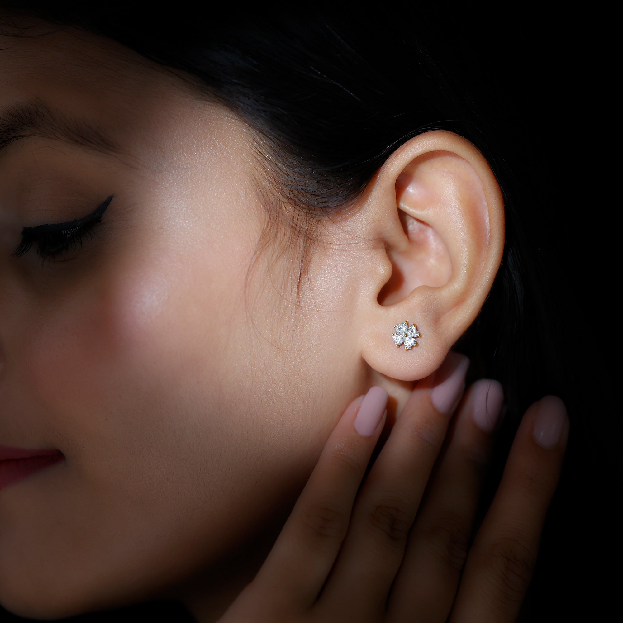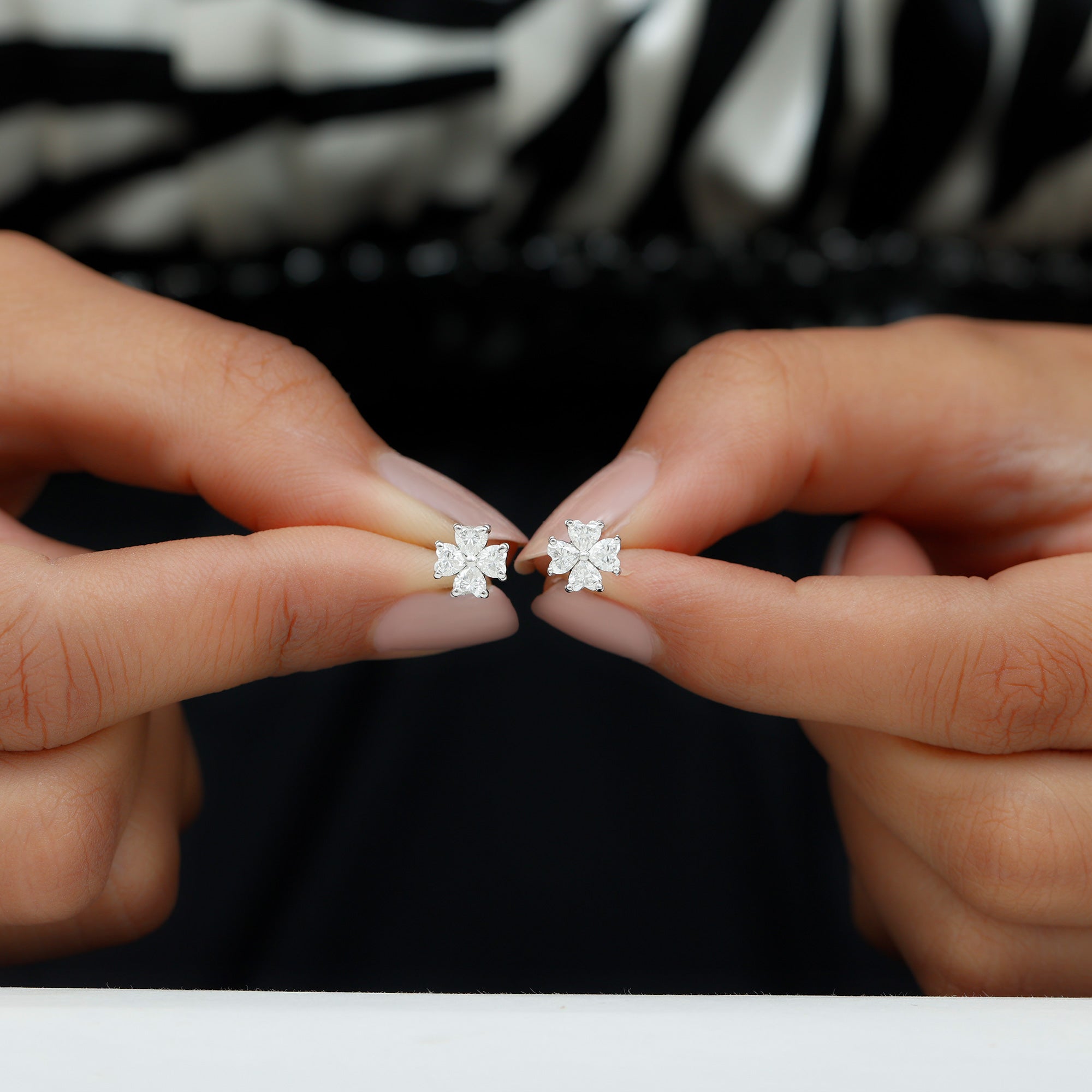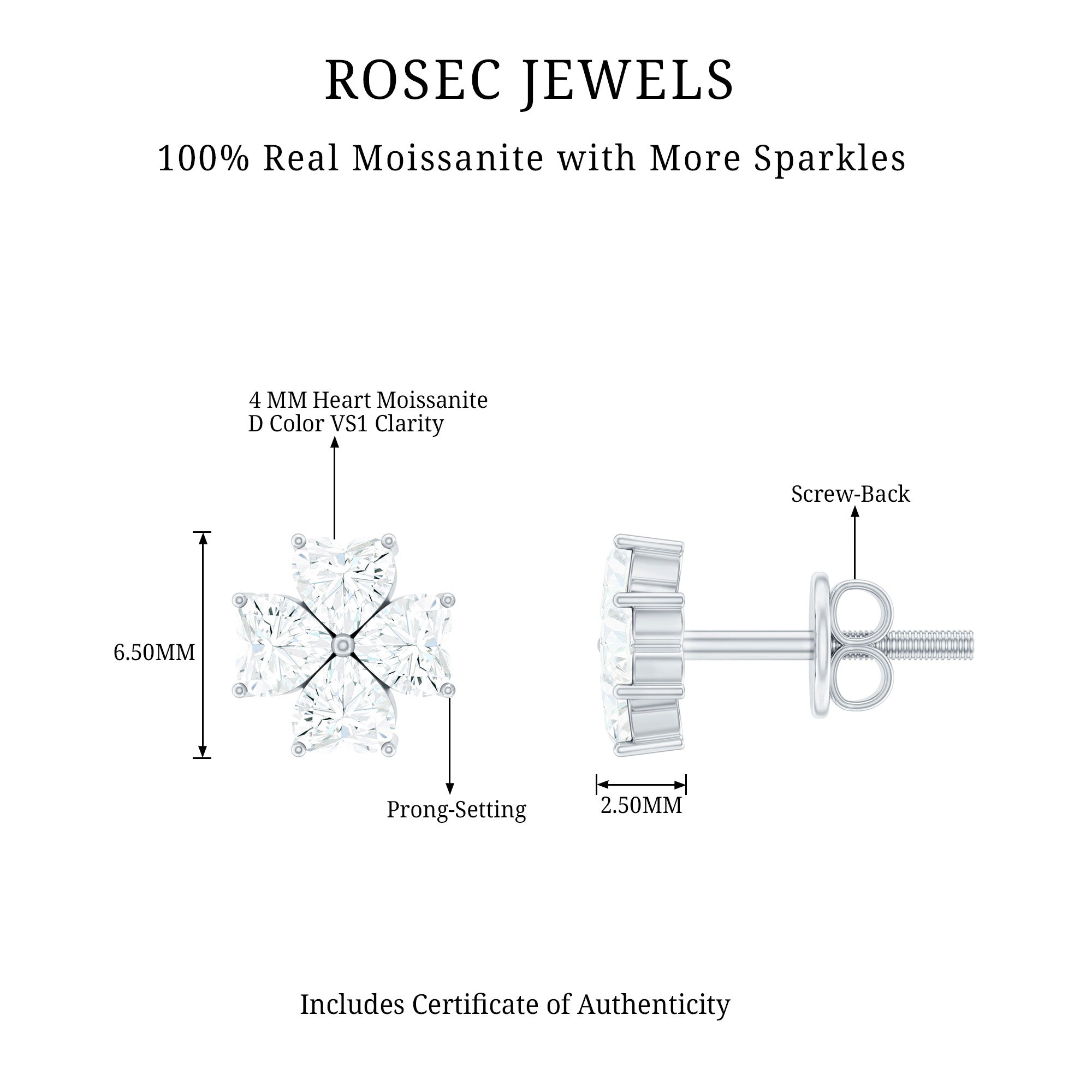 Uniquely crafted floral stud earrings with four heart-shaped moissanites in prong settings. Classic, trendy, and effortlessly radiant.