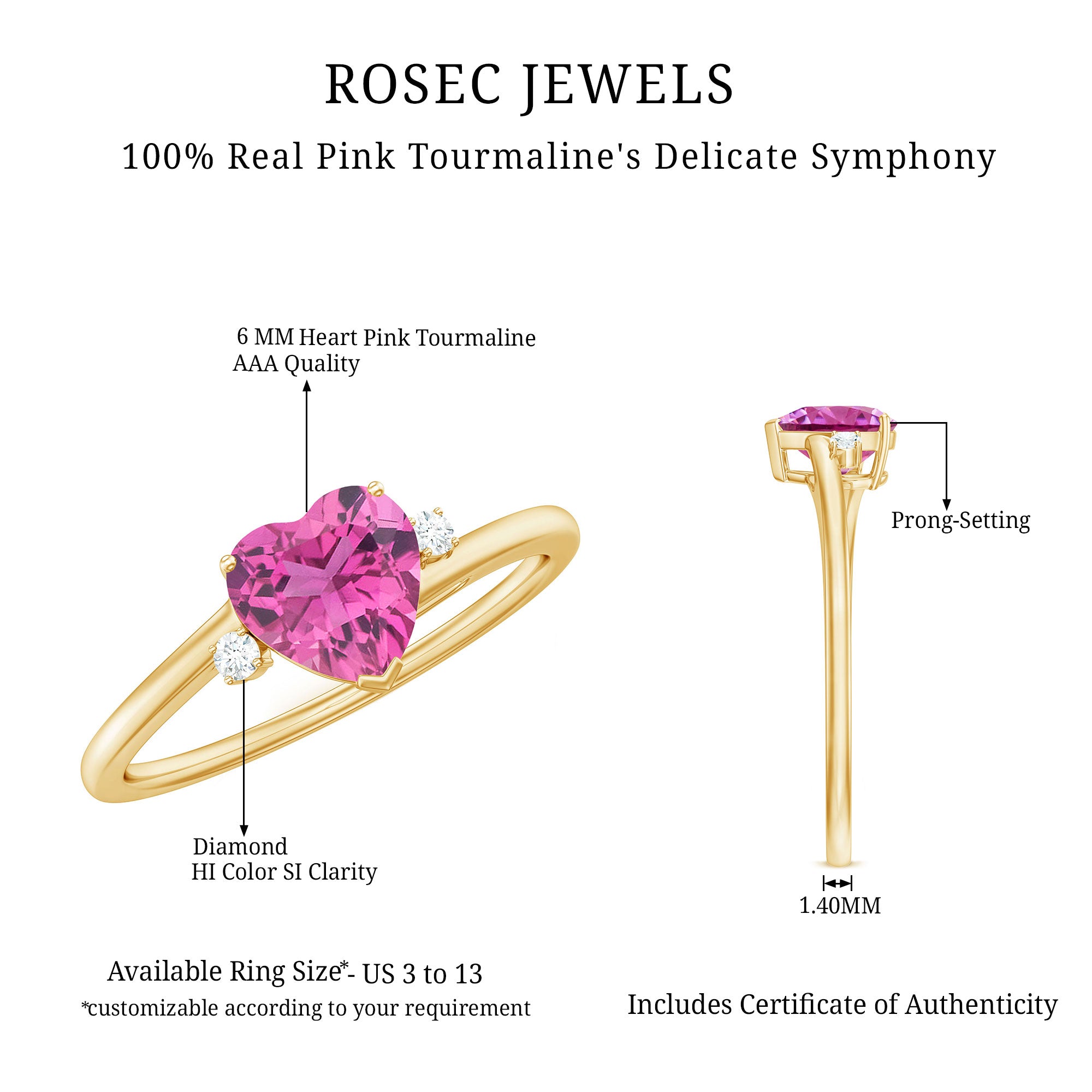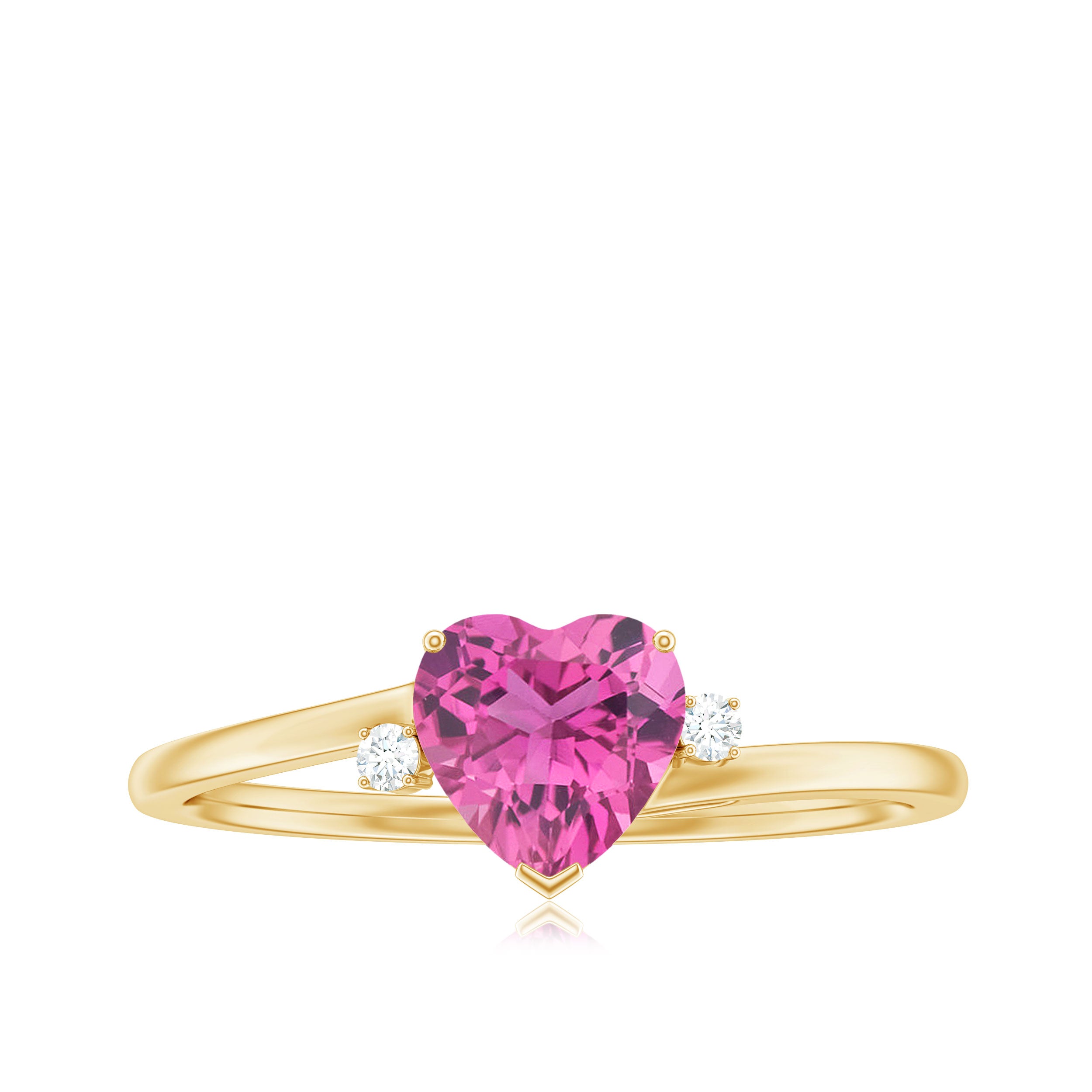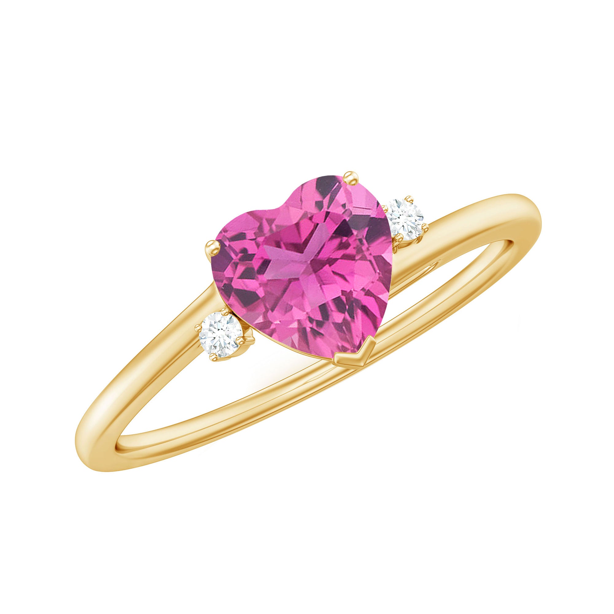 This exquisite promise ring features a heart shaped pink tourmaline gemstone set in prong setting, accented by sparkling Diamond on both sides. The heart shape of the stone symbolizes love and devotion, making it a perfect choice for a promise ring. The Diamond adds an extra touch of glamour and sophistication to the design, creating a stunning piece of jewelry that is sure to be treasured for years to come.