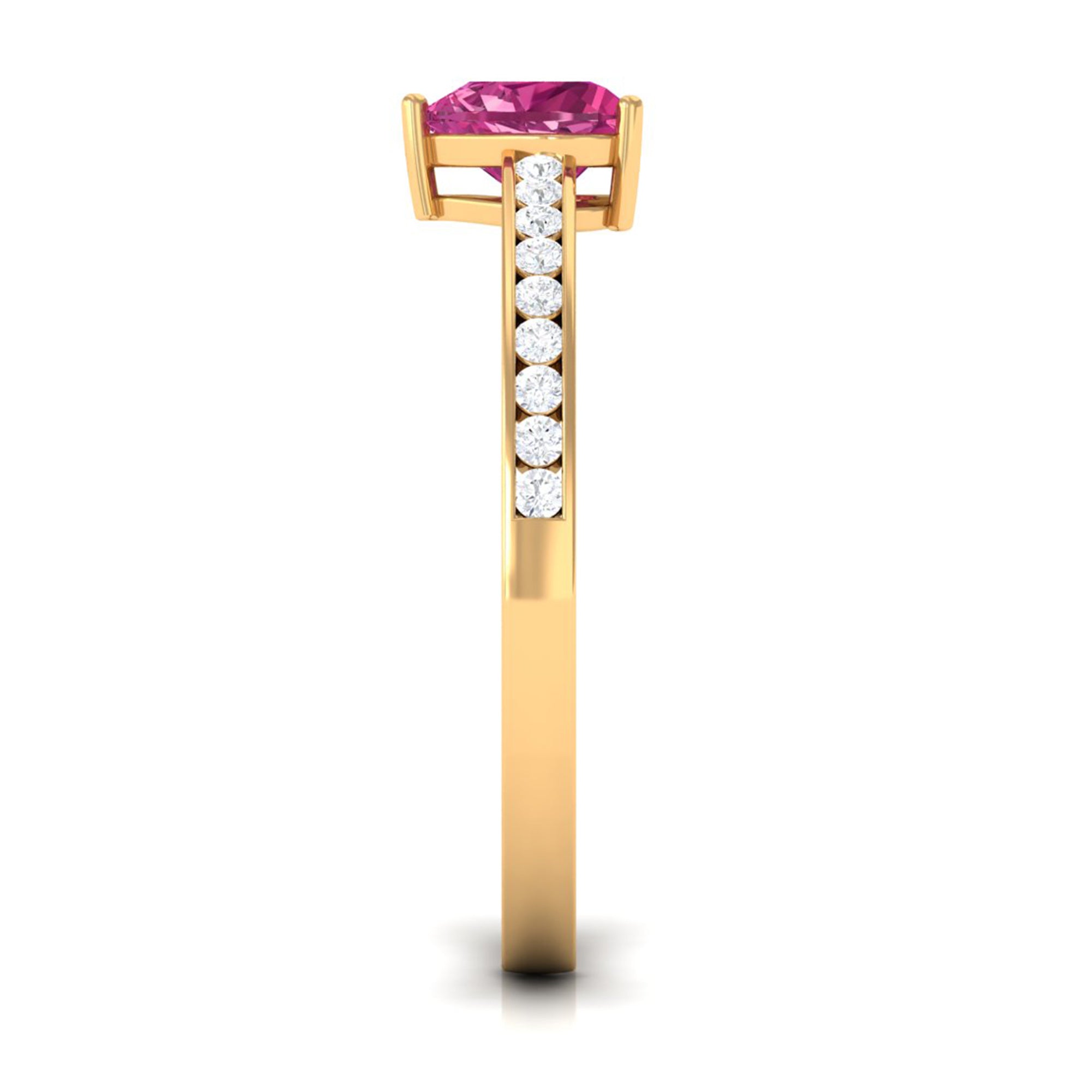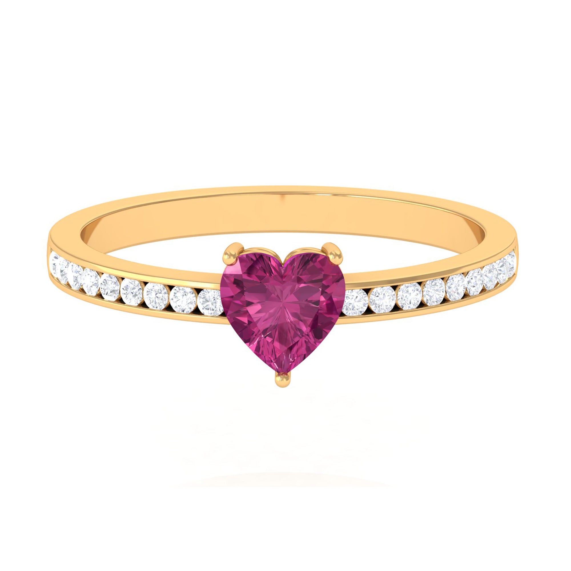 This stylish Solitaire Ring features a Heart-shaped Pink Tourmaline as its centerpiece, set in a 3-prong setting. Accented by round Diamond stones in a channel setting, its made of gold for lasting beauty.