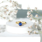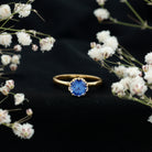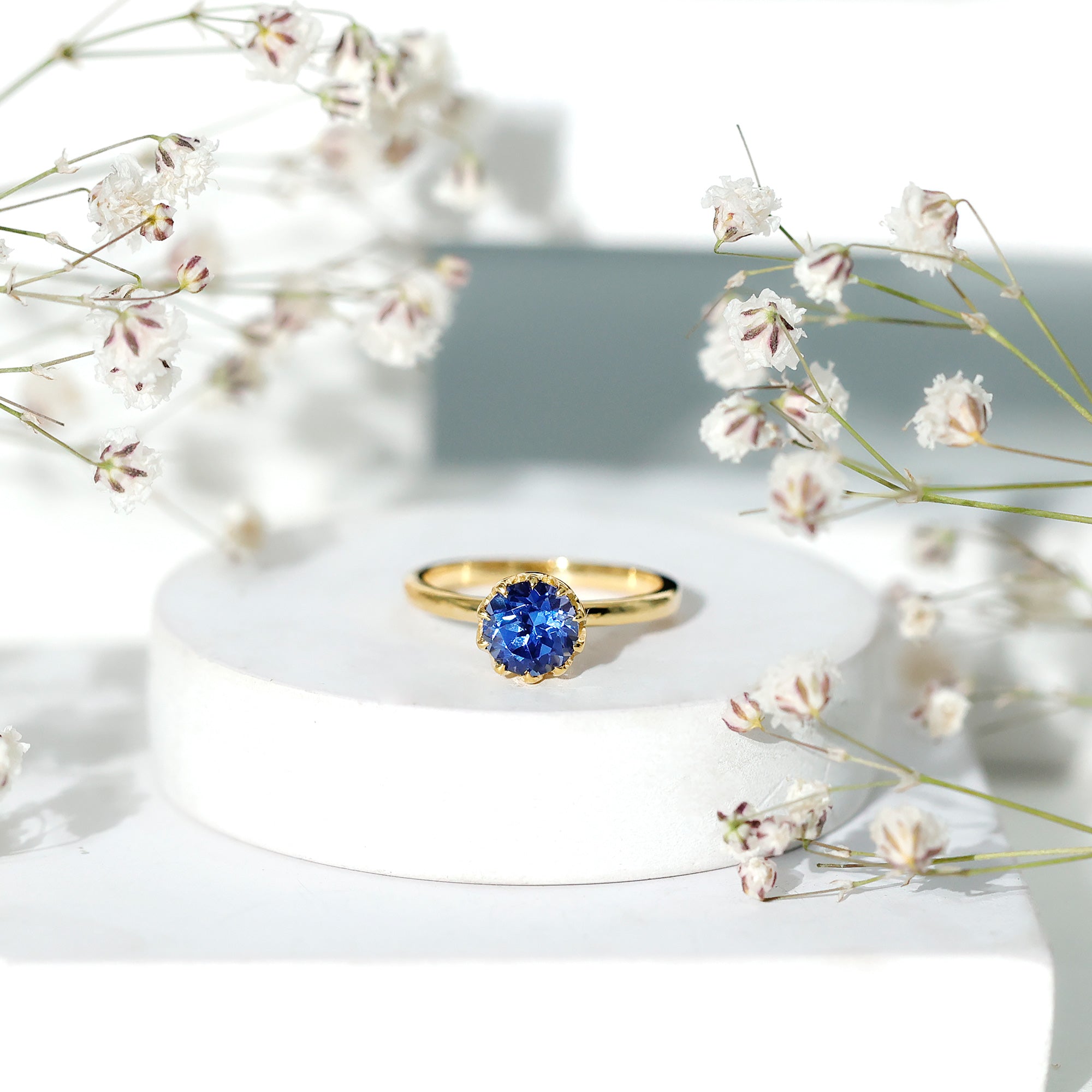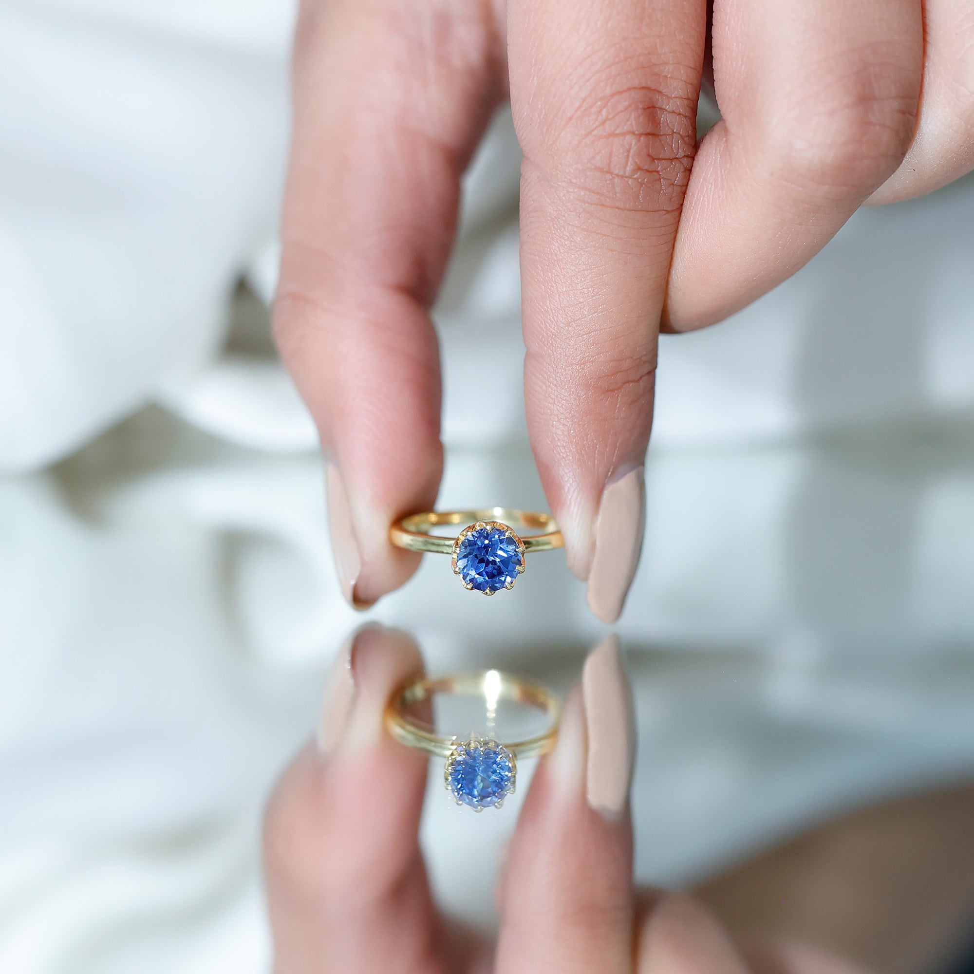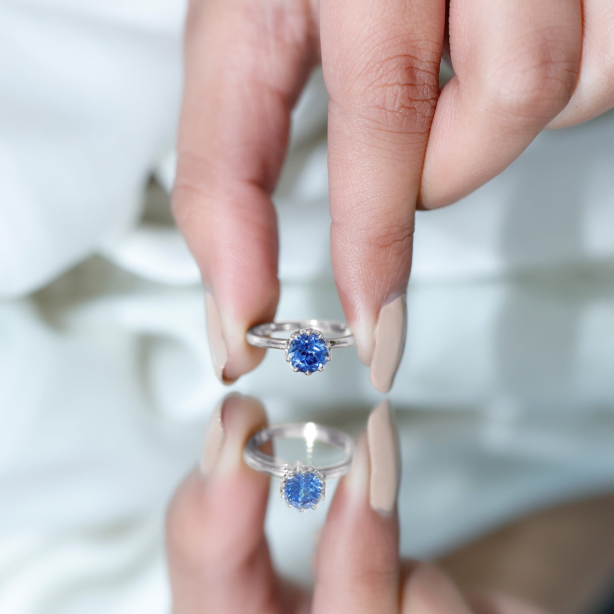 Indulge in the stunning rich blue color of this Lab-Created Blue Sapphire Solitaire Ring. With its minimalist lotus basket setting, this ring is beautifully adorned with a 6 MM round-cut lab-created blue sapphire, exuding classic elegance with its simplicity.