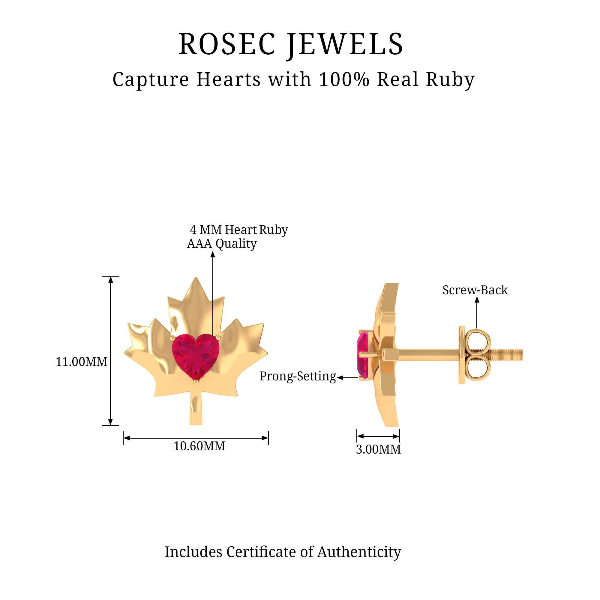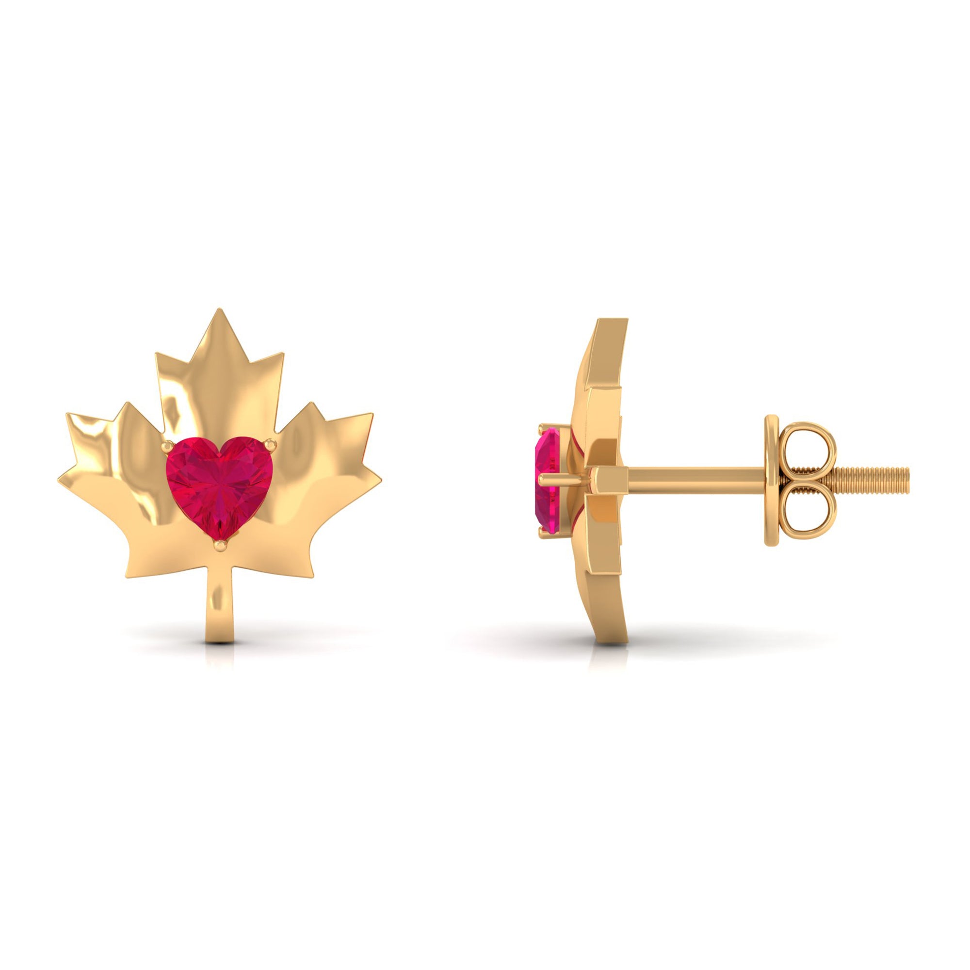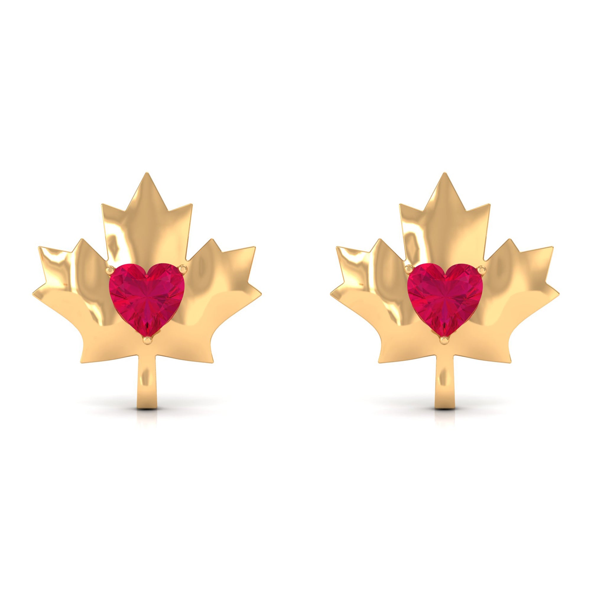 1 CT Maple Leaf Stud Earrings with Heart Shaped Ruby